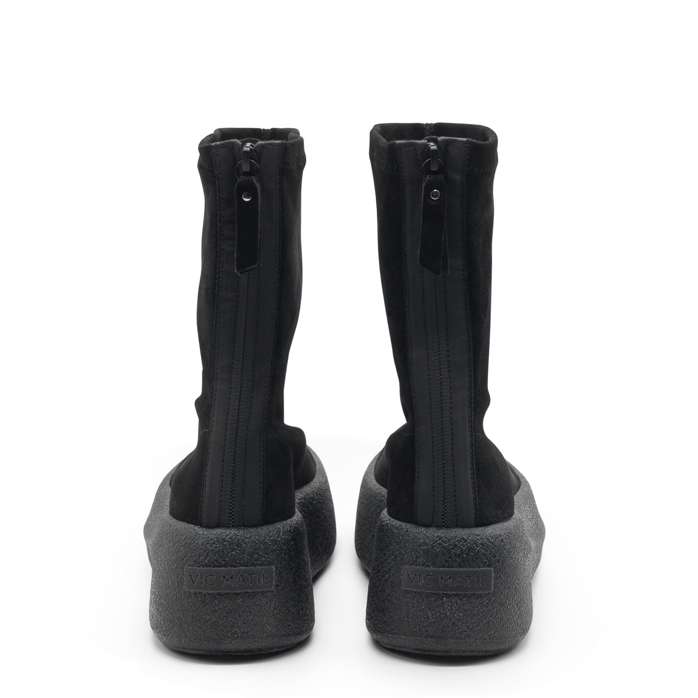 Creepy black stretch split leather half boots, sleek and tight-fitting, thanks to the soft stretch material. They feature a rubber and pearly back zip for easier fit, with leather zip puller. This model is fitted with a slightly protruding crepe platform and a soft footbed covered in leather. Made in Italy.