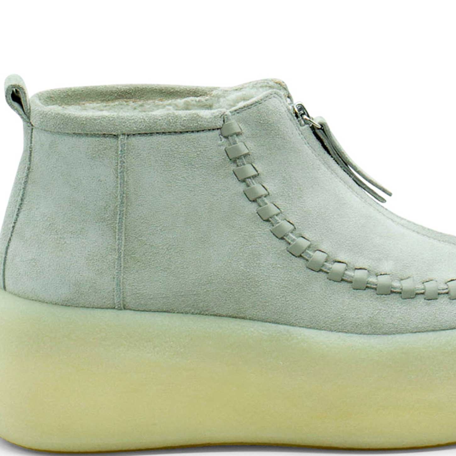 Creepy bone ankle boots, crafted from split calfskin, with synthetic sheepskin lining, front zip and full leather threading around the apron. This model is fitted with a slightly protruding crepe platform and a soft footbed covered in leather. Made in Italy.
