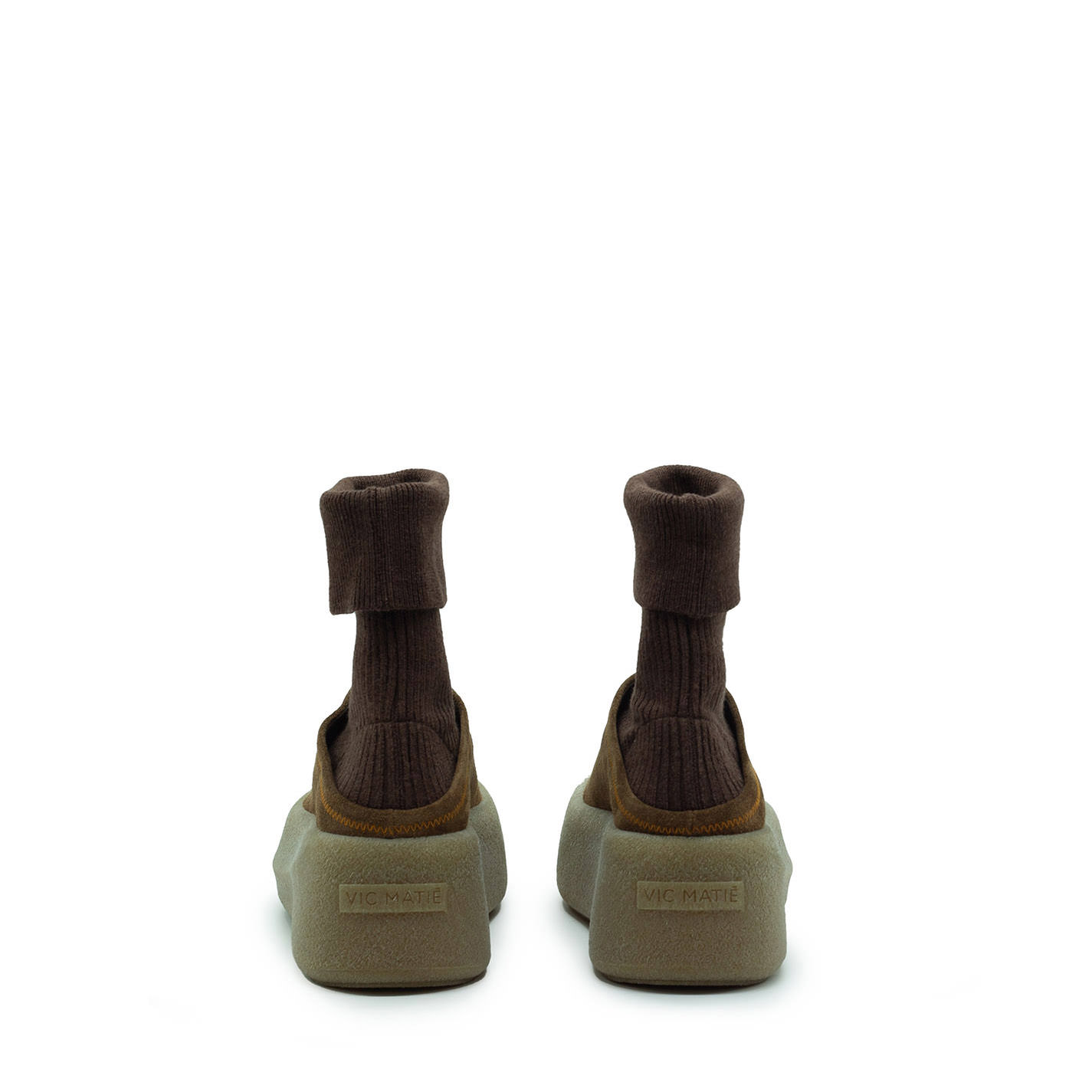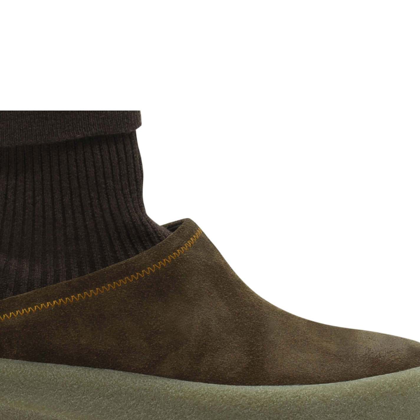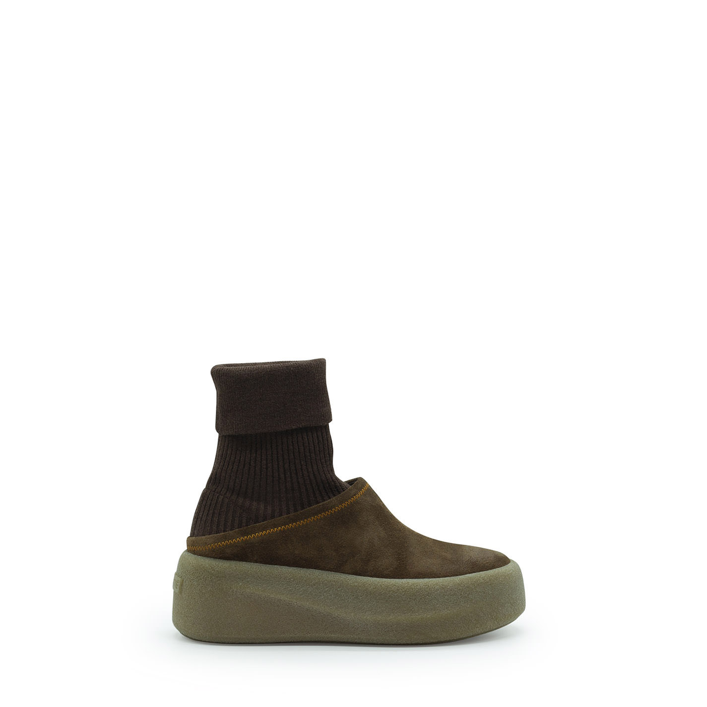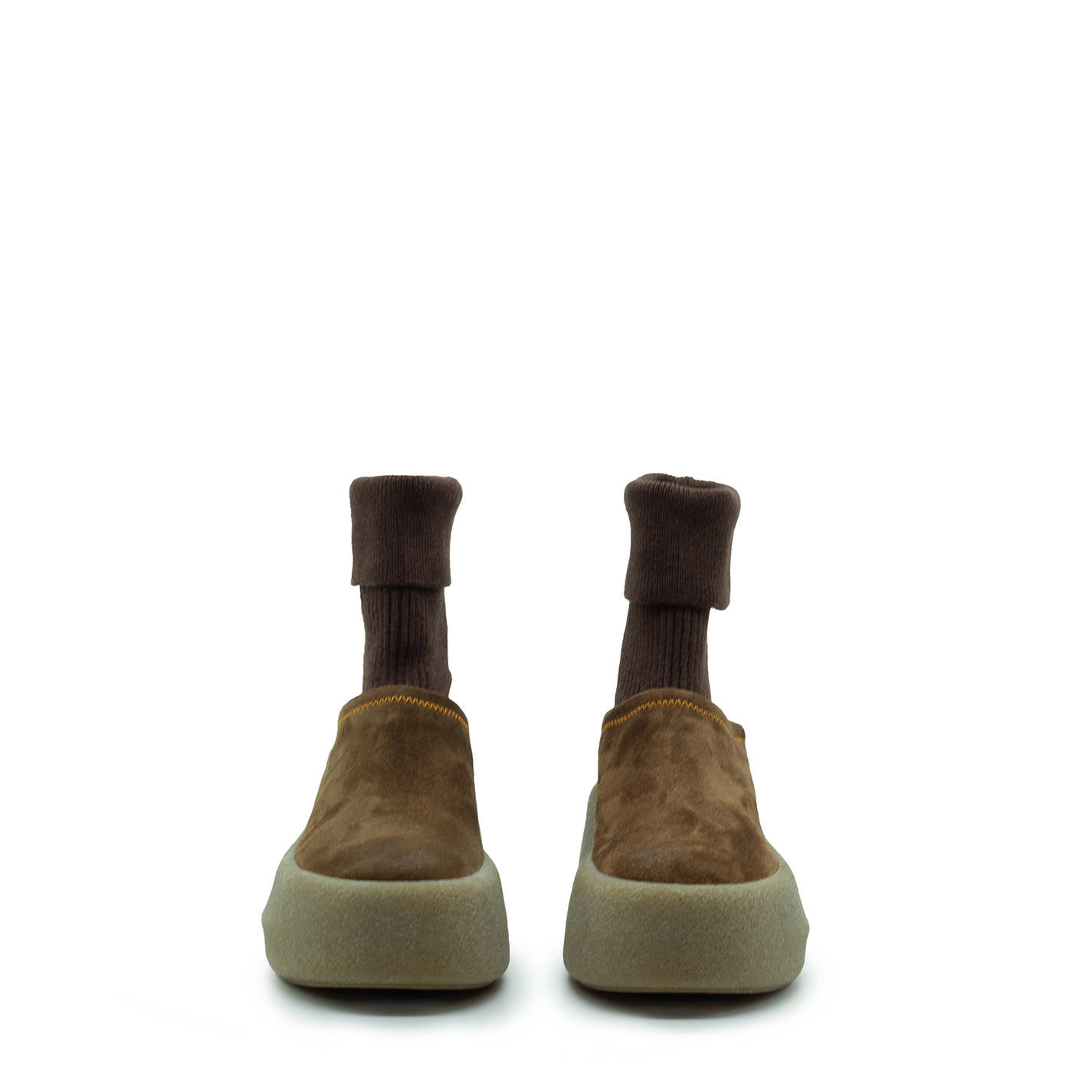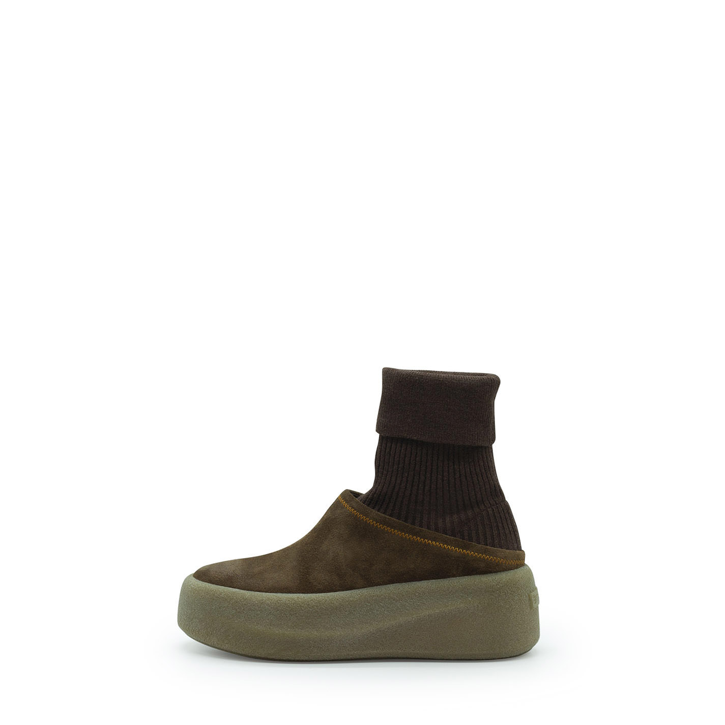 Creepy brown half boots, crafted from split calfskin, with ribbed wool blend boot leg attached to the slide and contrasting zigzag seams on the front. This model is fitted with a slightly protruding crepe platform and a soft footbed covered in leather. Made in Italy.