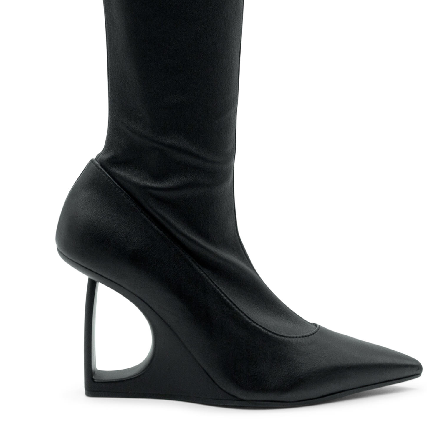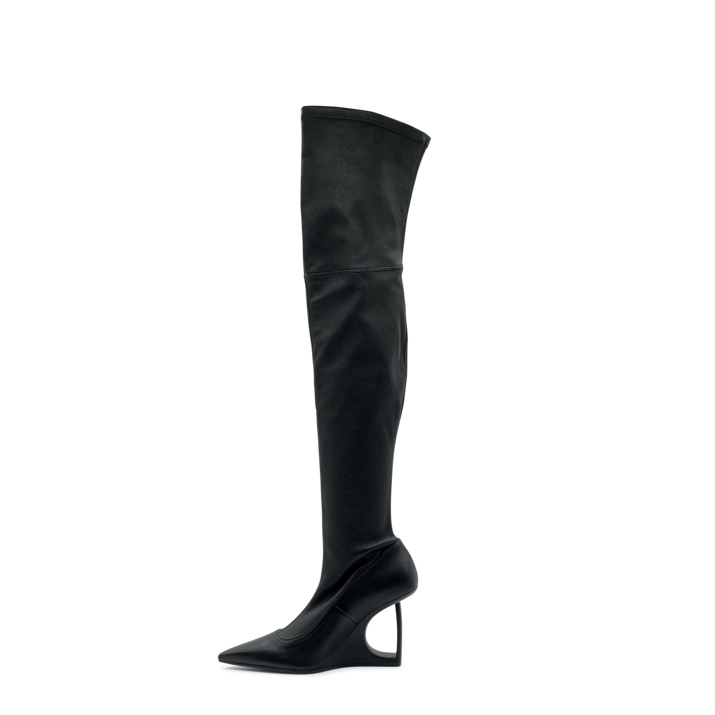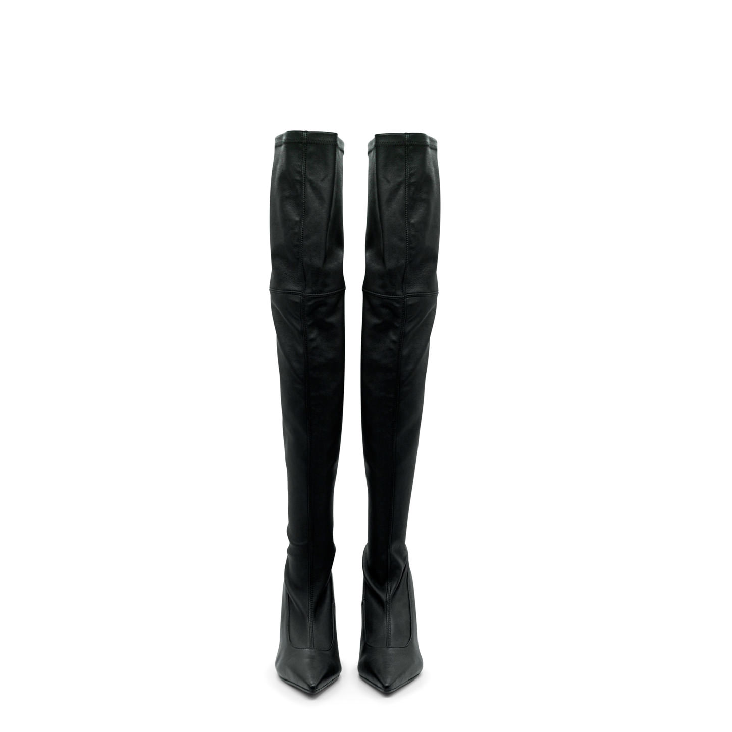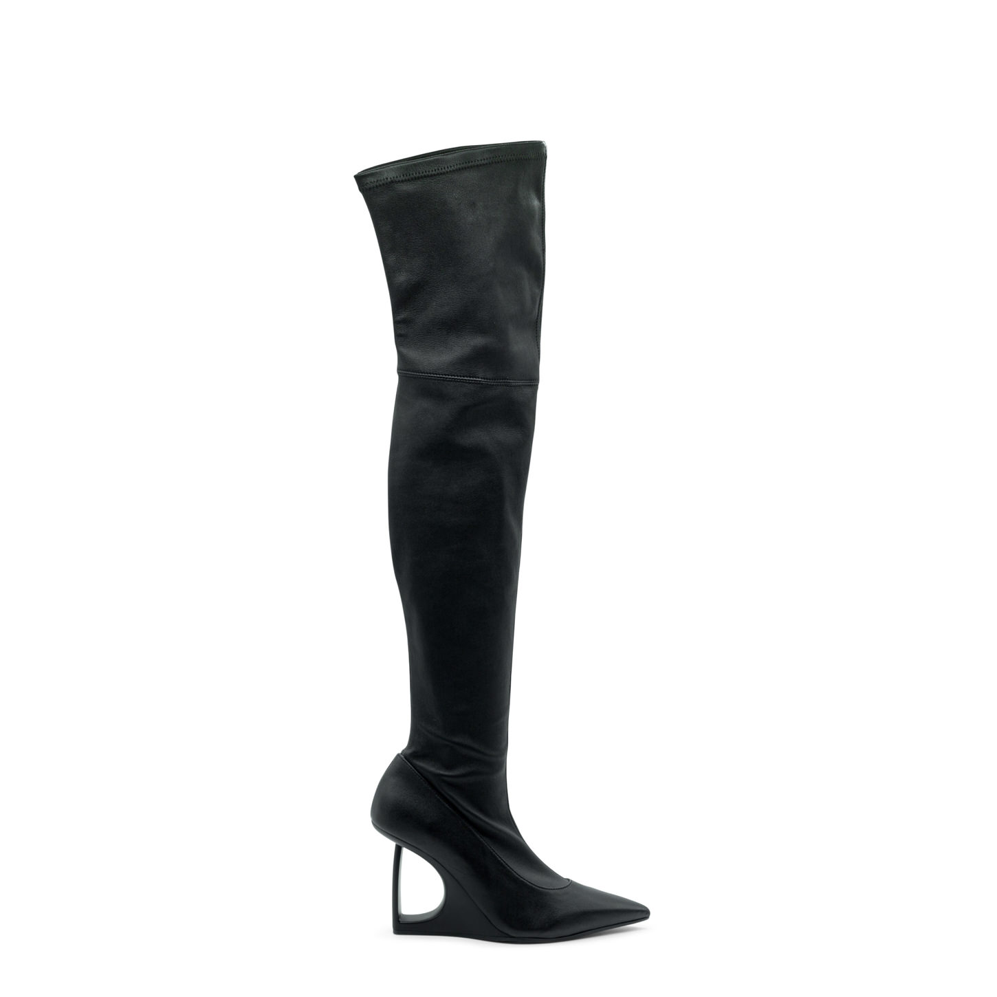 "D" black over-the-knee boots, sleek and tight-fitting, crafted from soft stretch Nappa leather. This model features a painted ABS platform heel, with a "D"-shaped profile, which stands for Donna (woman), and a non-slip rubber sole. Made in Italy.