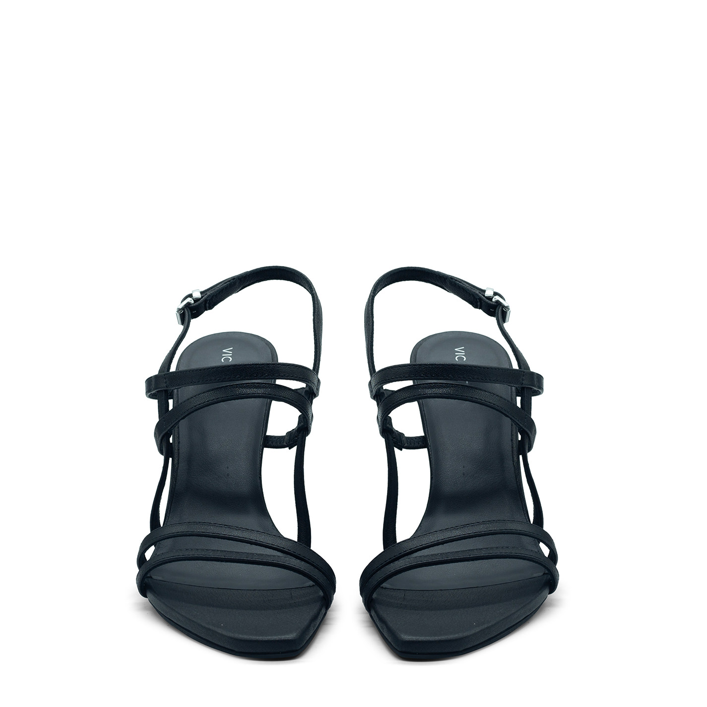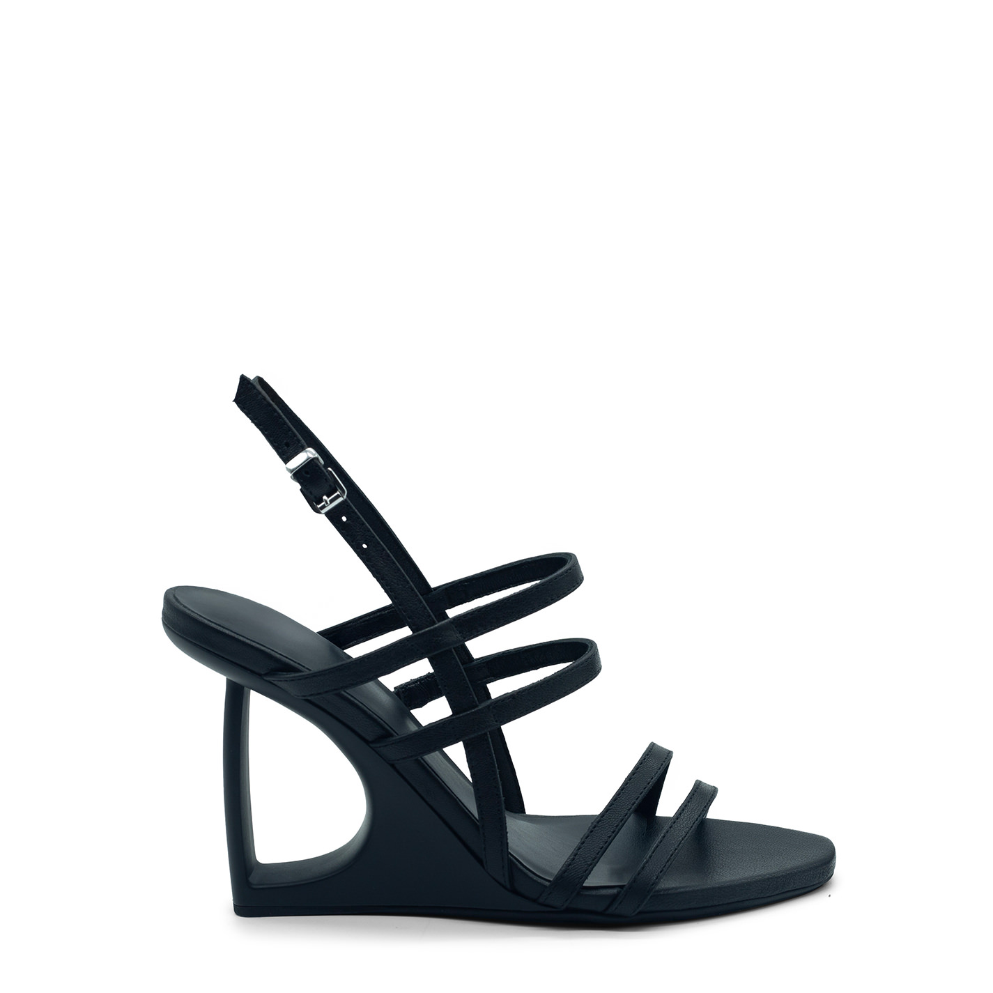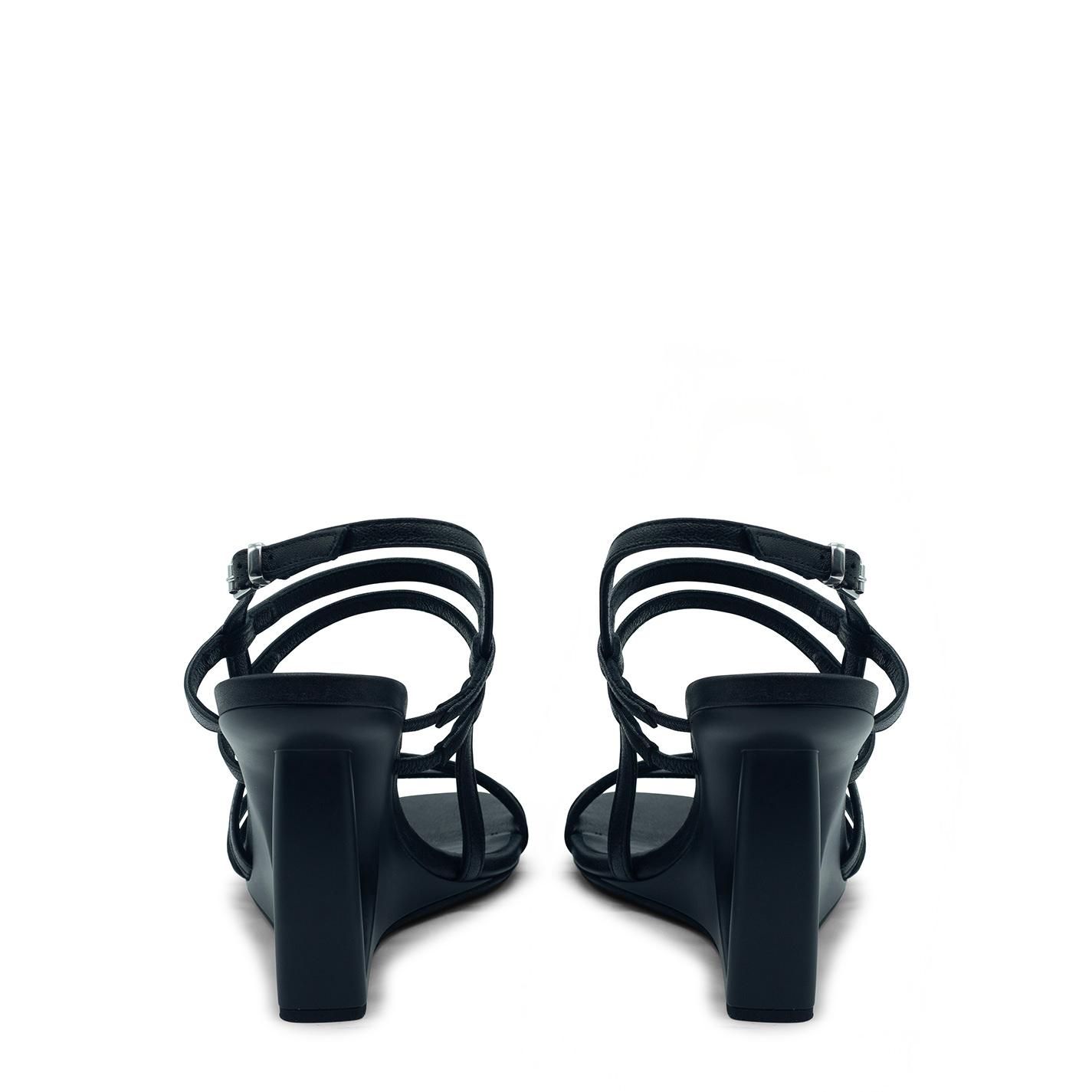 D black sandal Entirely made of nappa leather straps, strap that fastens on the heel with adjustable buckle. Wedge heel in patent abs, the design that interprets the D of woman. Non-slip rubber sole. Made in Italy.