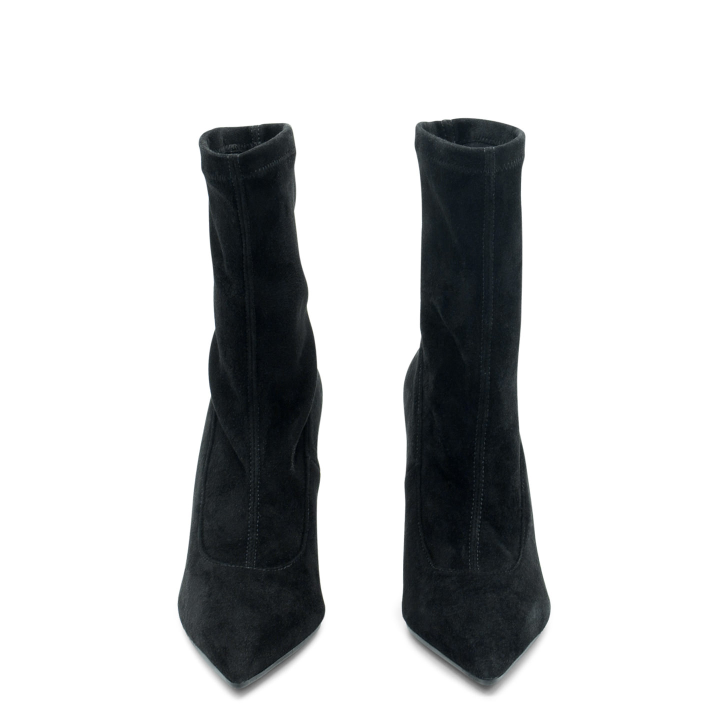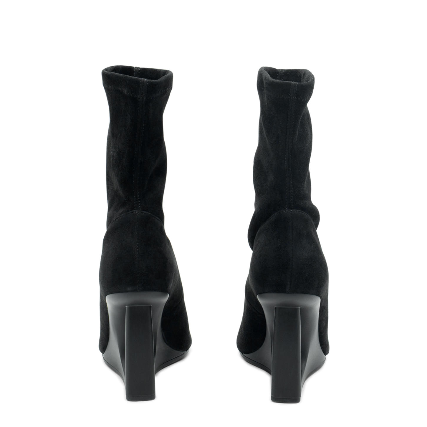 "D" black soft stretch suede half boots, sleek and tight-fitting. This model features a painted ABS platform heel, with a "D"-shaped profile, which stands for Donna (woman), and a non-slip rubber sole. Made in Italy.