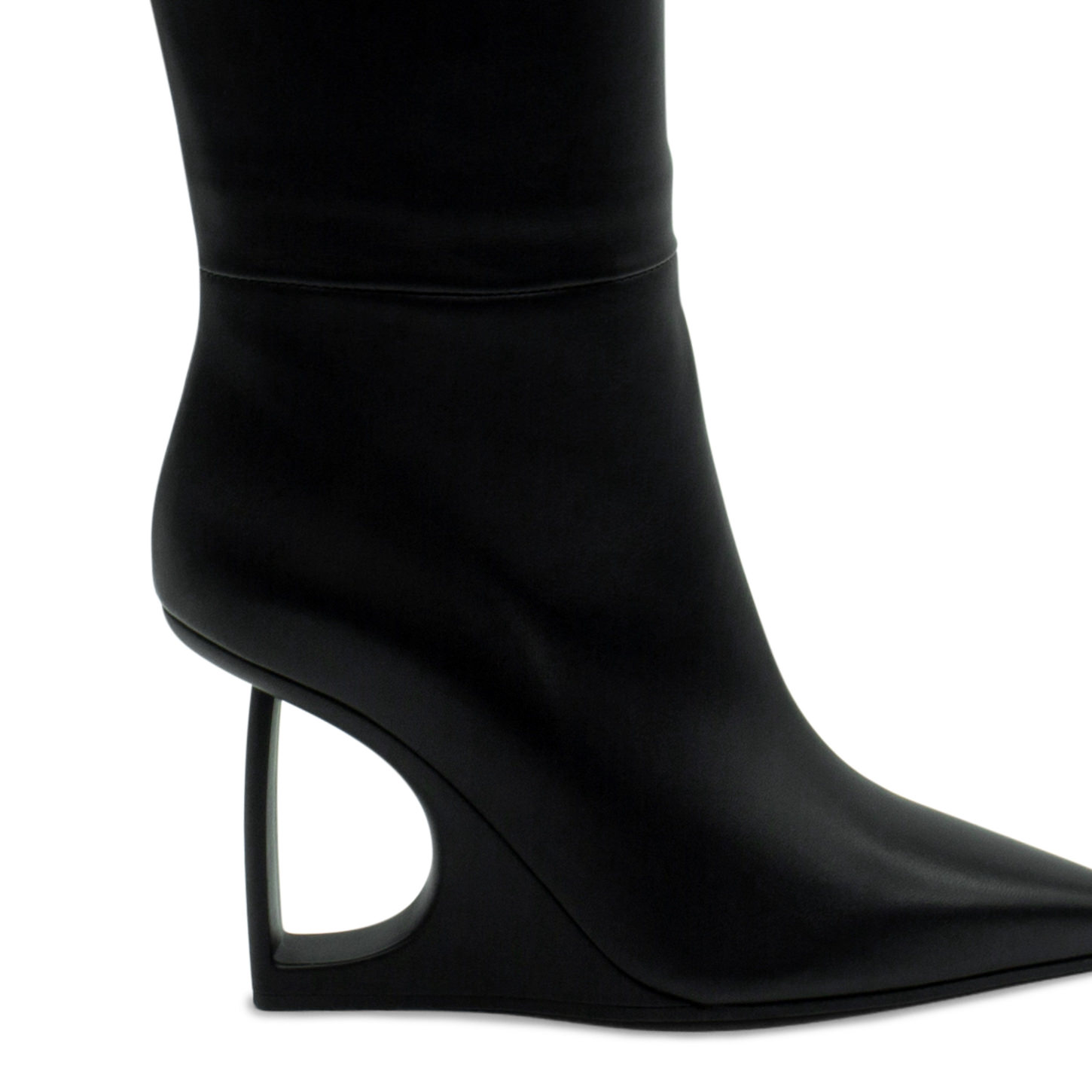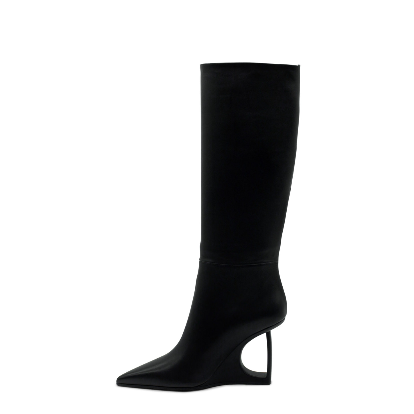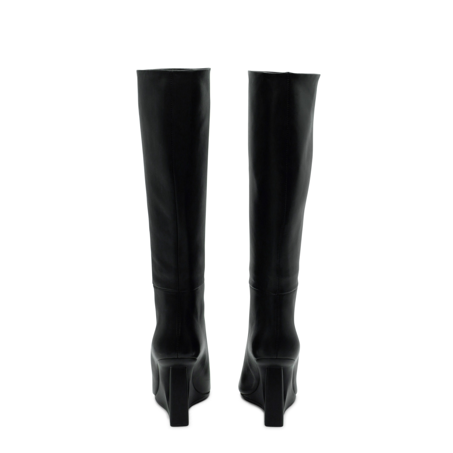 "D" black tubular boots, crafted from smooth calfskin. This model features a painted ABS platform heel, with a "D"-shaped profile, which stands for Donna (woman), and a non-slip rubber sole. Made in Italy.