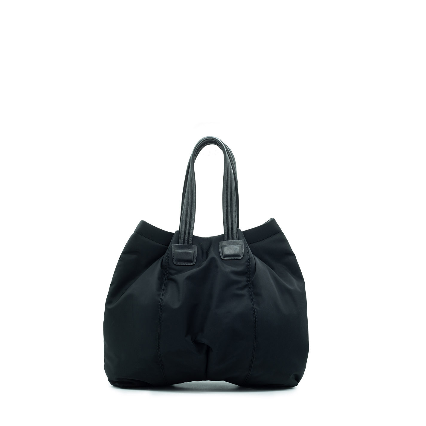 Black handbag, crafted from nylon and soft Nappa calfskin. It features embossed and notched decorations on the front, snap button fastening, long topstitched handles, and side zipped pockets with leather tassels.