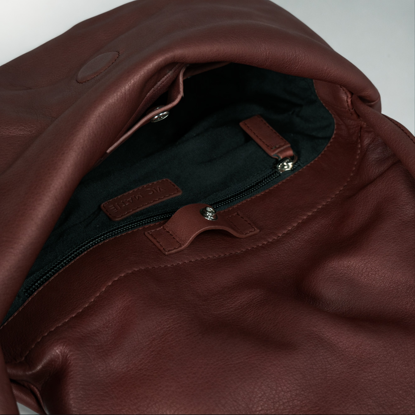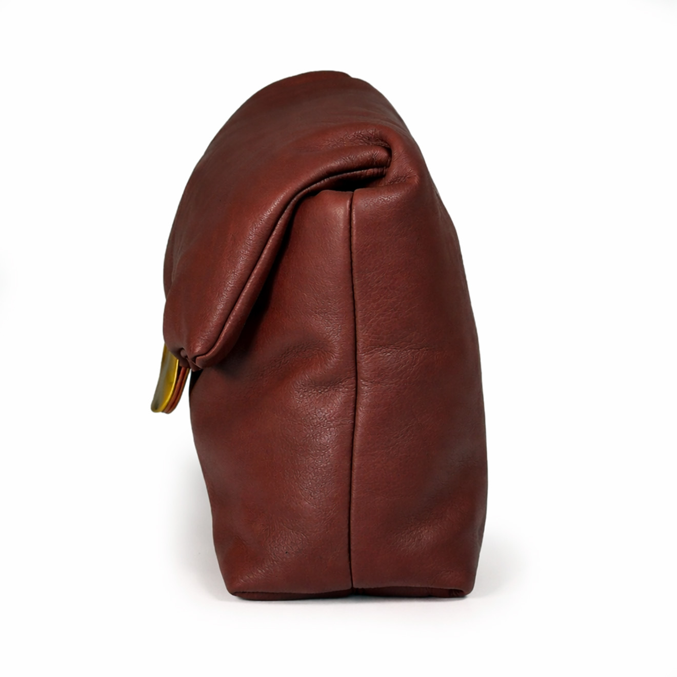 Chestnut baguette, made of leather with a compact and soft silhouette, defined by a rounded flap closed with a decorative metal element that enhances its essential design. The long handle allows comfortable carrying, while the lightweight structure makes it ideal for everyday use or evening occasions. An elegant and contemporary model, designed for those seeking a clean style with a distinctive detail.