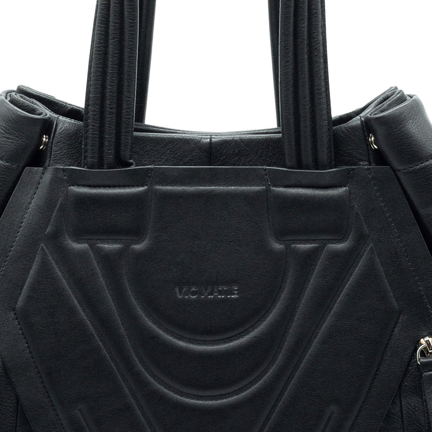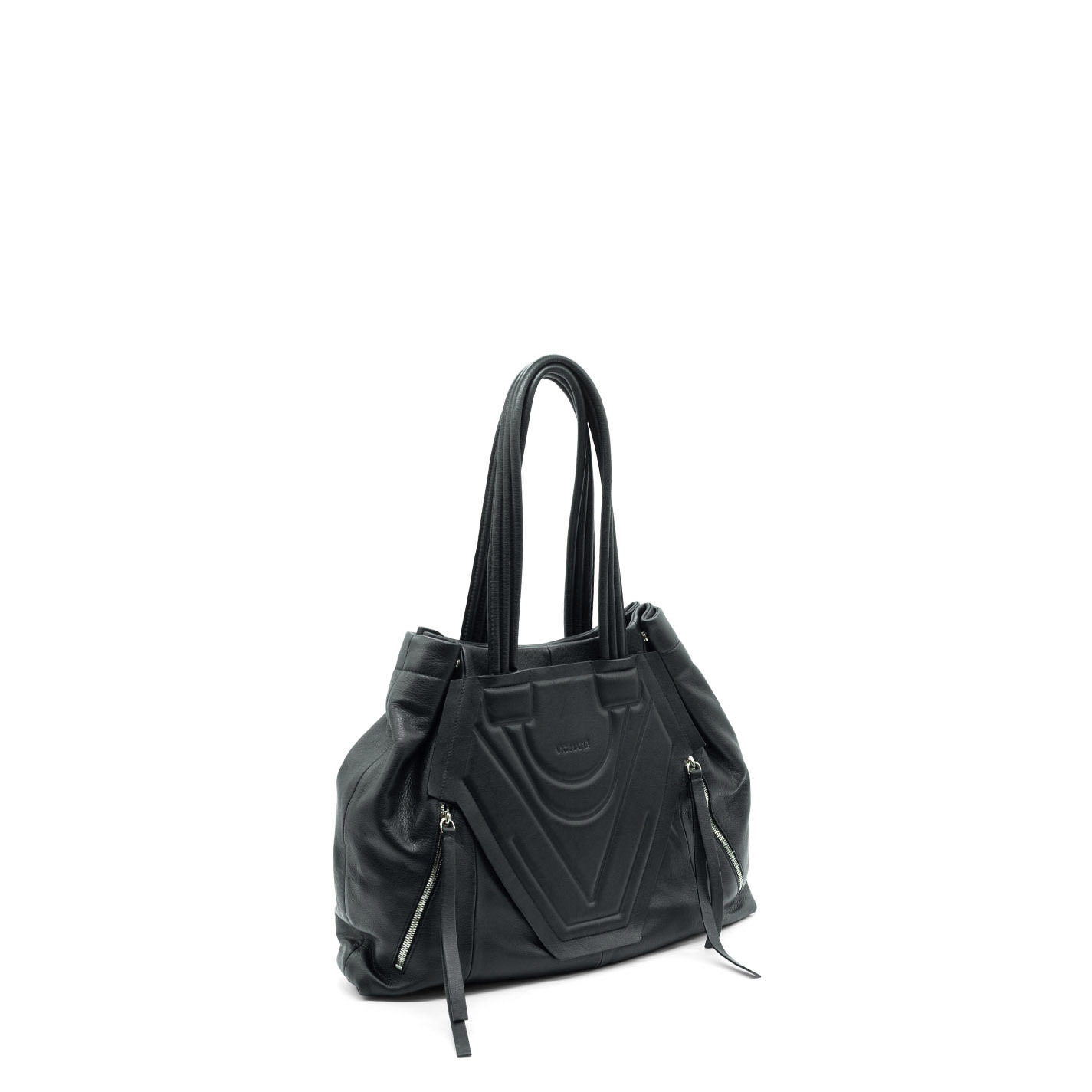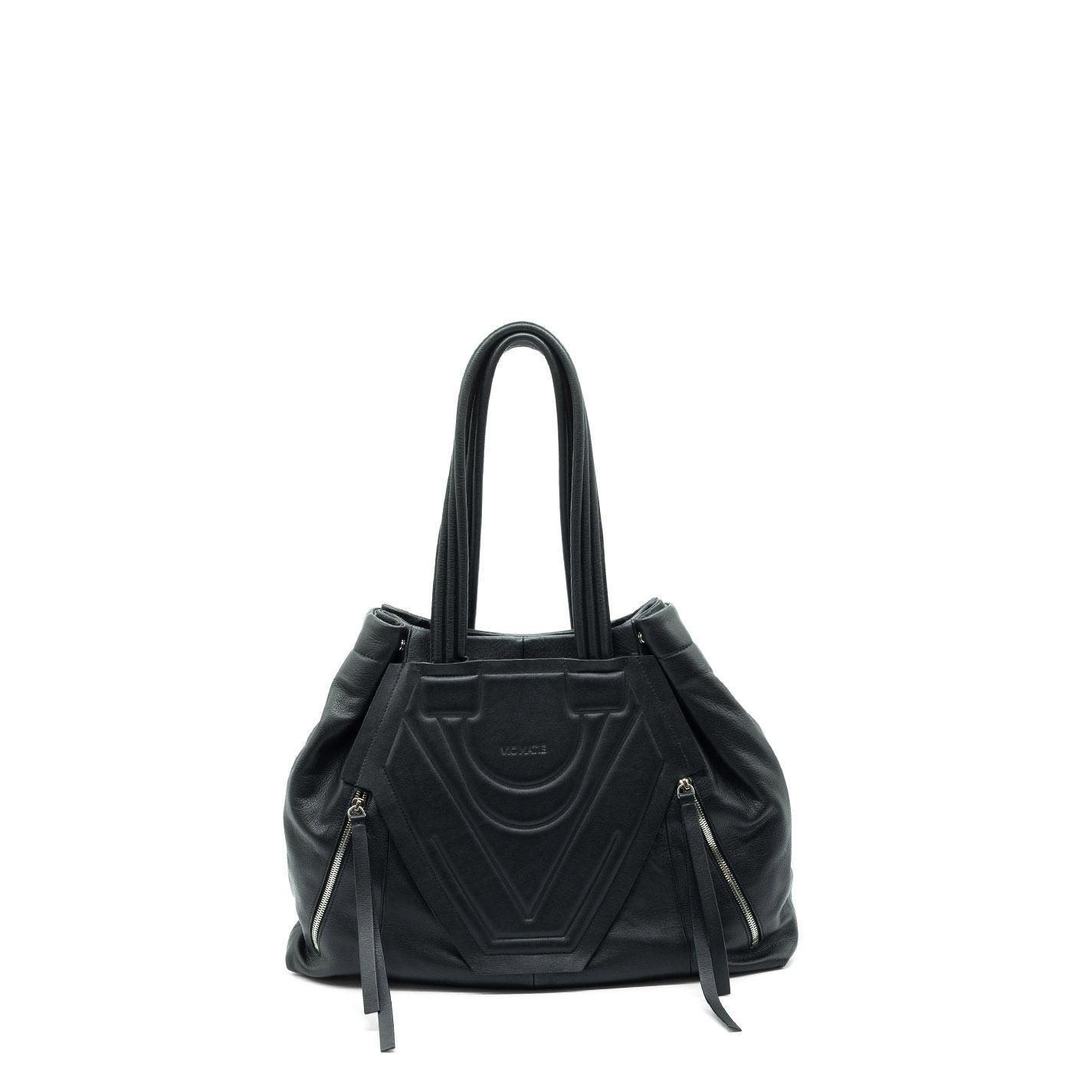 Black handbag, crafted from soft Nappa calfskin. It features embossed and notched decorations on the front, snap button fastening, long topstitched handles, and side zipped pockets with leather tassels.