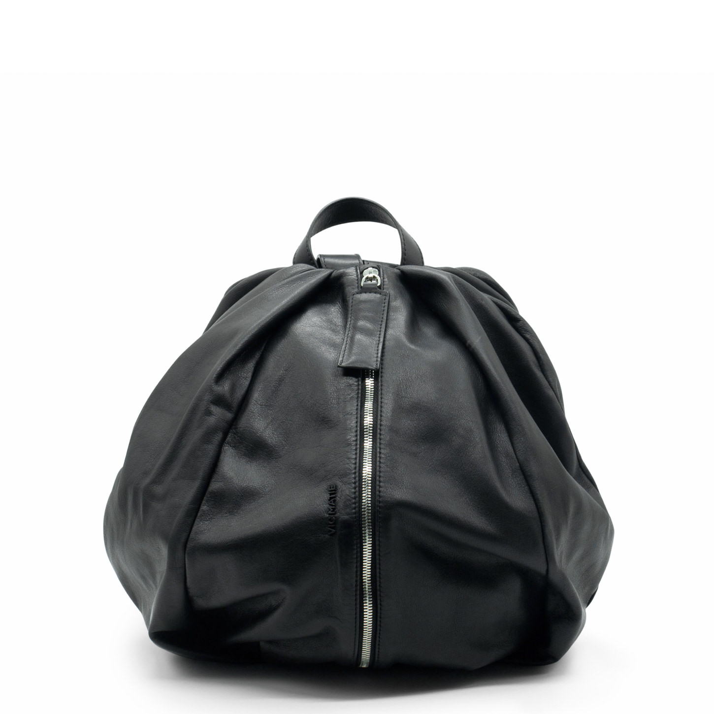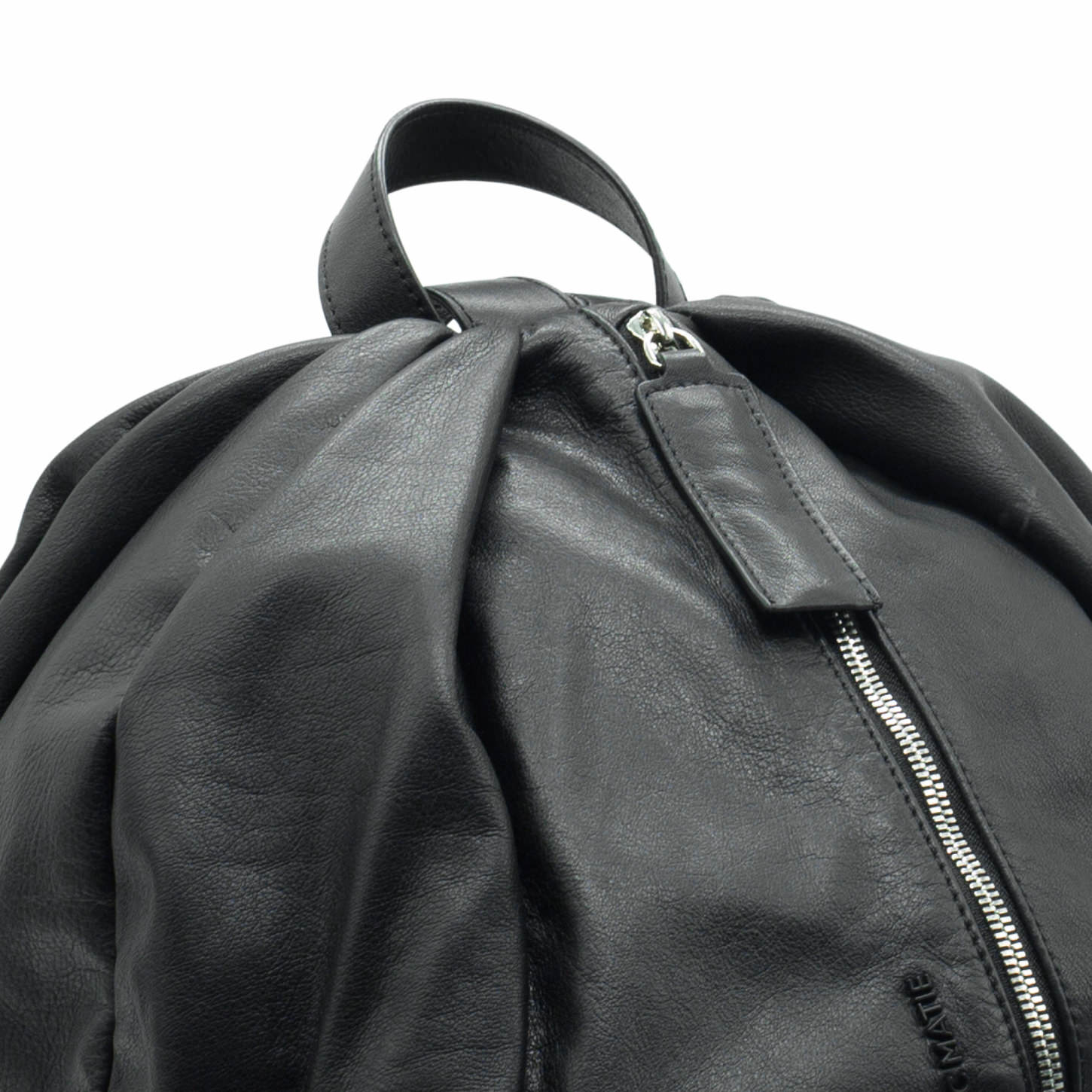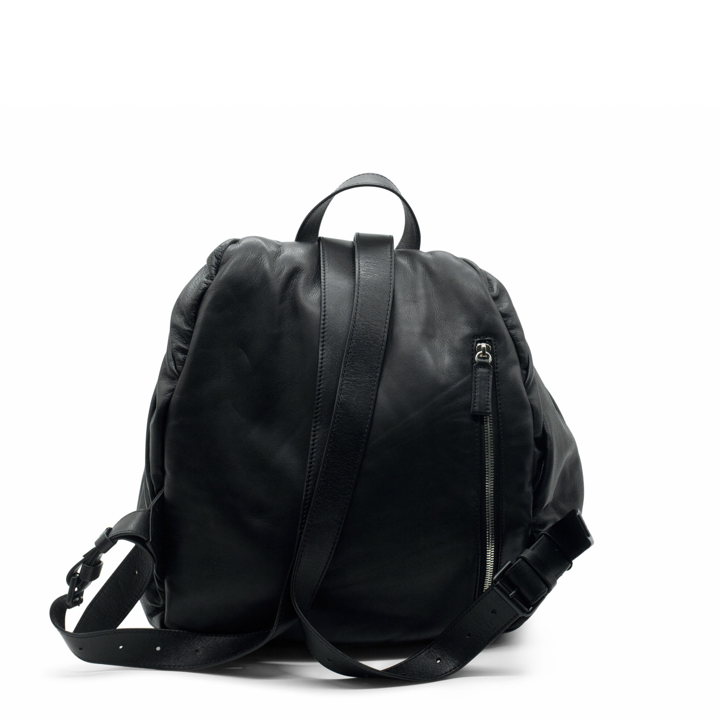 Black pleated backpack, crafted from soft tooled Nappa calfskin. This backpack features a vertical front opening with maxi metal zip, leather handles and shoulder straps, anti-theft pocket on the back, and front metal logo.