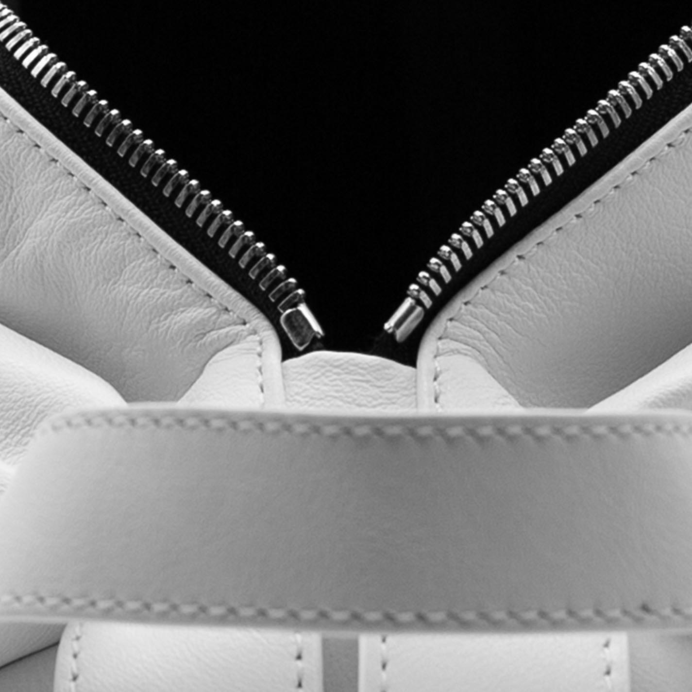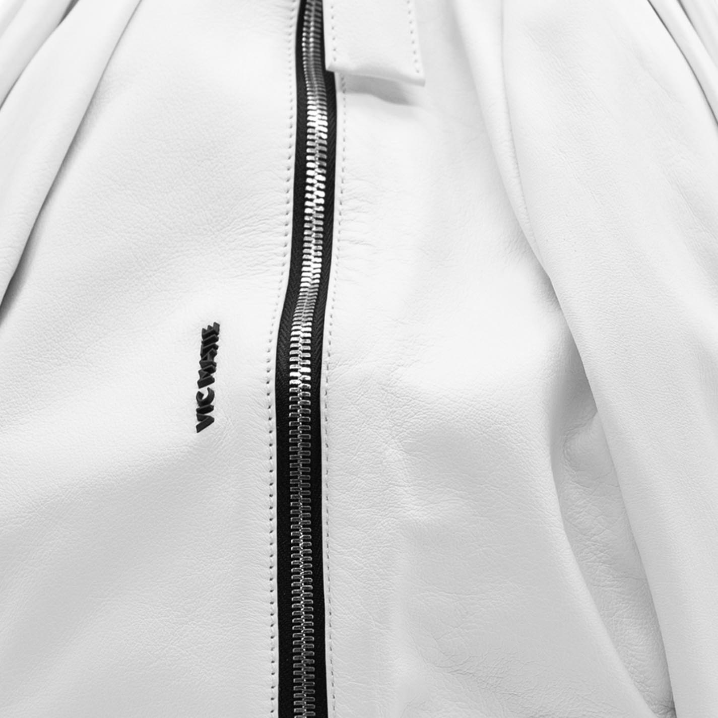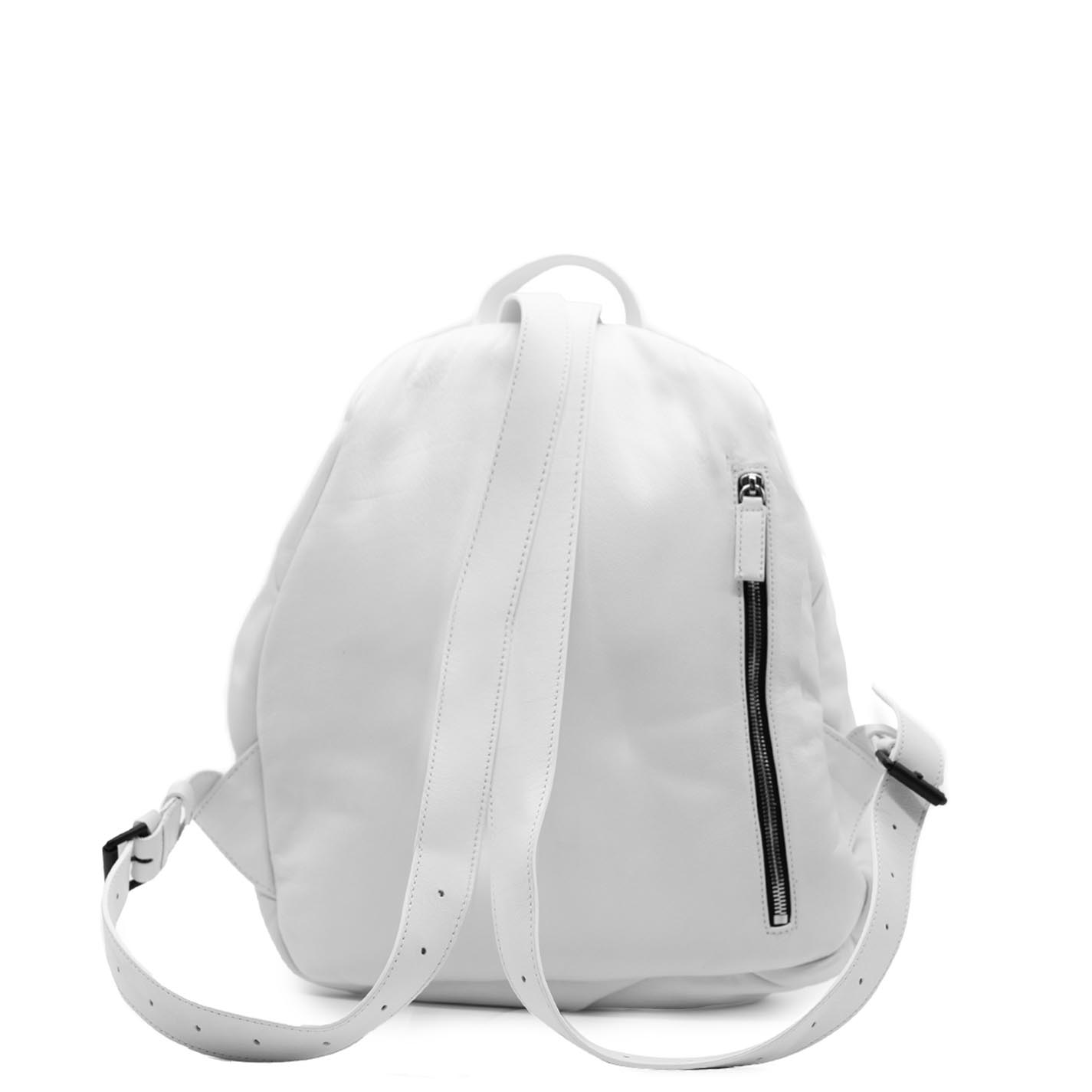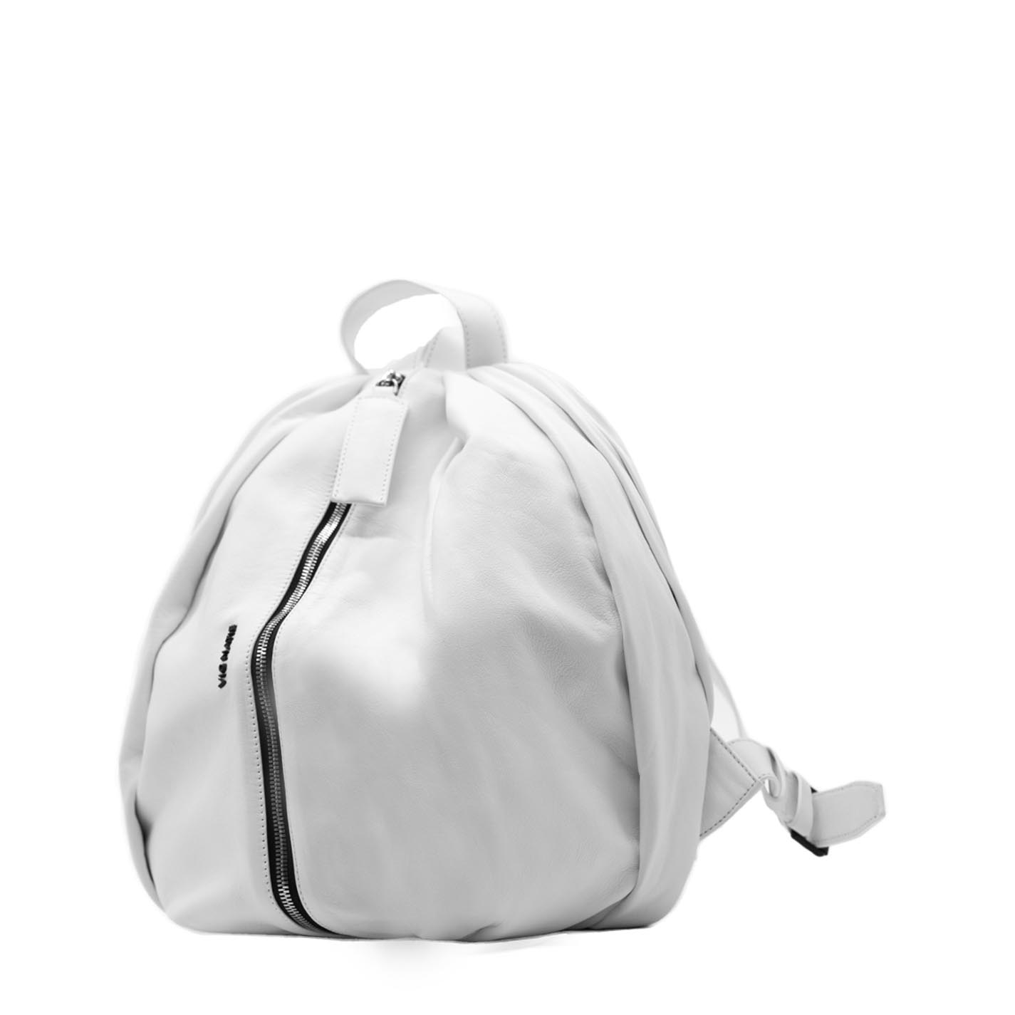 White pleated backpack in soft nappa calfskin. Vertical front pocket with large metal zip, leather handles and shoulder straps, and second non-snag large pocket at the back. Metal logo on the front.