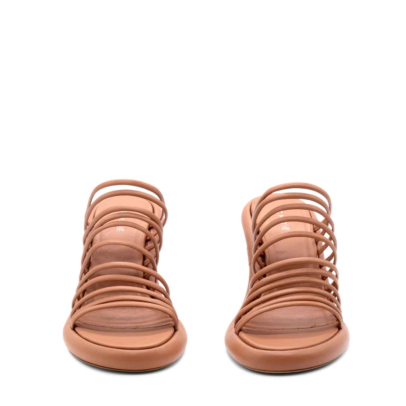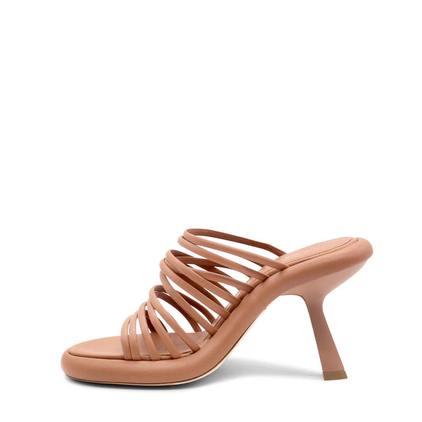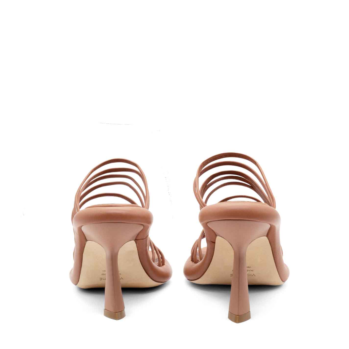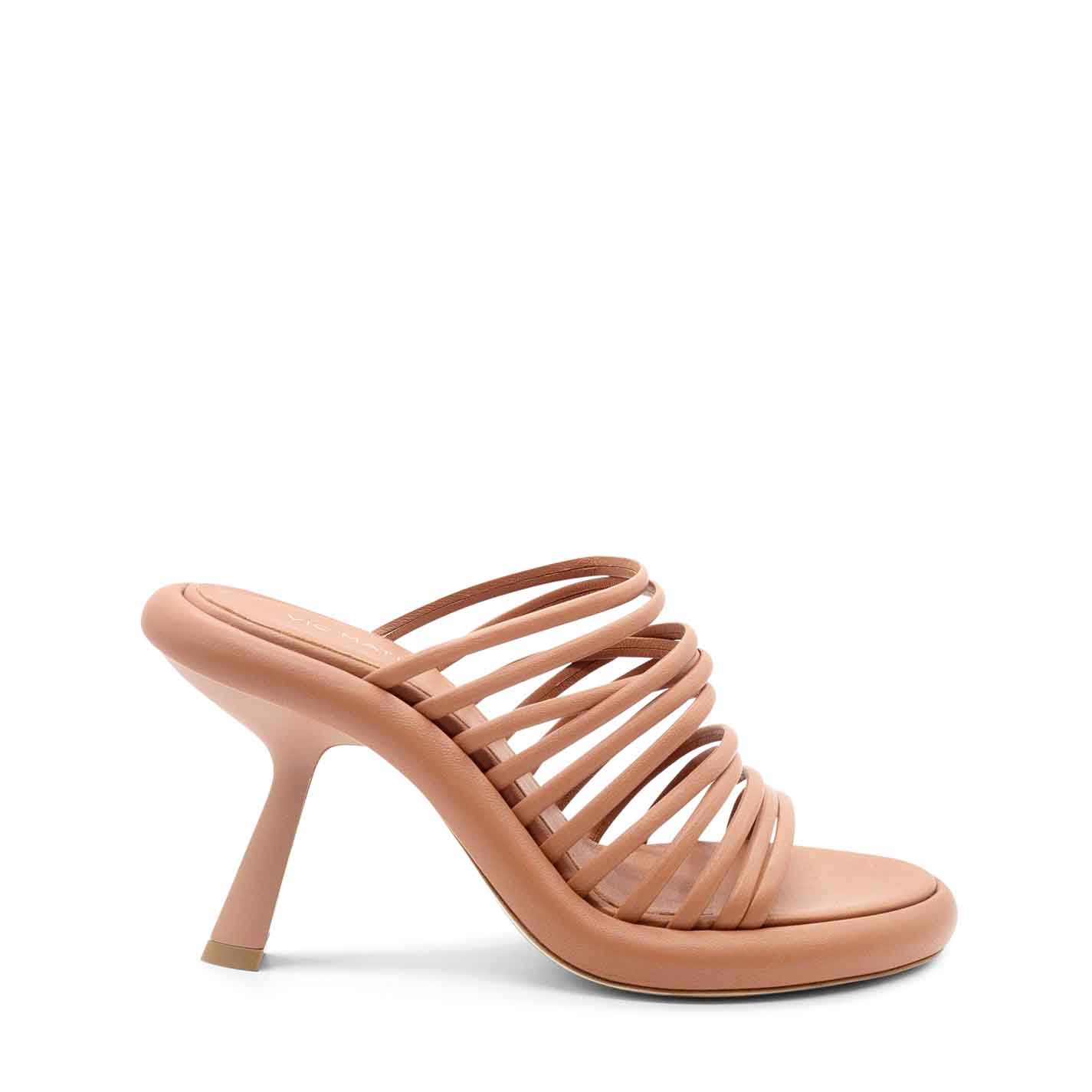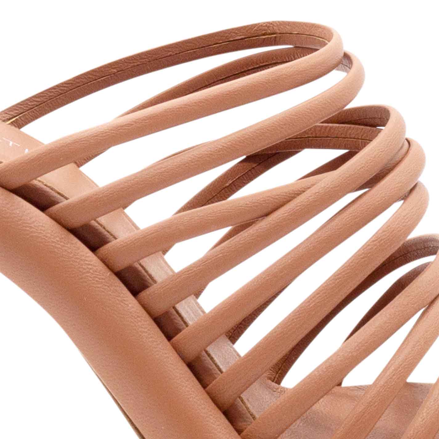 Dosh slip-ons in sienna-brown nappa, with many closely spaced strips. Leather sole, leather-covered curved platform, and matt coated "slash" heel. Comfortable leather-covered insole. Made in Italy.