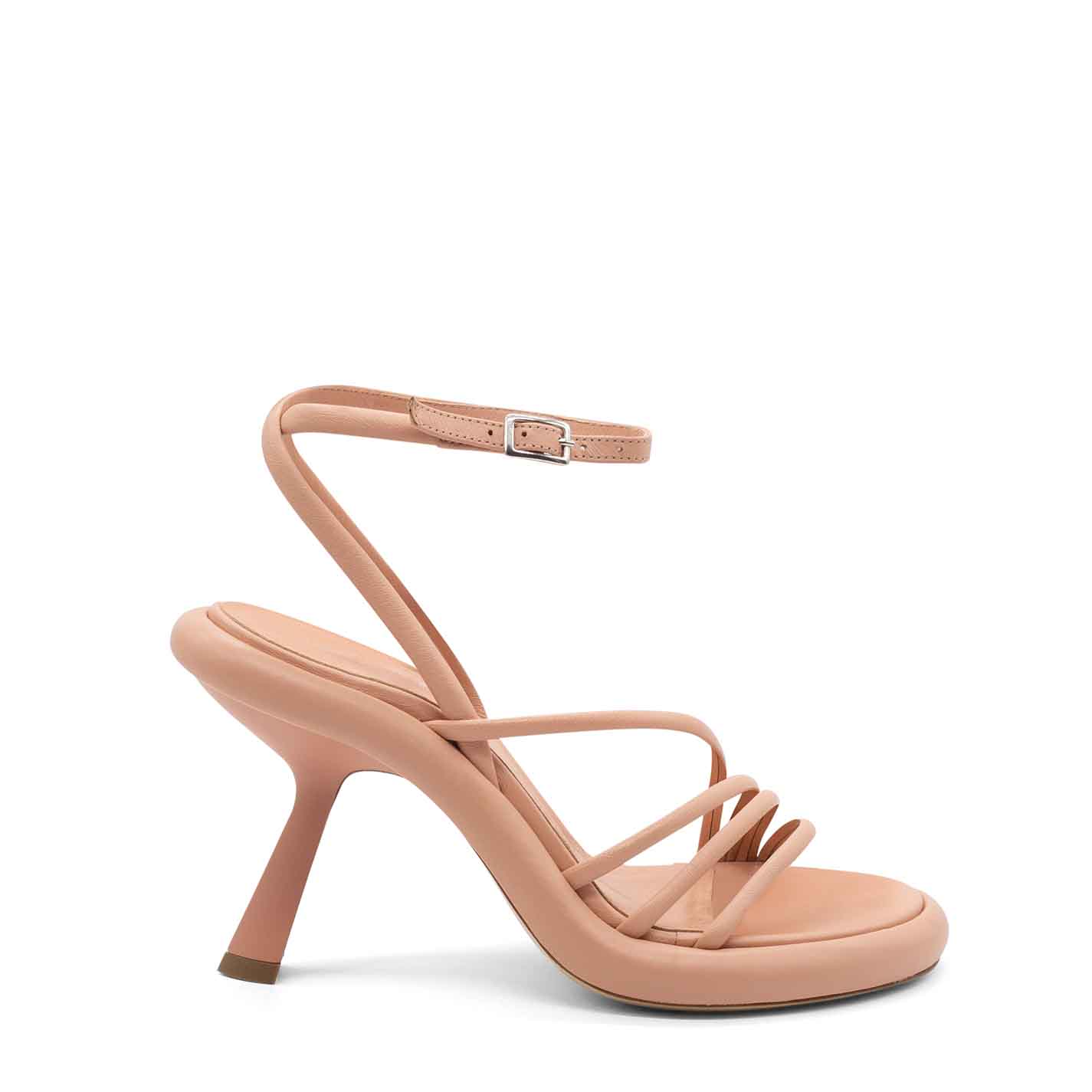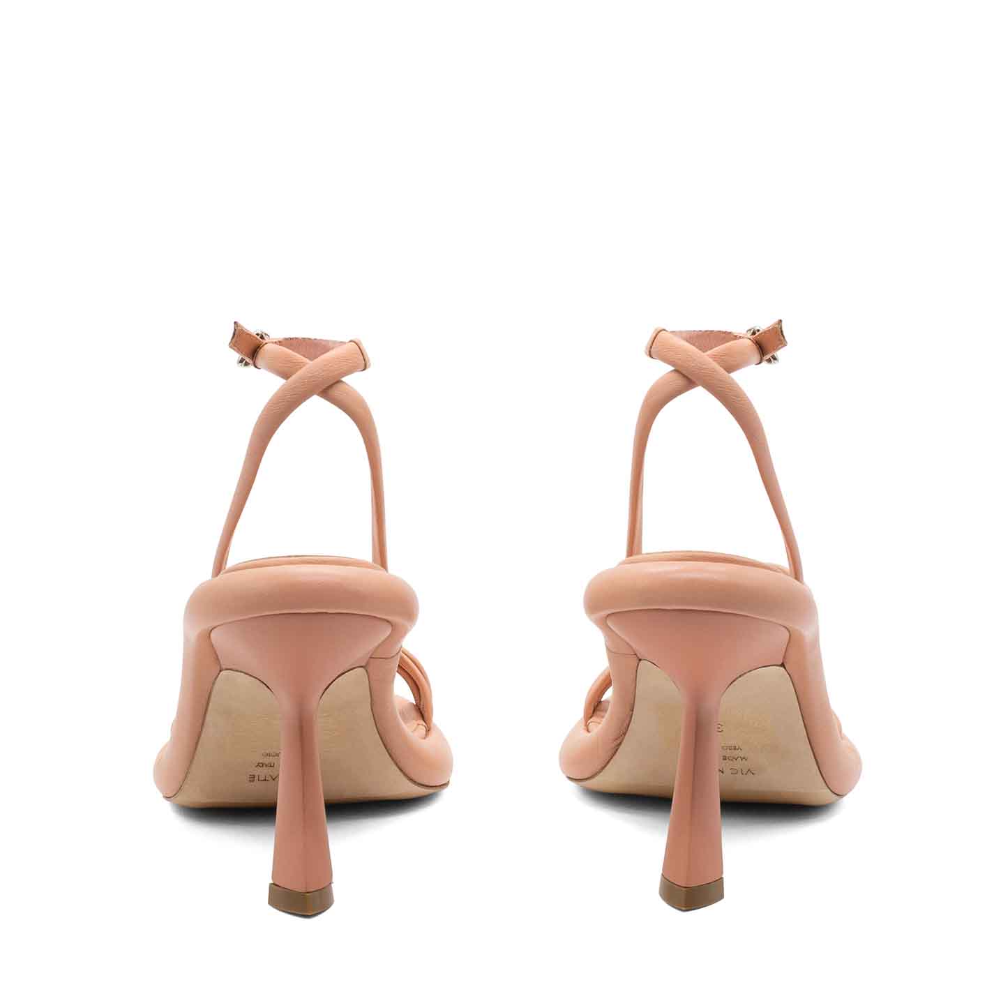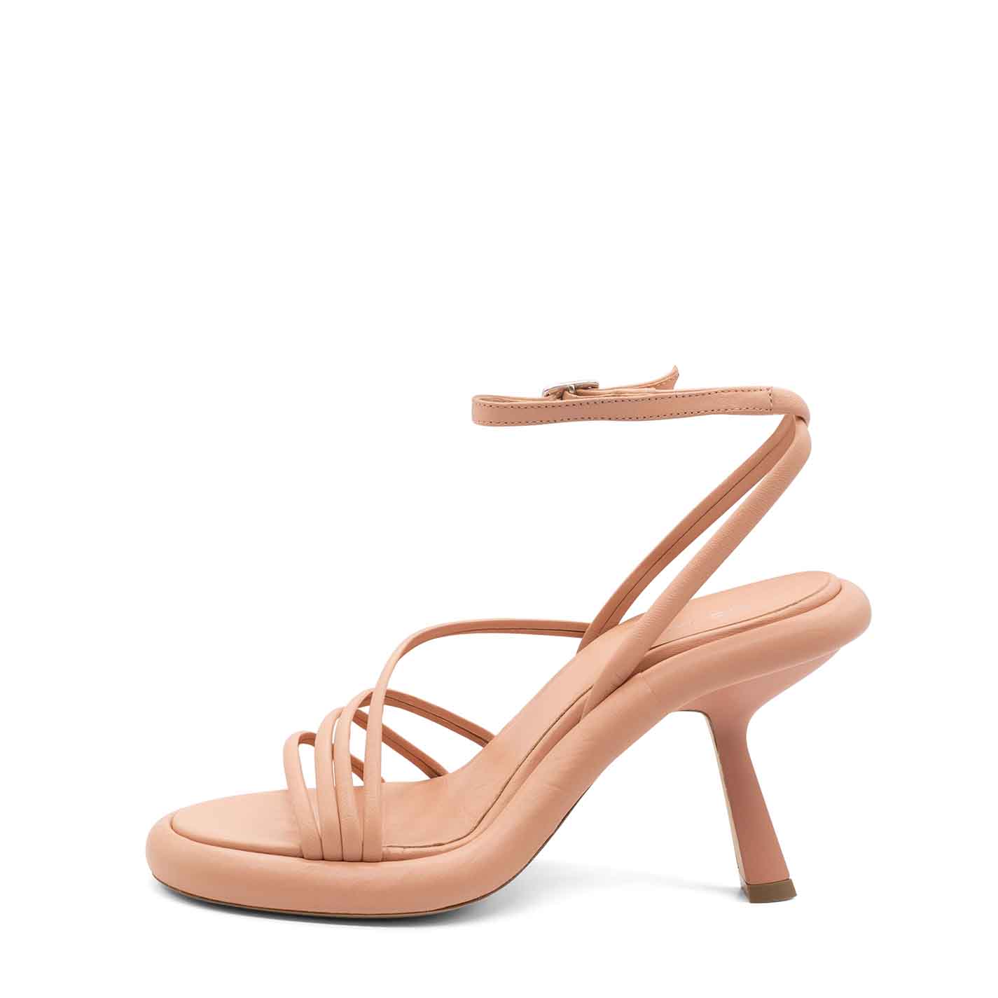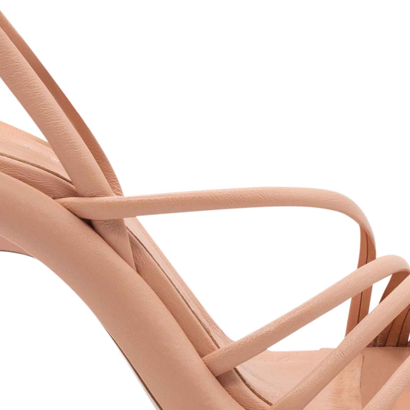 Dosh strappy sandals in pink nappa, with small radial-patterned leather strips and adjustable ankle strap. Leather sole, leather-covered curved platform, and matt coated "slash" heel. Comfortable leather-covered insole. Made in Italy.