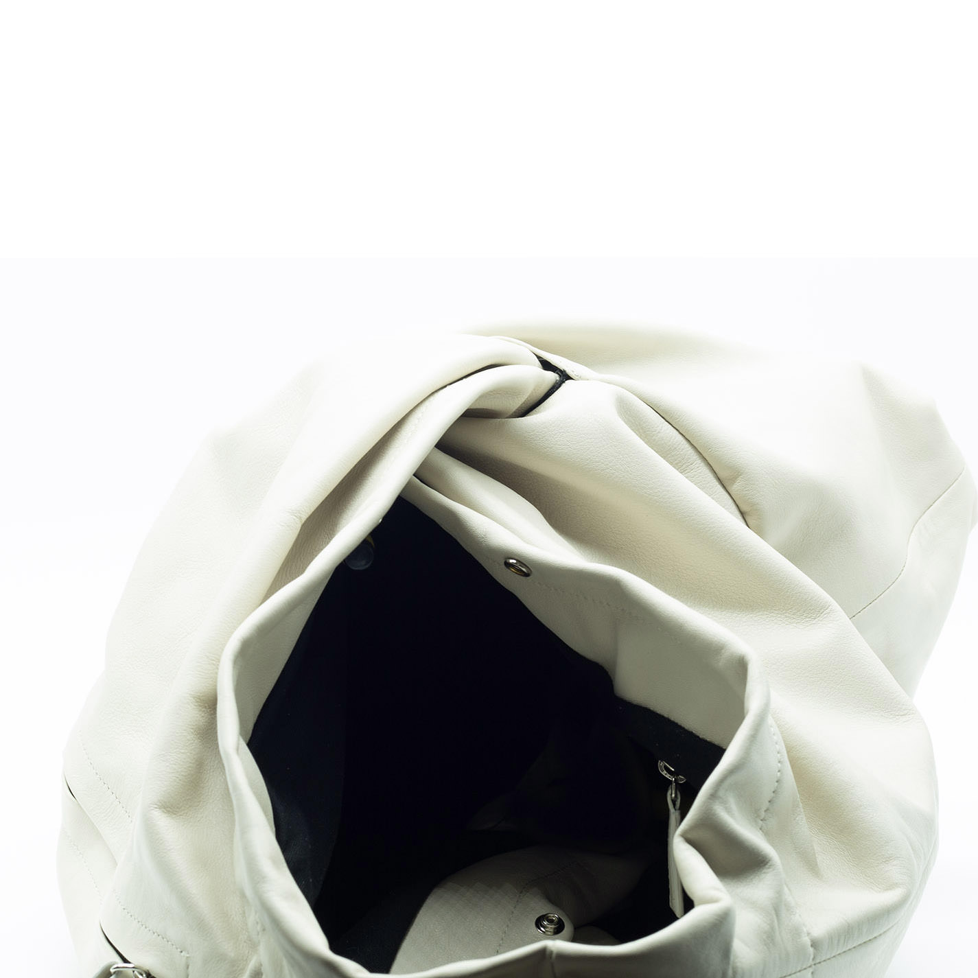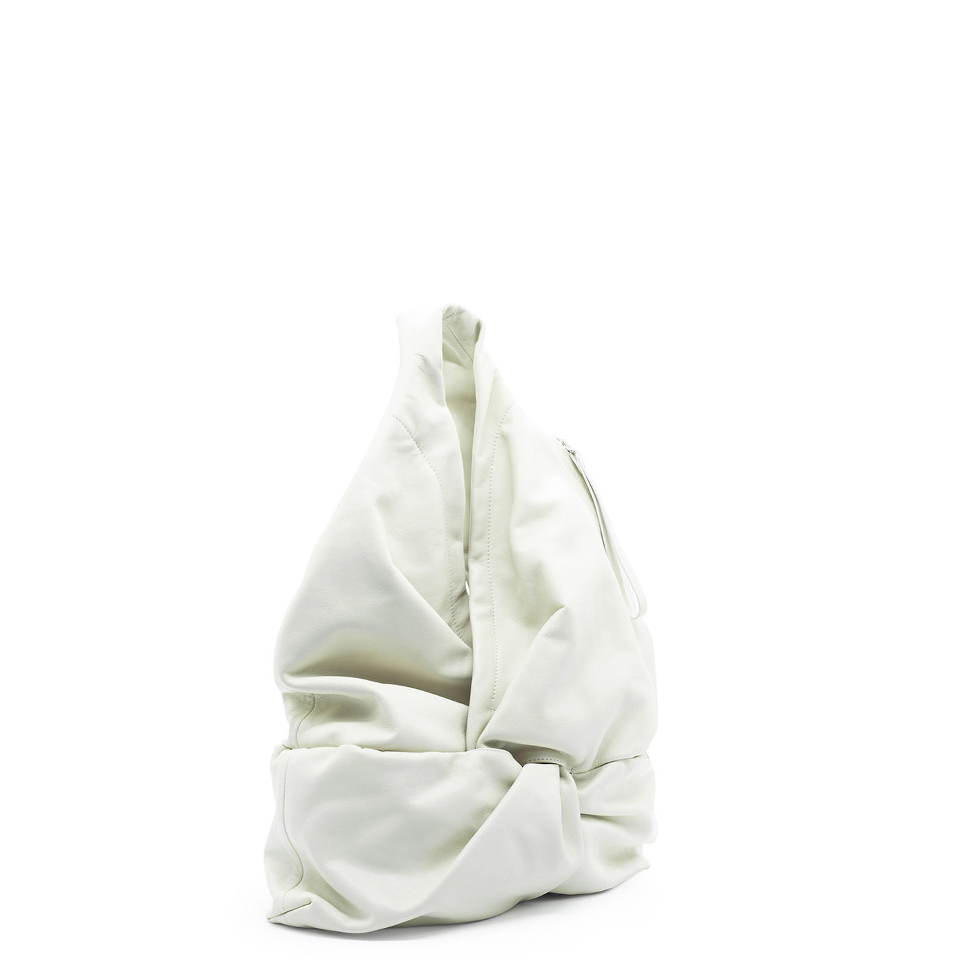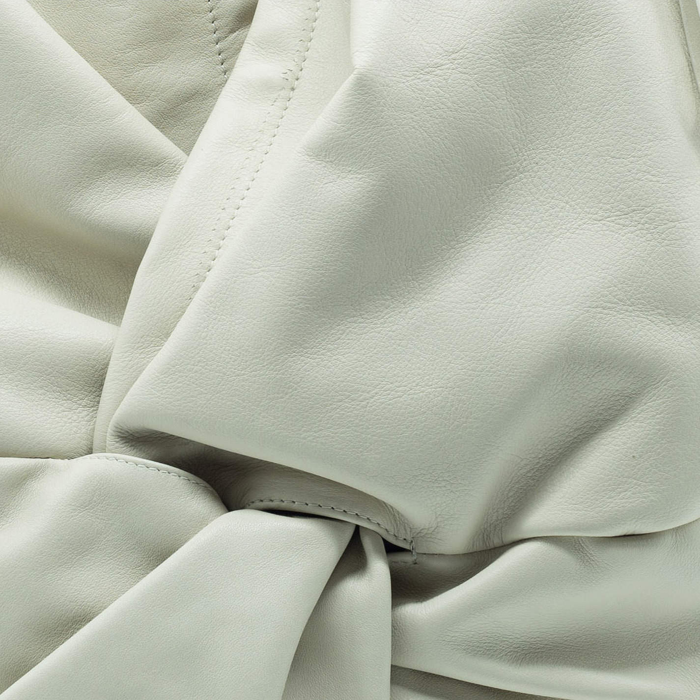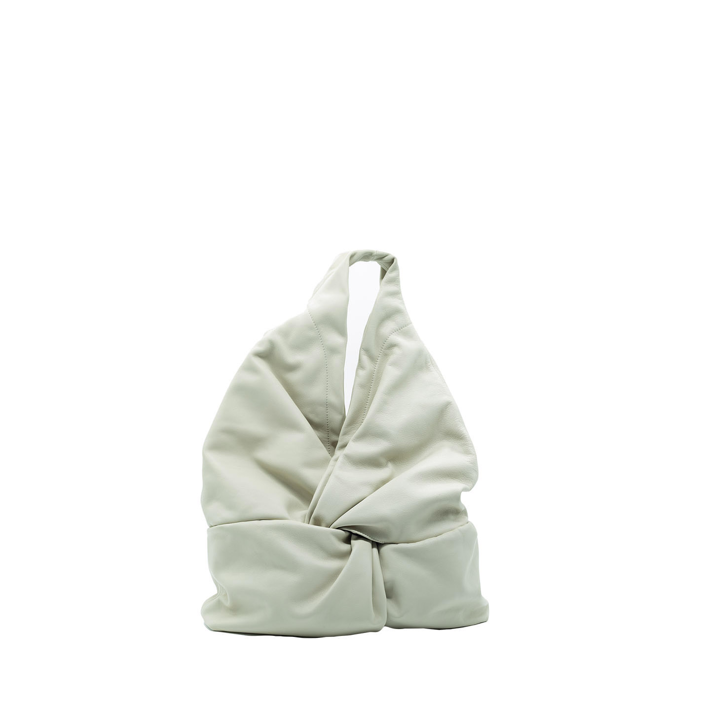 Cream bucket bag with knot, with one shoulder strap. Crafted from soft Nappa calfskin, it features a hidden snap button fastening.