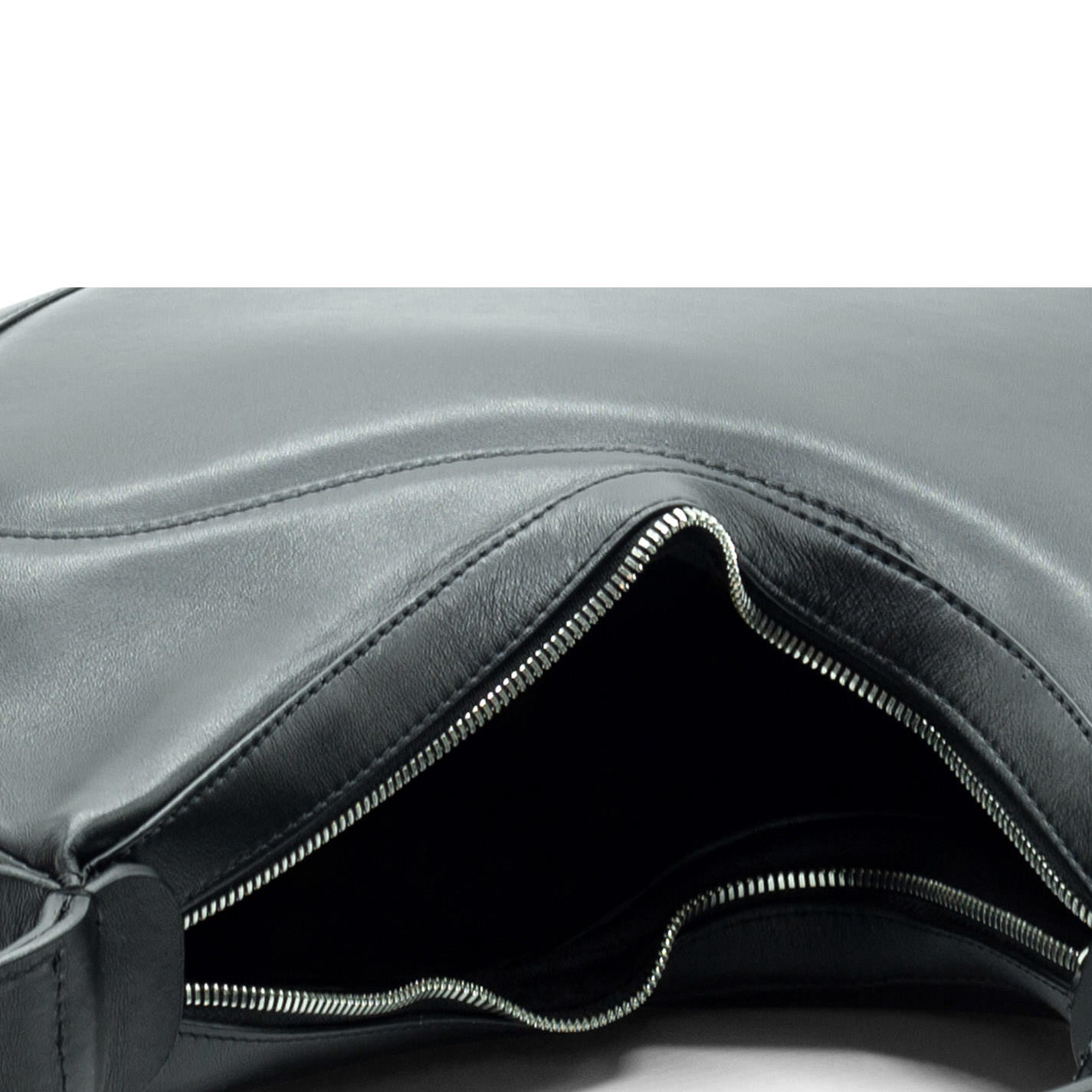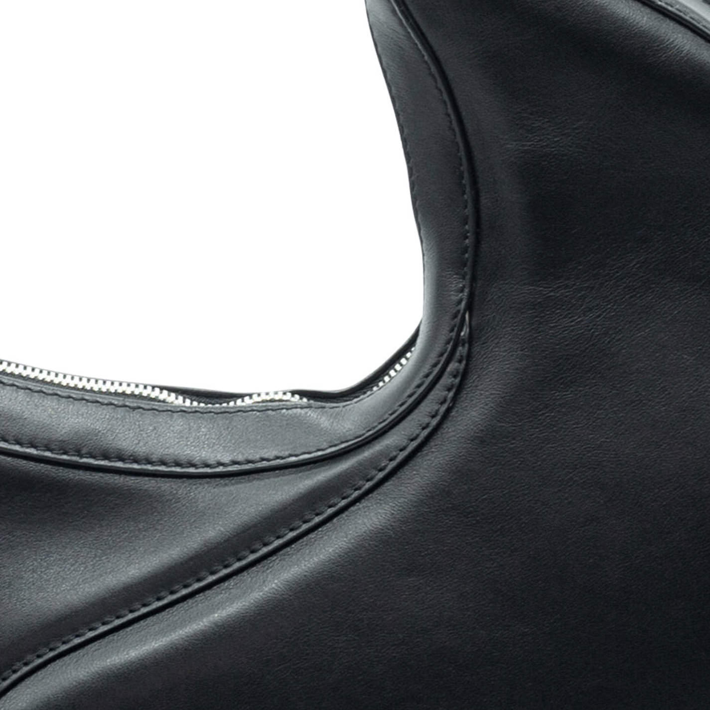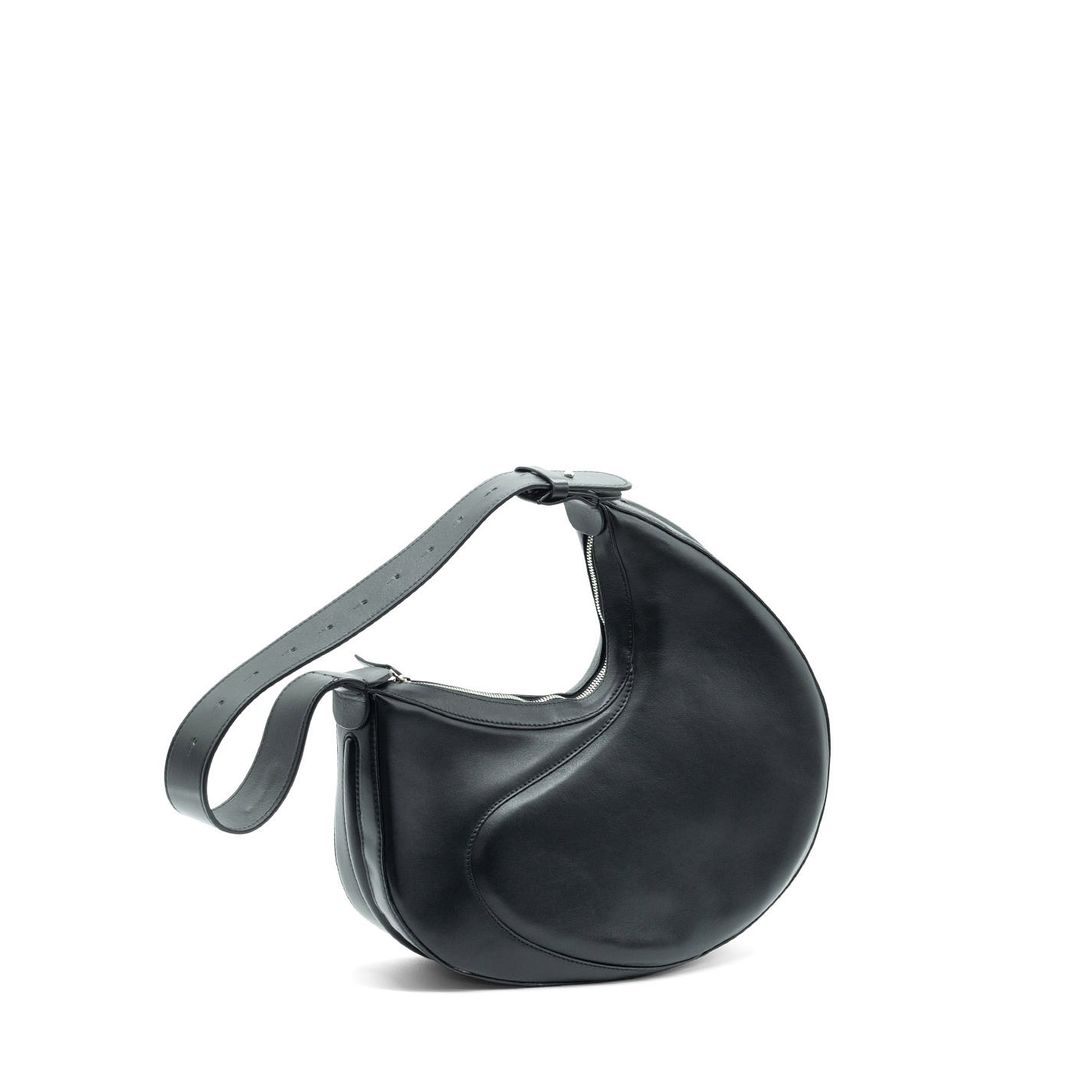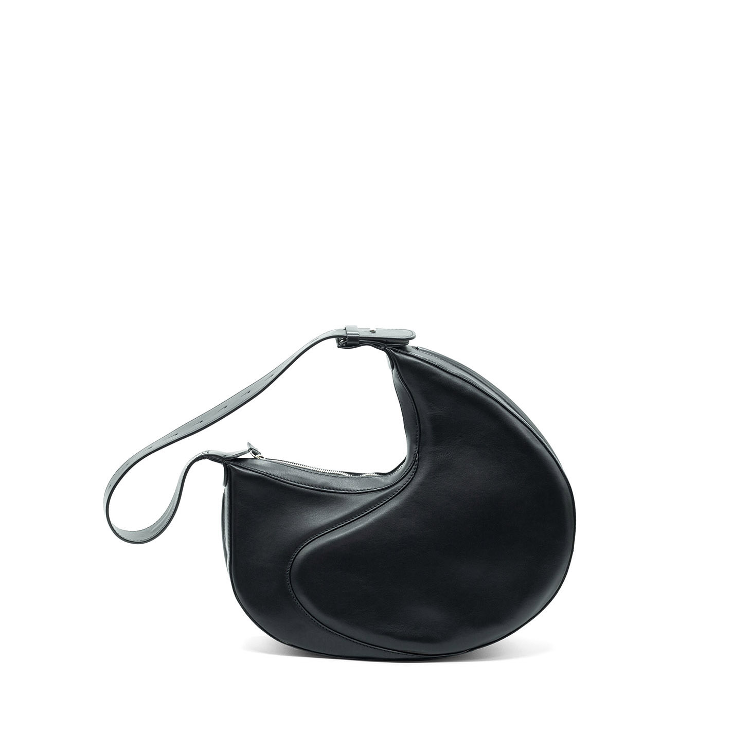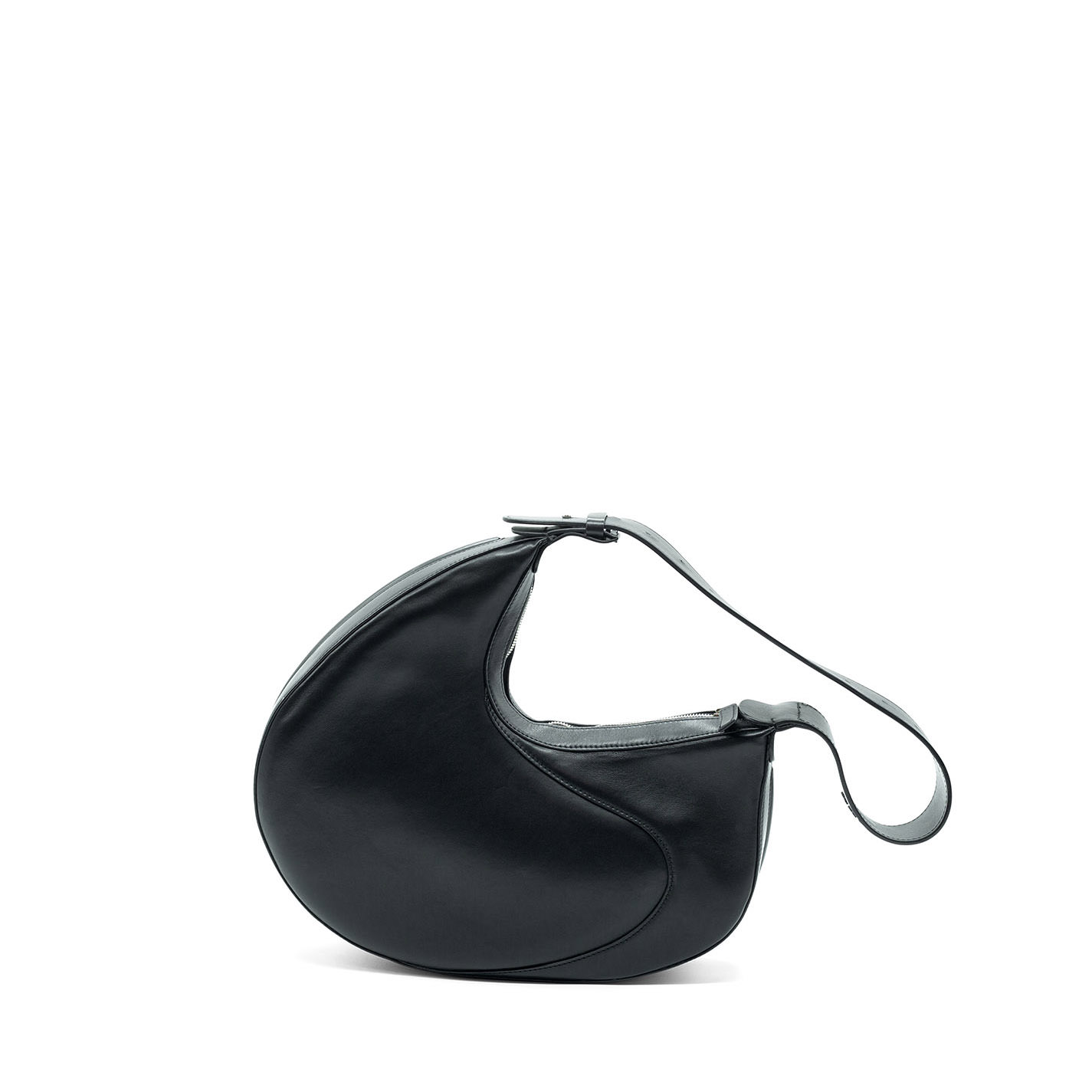 Black oval-shaped semi-structured bag, crafted from smooth calfskin, with adjustable handle, wave seams and metal zip fastening.
