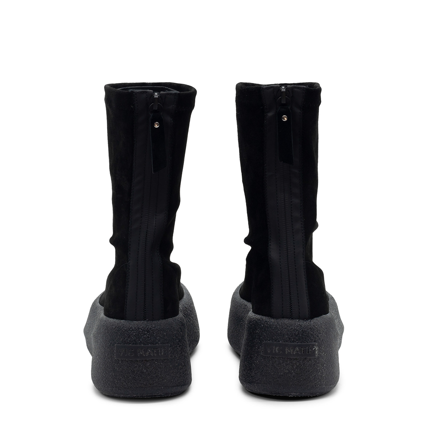 F04 Creepy-Stretch suede ankle boot black, slim and snug fit thanks to the soft stretch material, easy to slip on with rubberized pearl zip on the back, leather pull tab. Para platform with slight outer protrusion. Soft leather-covered insole. Made in Italy.