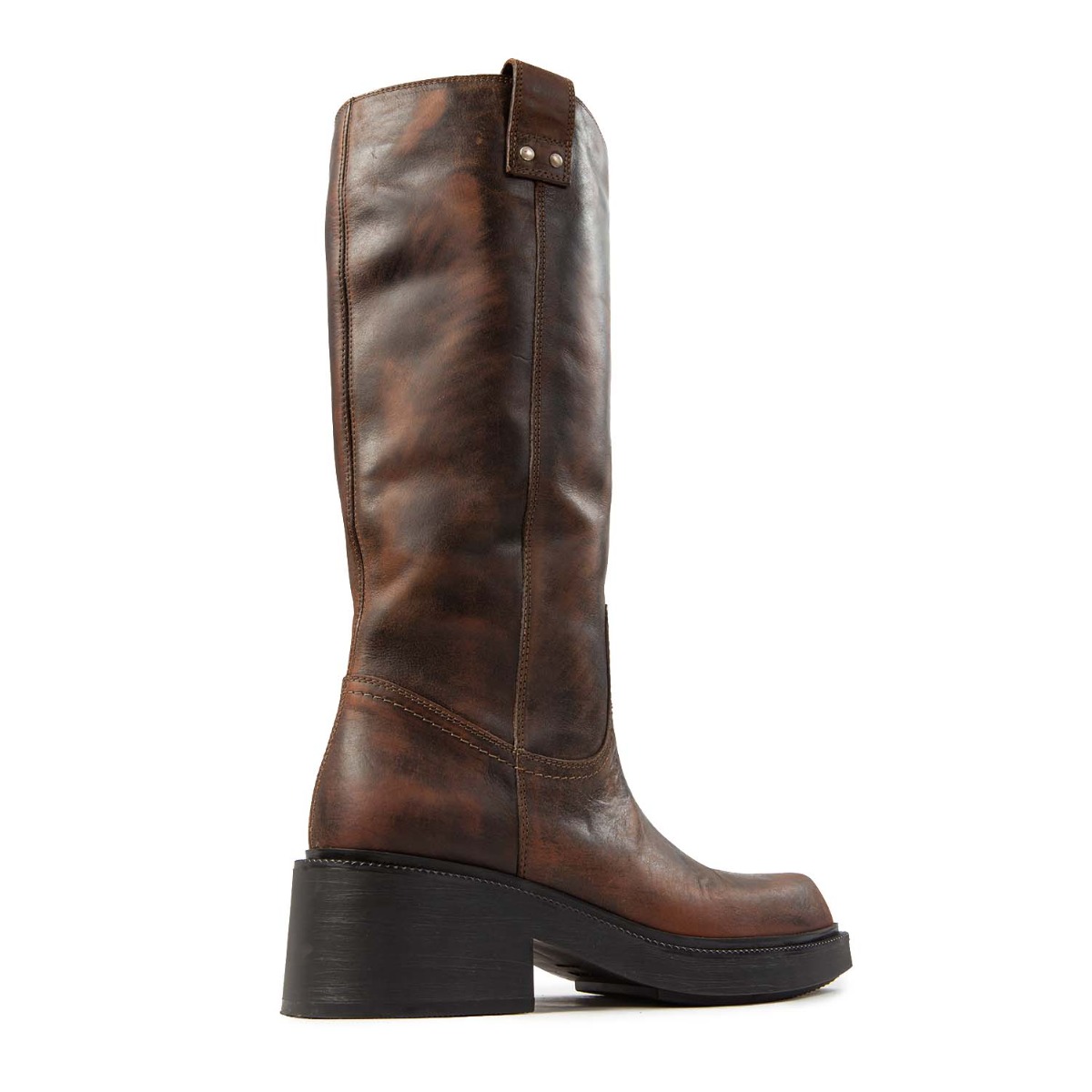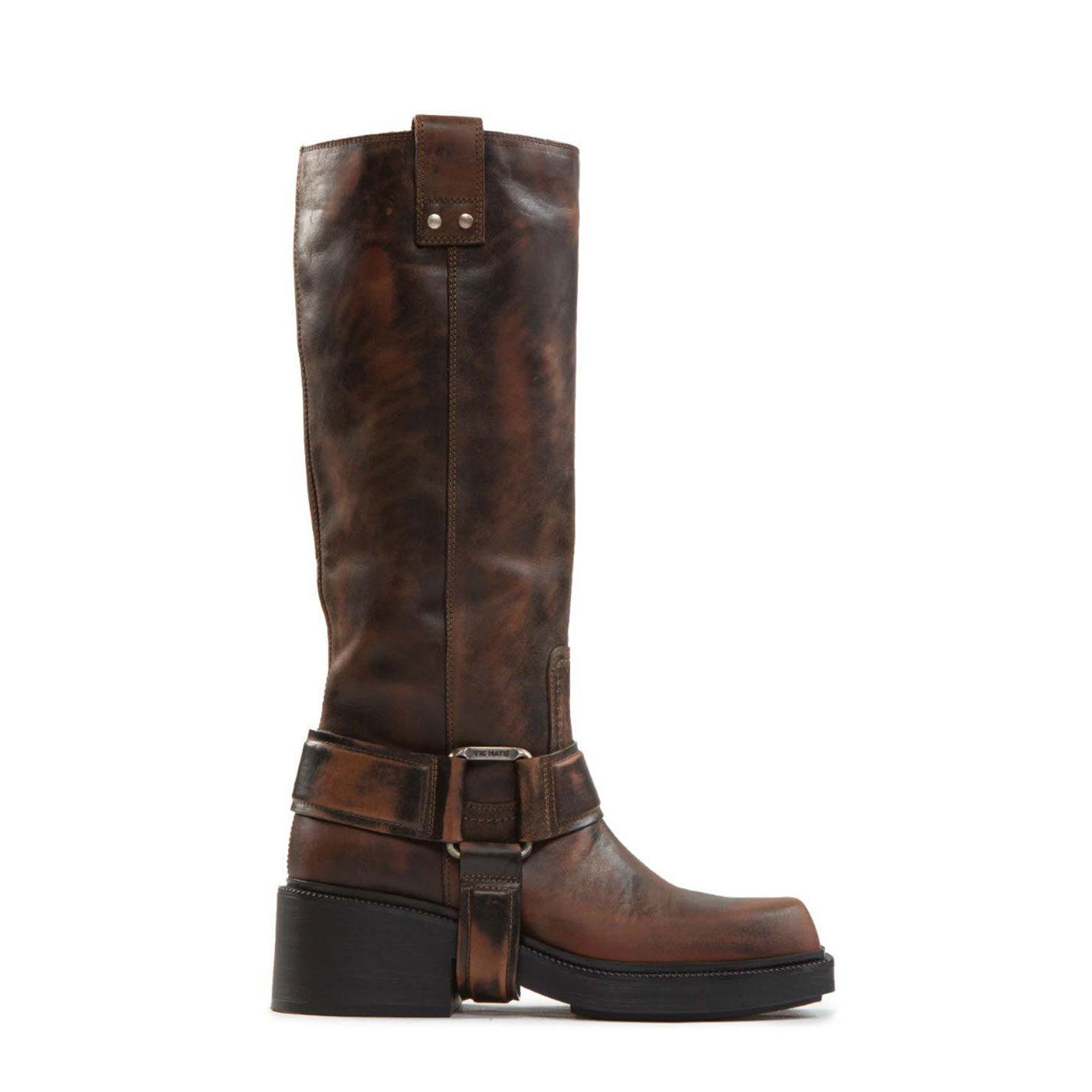 F06 Fray-Gaucho boot tan in vintage calfskin, with removable belt with square embossed and logoed rings. Sturdy rubber sole with non-slip tread. Soft leather-covered insole. Made in Italy.