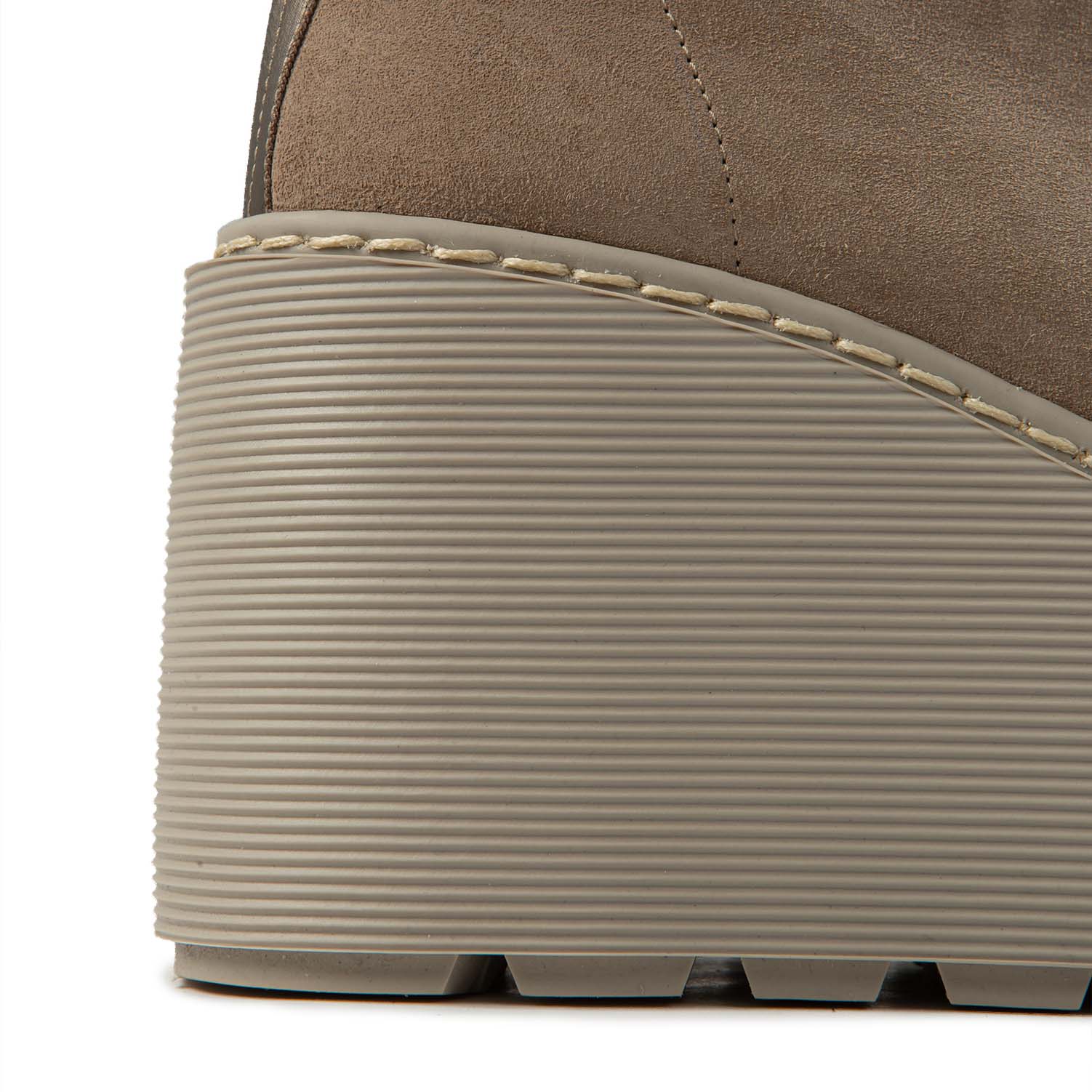 F20 Stripy-Wedge ankle boot zip in taupe stretch suede, with tone-on-tone pearl rear zip. Grooved-effect rubber wedge sole with anti-slip lugged tread. Made in Italy.
