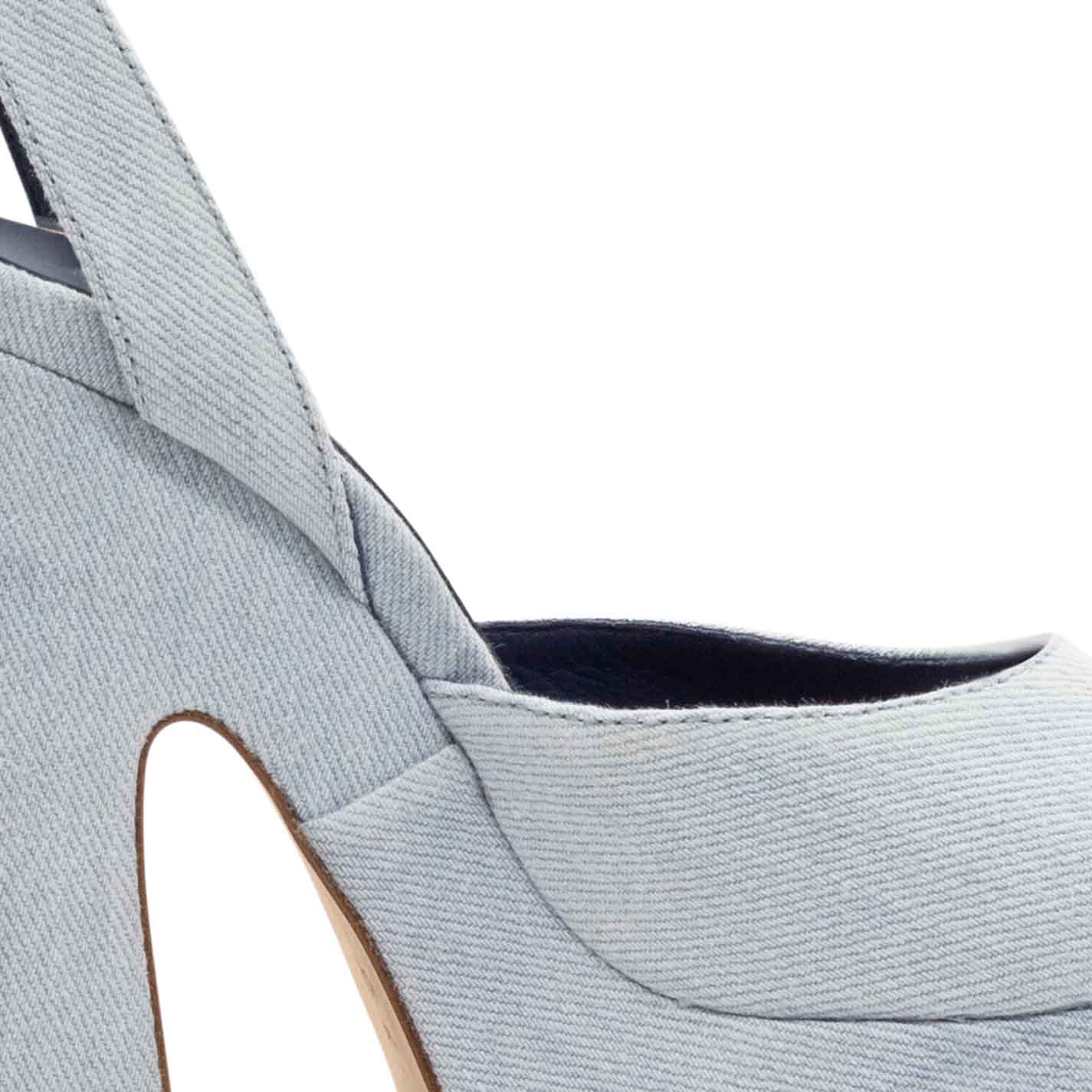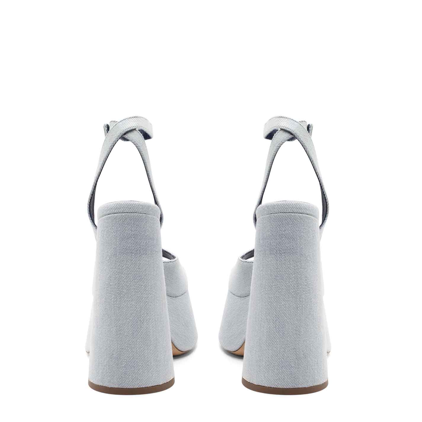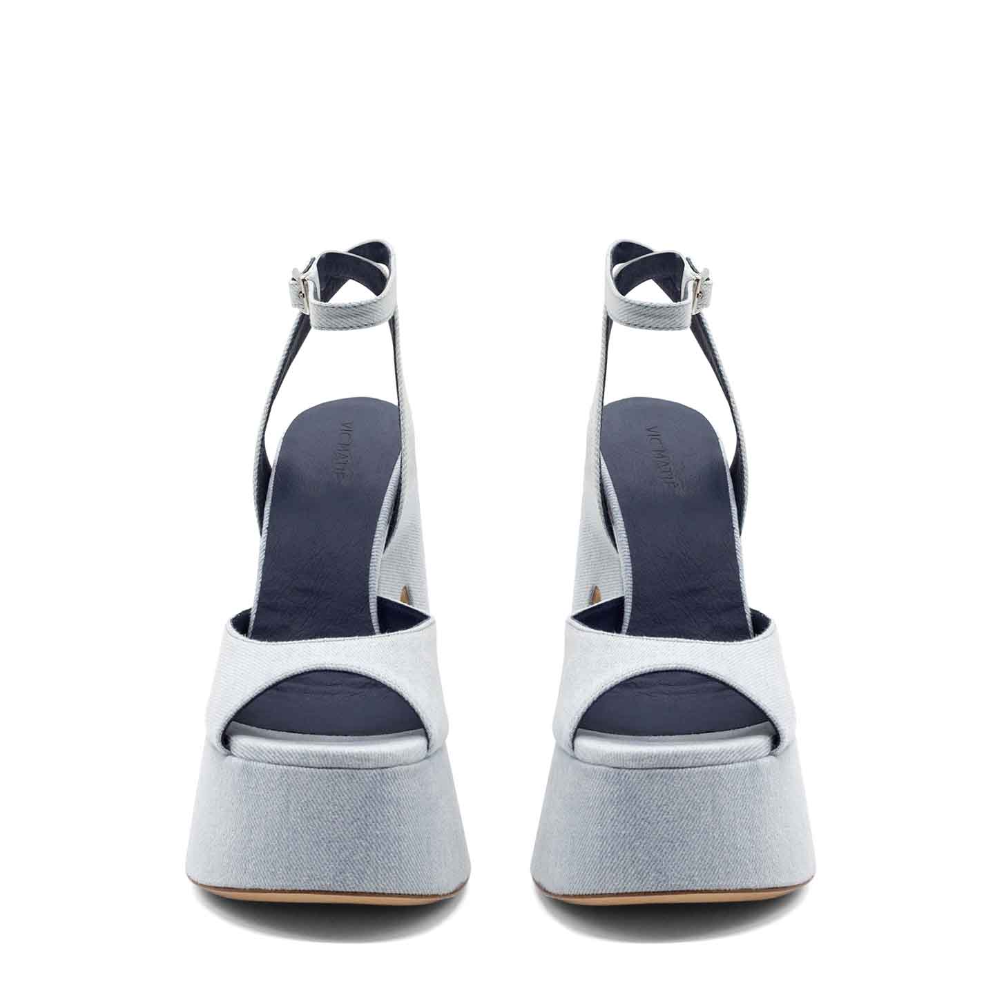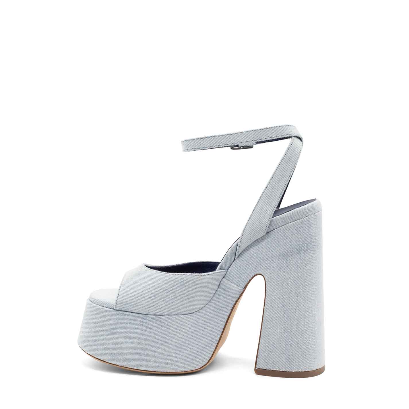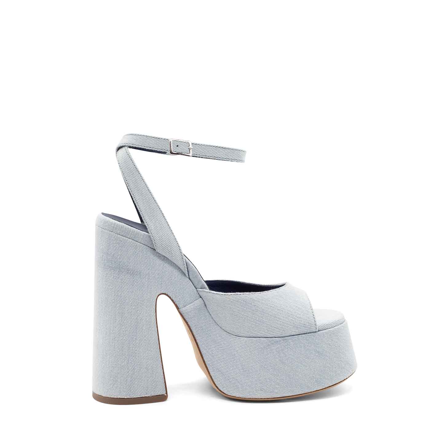 Flared sandals in sky-blue washed denim, with open toe and adjustable ankle strap. Leather sole and leather-covered, one-piece "flared" platform. Made in Italy.