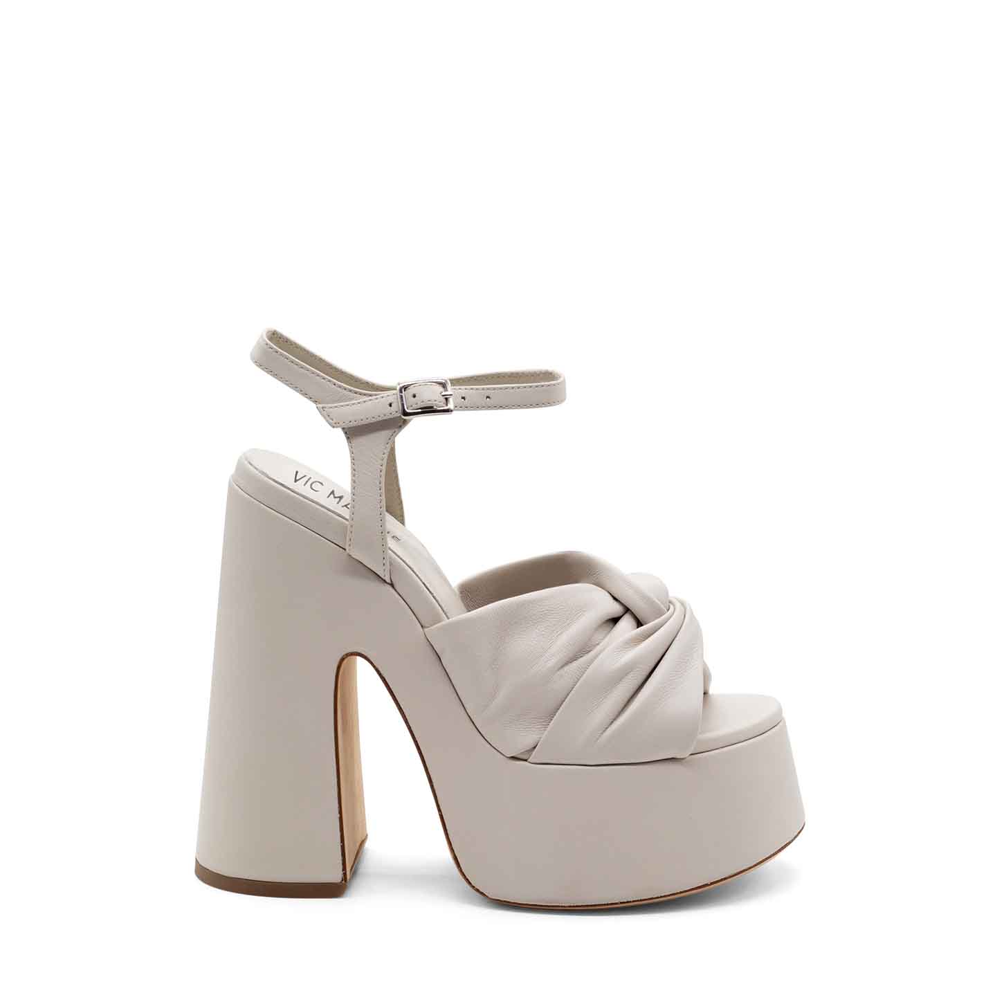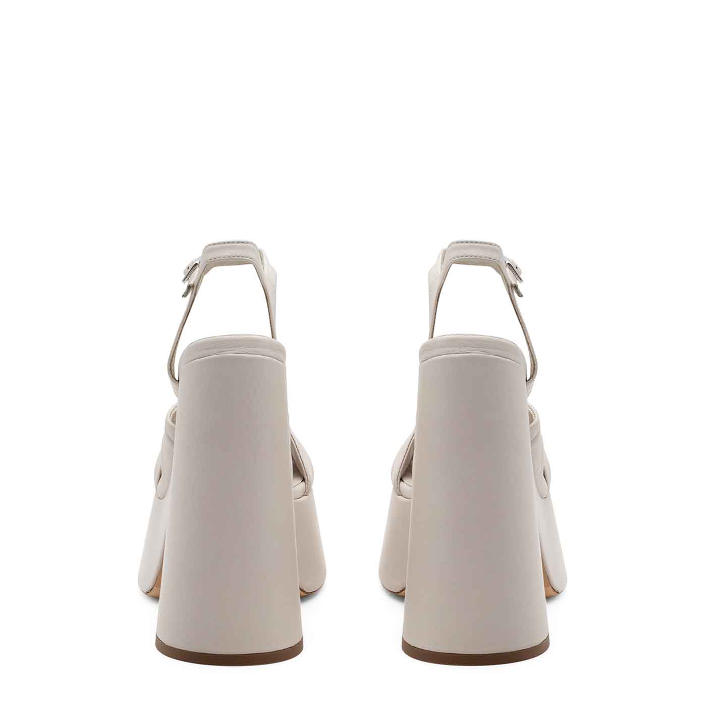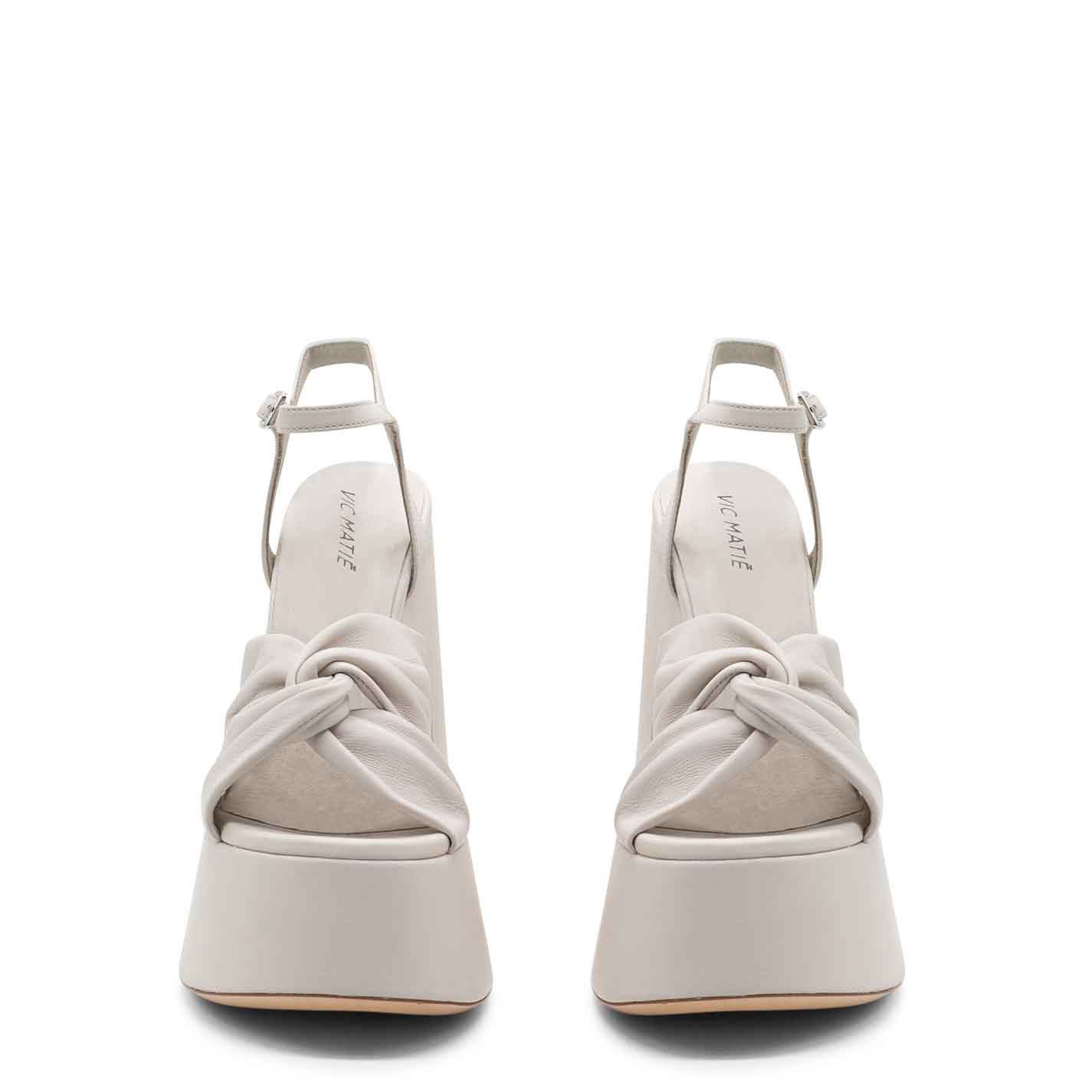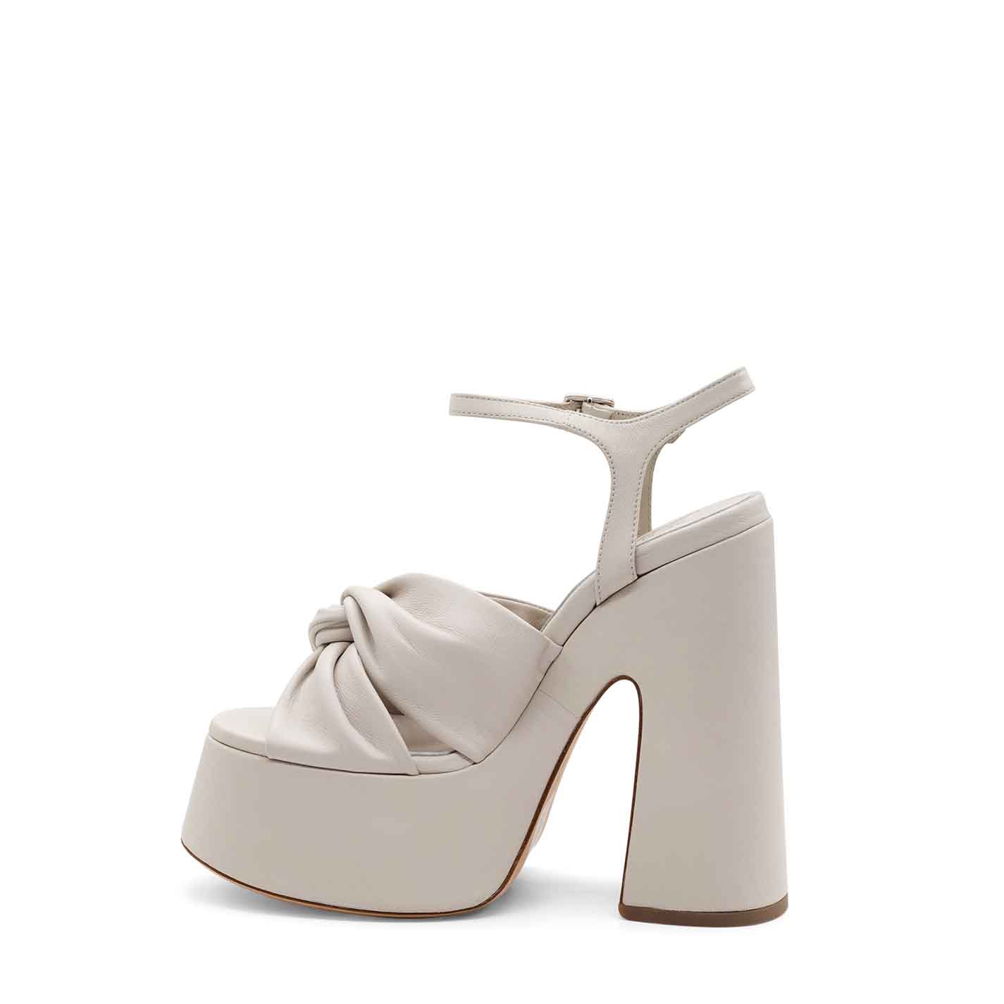 Flared sash sandals in soft ice-white nappa, with sash-like strips knotted at the front and adjustable ankle strap. Leather sole and leather-covered, one-piece "flared" platform. Made in Italy.