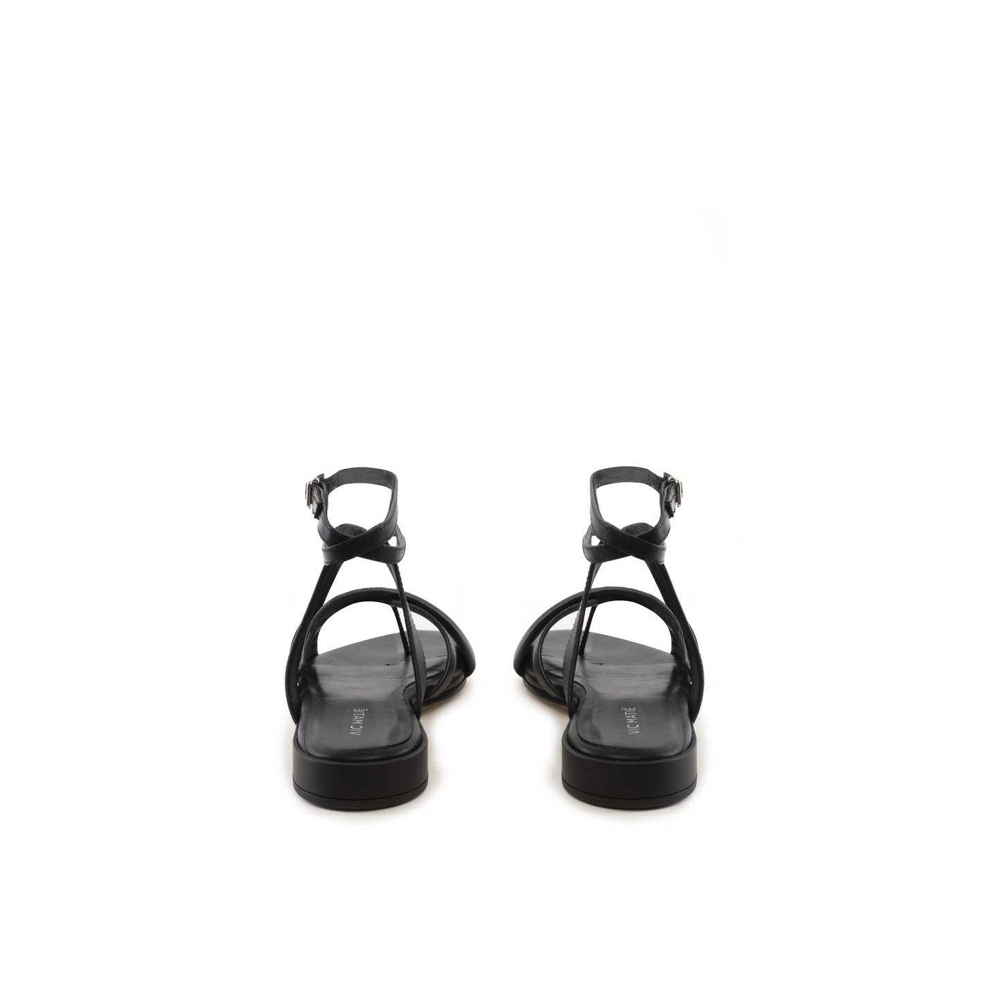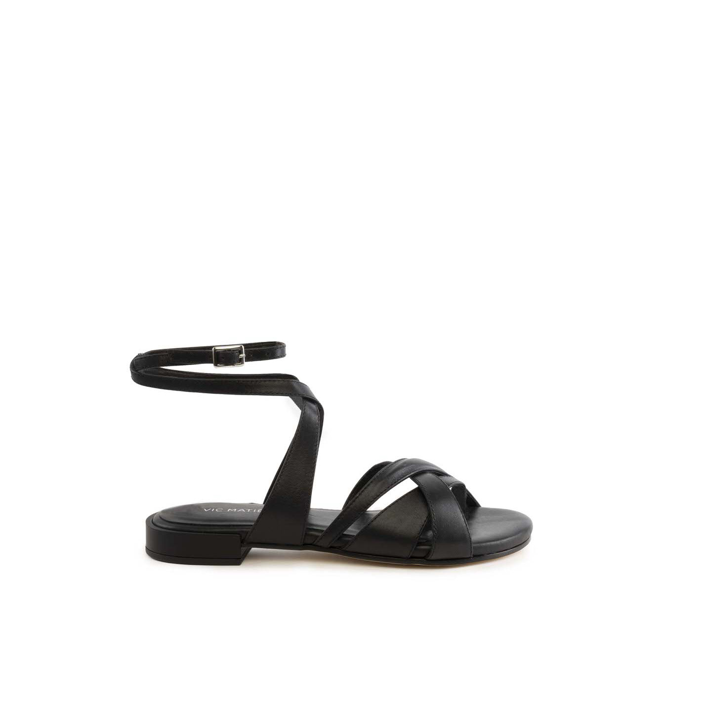 Flat black sandals in matte calfskin, with moulded criss-crossing bands at the front, curved detailing and adjustable ankle strap. Leather sole, comfortable leather-covered insole, and tone-on-tone matt coated heel. Made in Italy.