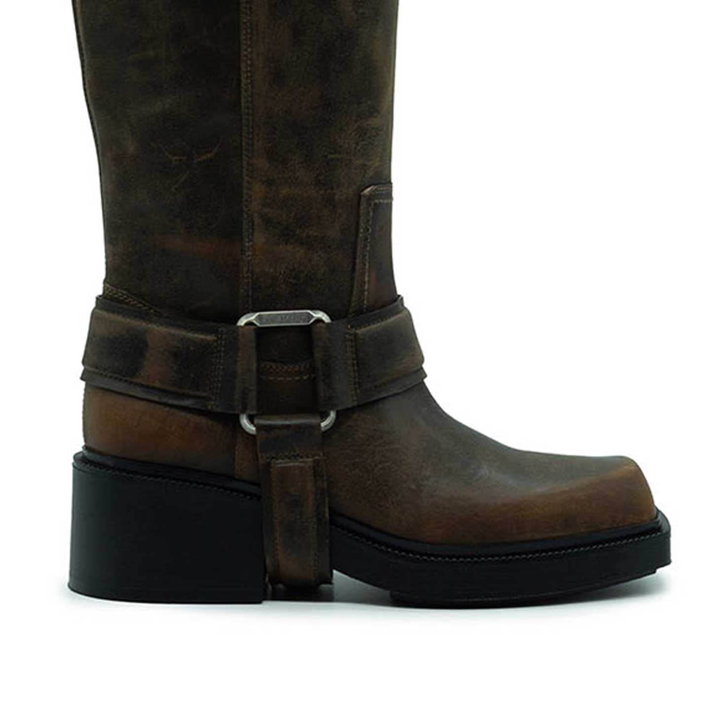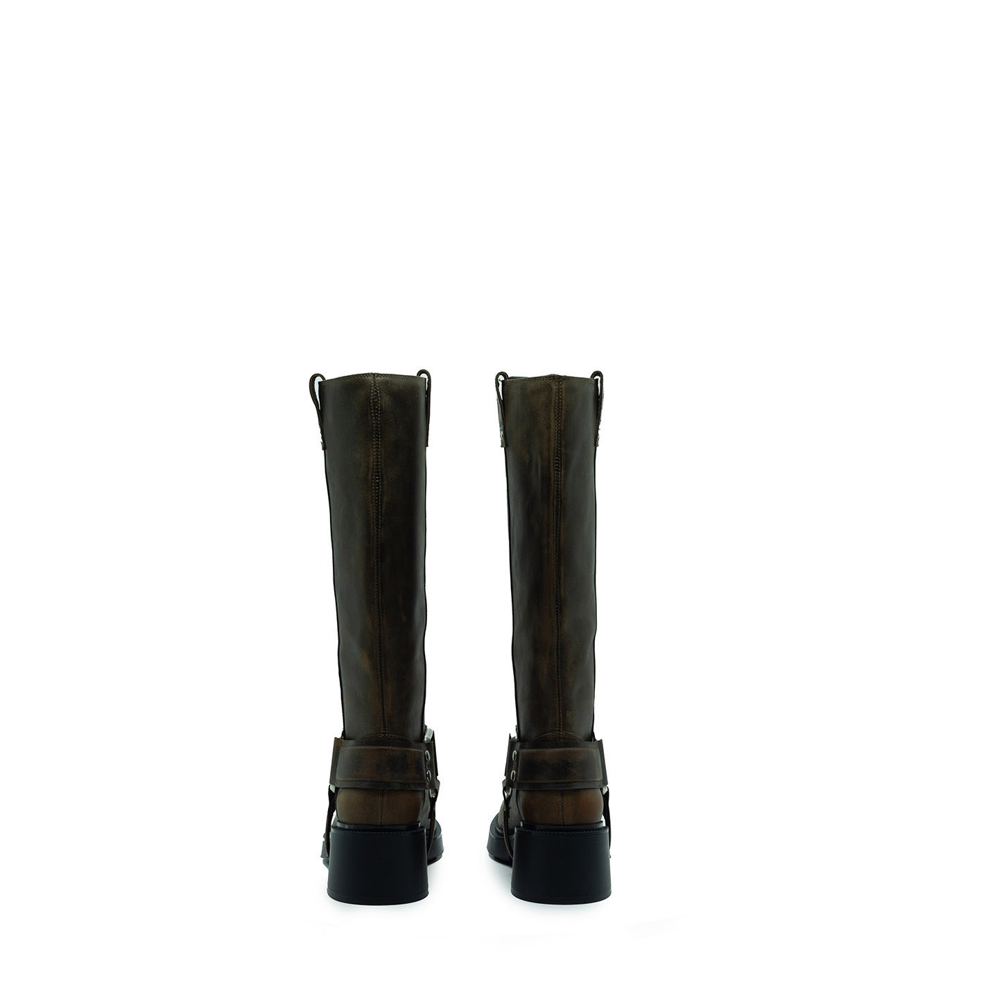Fray tan gaucho boots, crafted from vintage calfskin, with removable strap, squared loops and raised logos. This model is fitted with a bold rubber sole with non-slip outsole and a soft footbed covered in leather. Made in Italy.