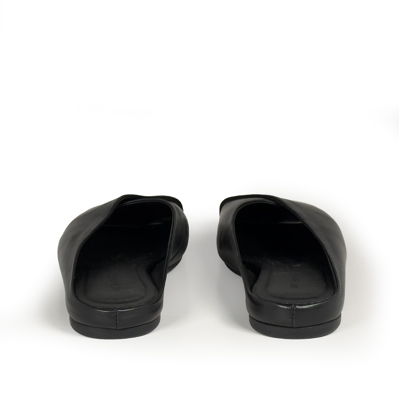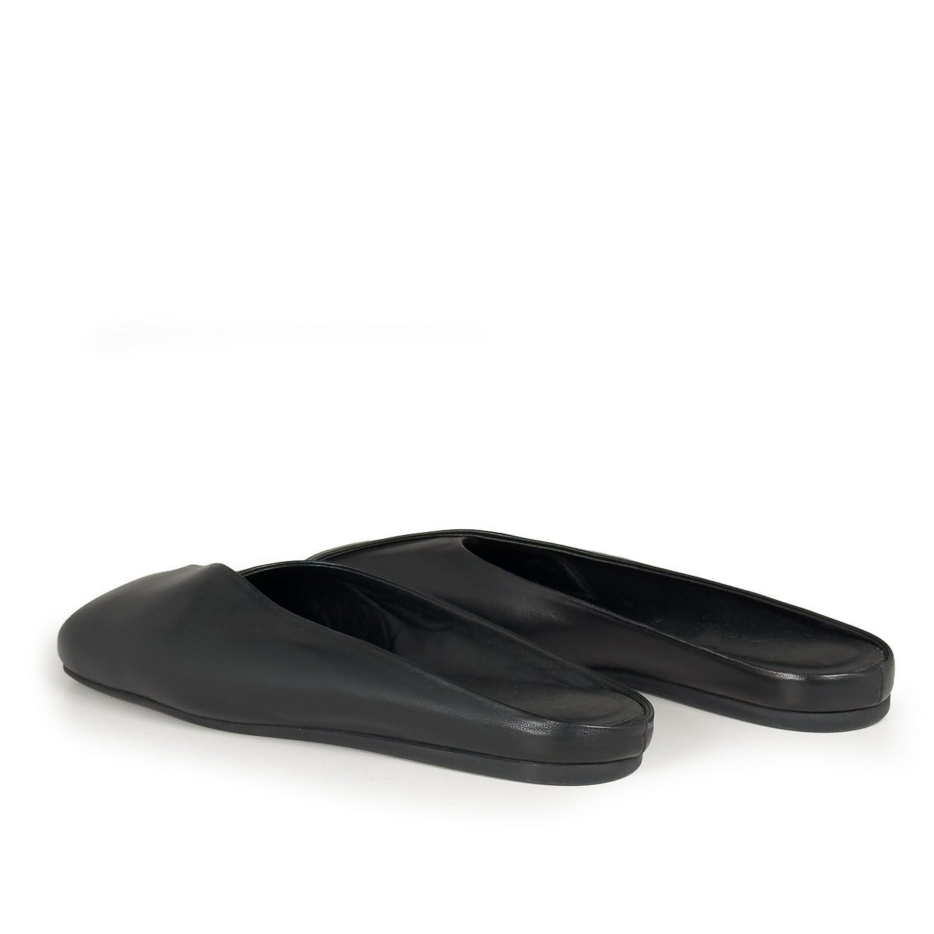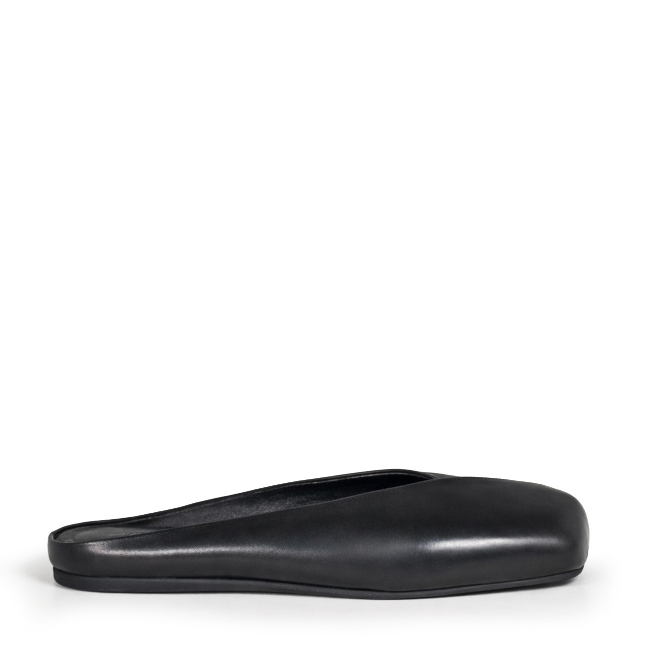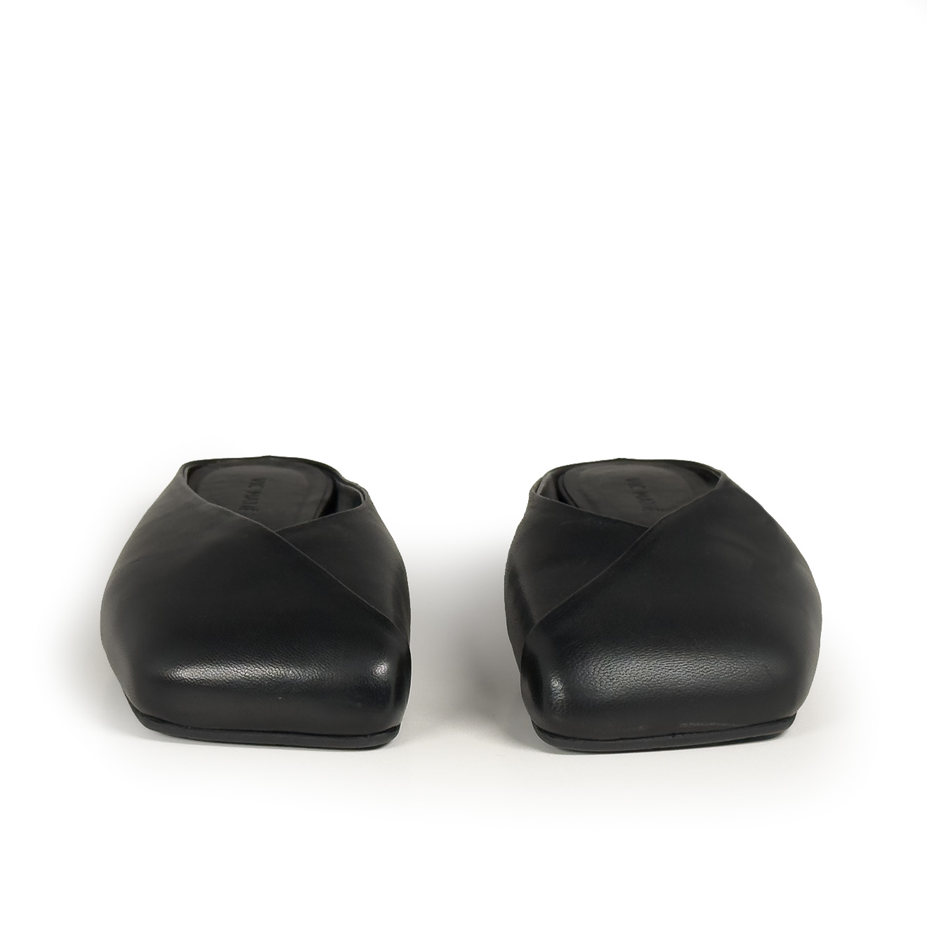 G34_Square closed_Black slipper, made of soft nappa leather with an asymmetrical vamp and diagonal pleat for an elegant and modern effect. Non-slip rubber sole with maxi logo and squared toe, leather comfort insole. Essential and refined design, ideal for chic everyday wear.