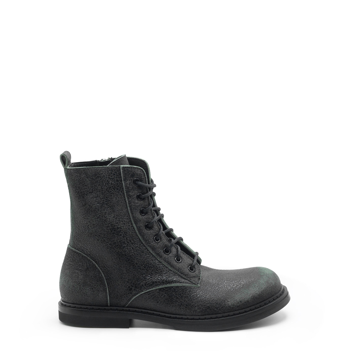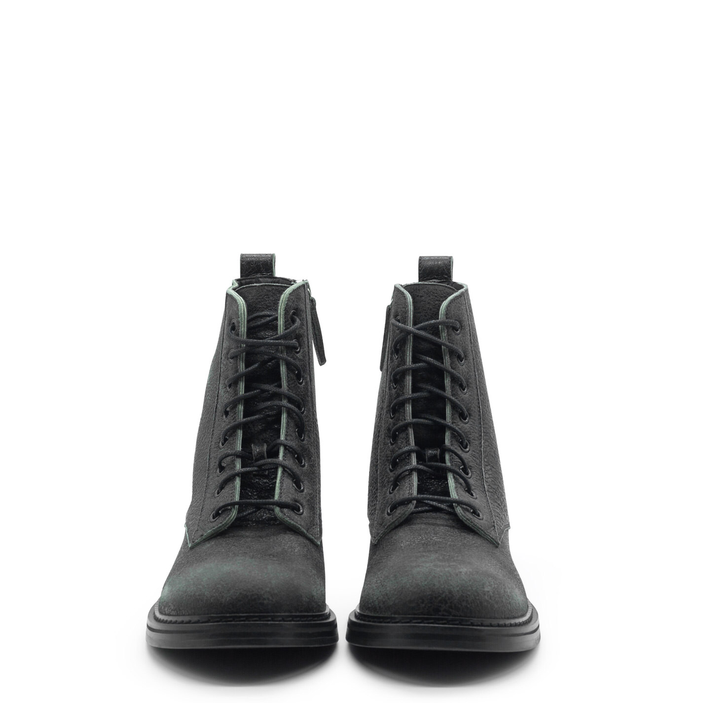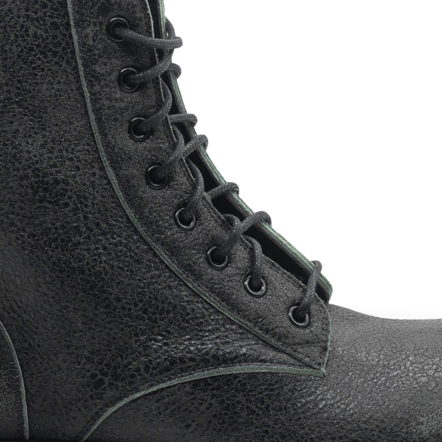 Gentleman black lace-up half boots, crafted from 1990s "punk-style" cracked-effect leather, with internal metal zip for easier fit. This model features a leather sole, and a soft footbed covered in calfskin. Made in Italy.