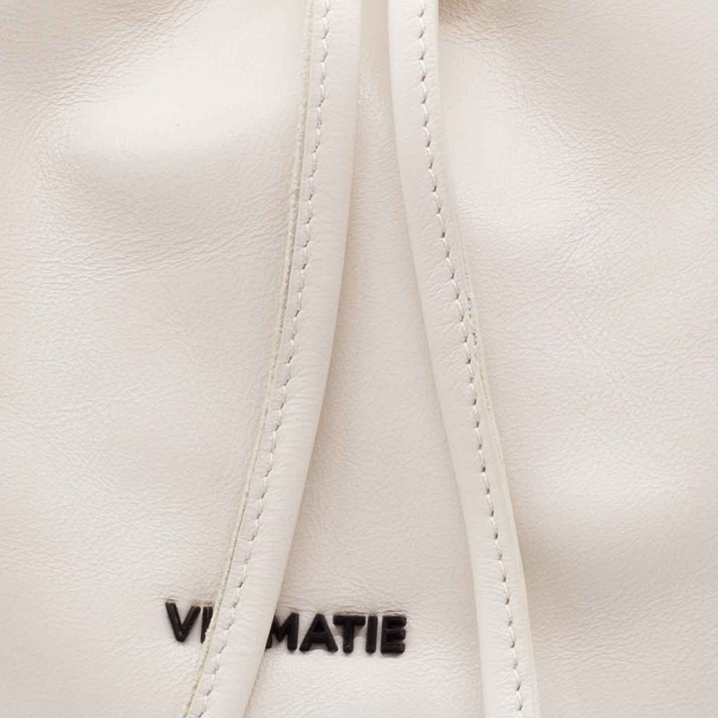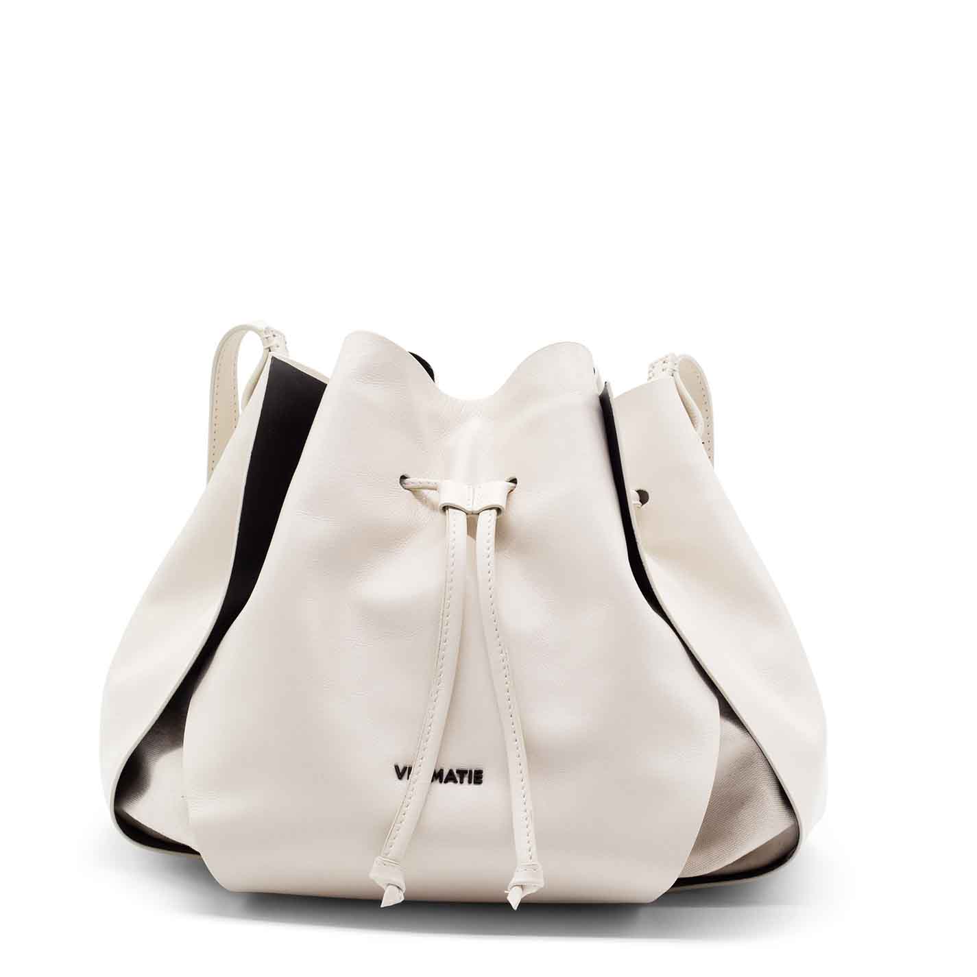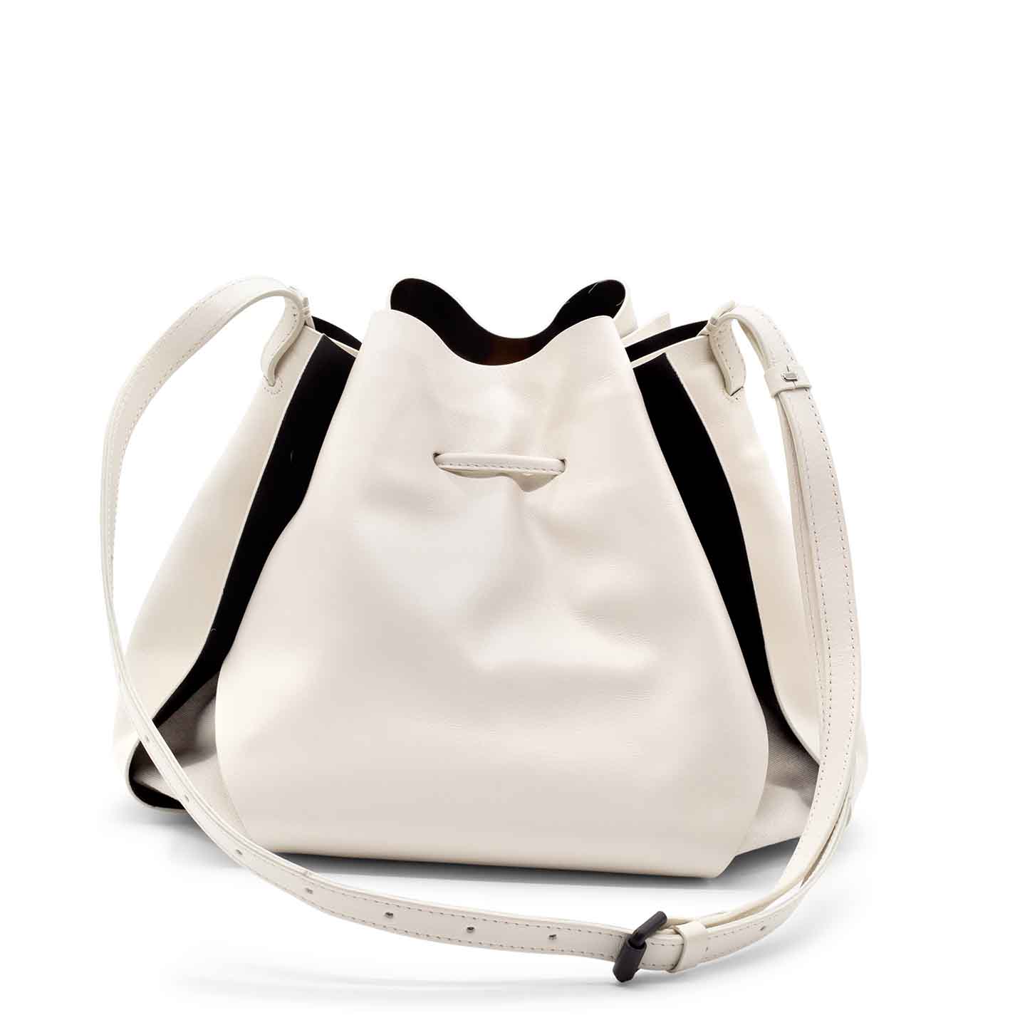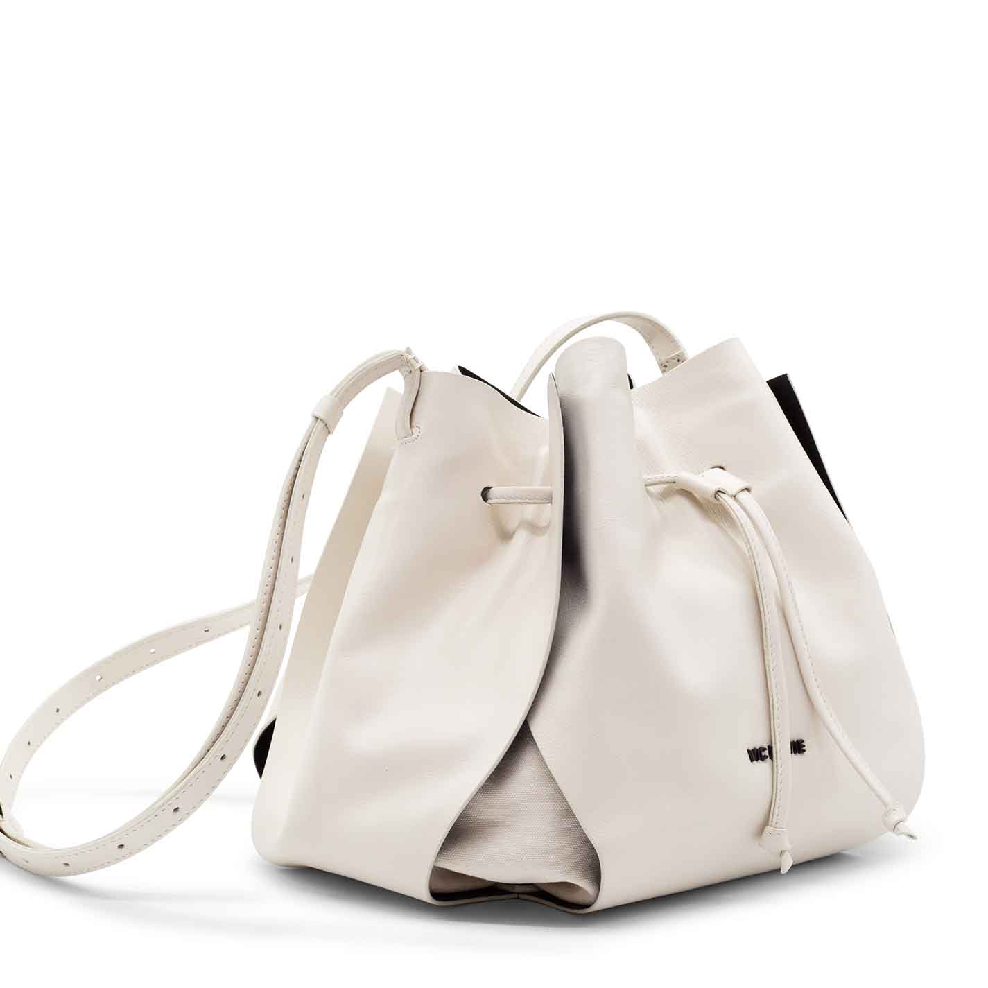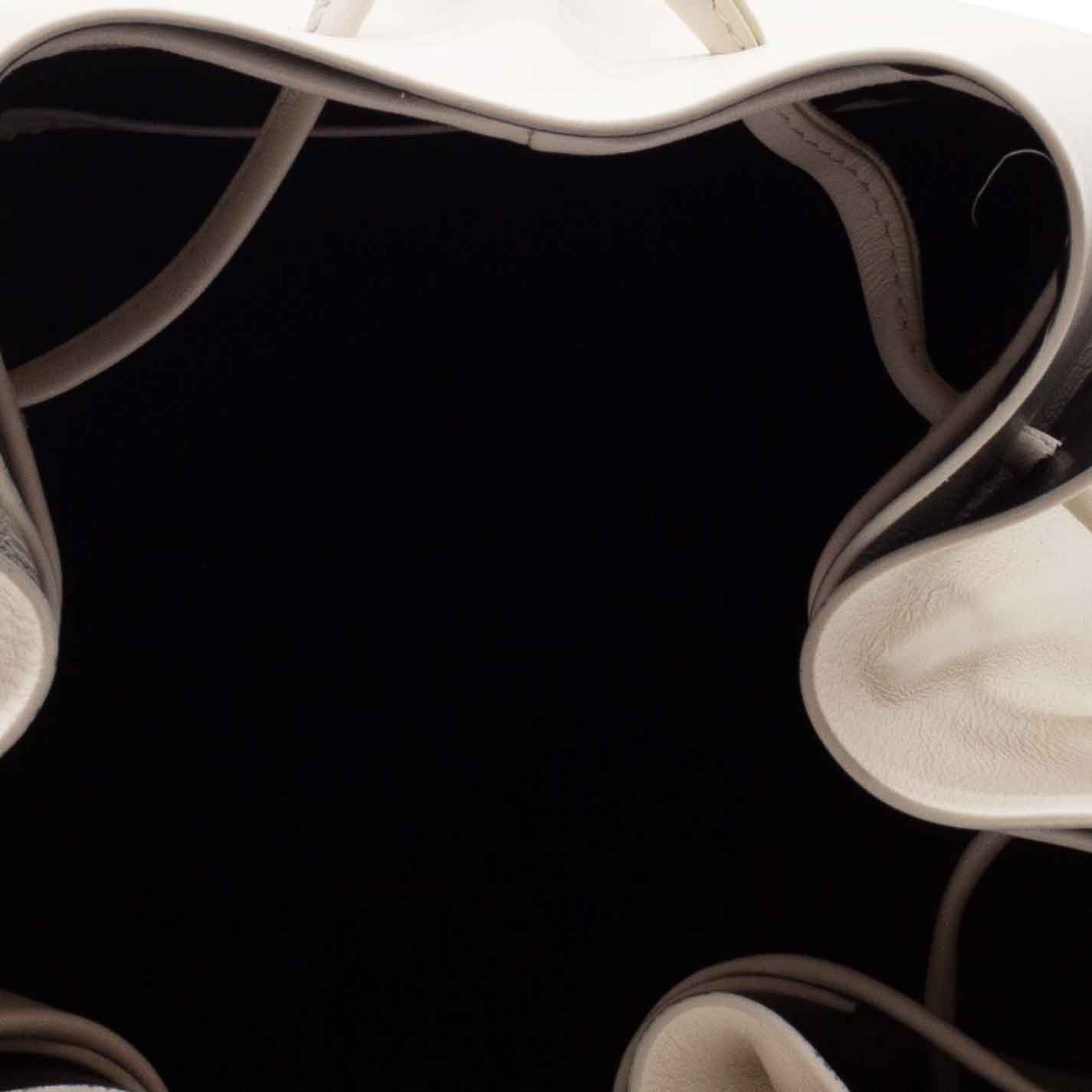 black/cream panel bucket bag in smooth, two-tone bonded calfskin and cotton canvas. Leather drawstring fastening, adjustable shoulder strap and metal logo on the front.
