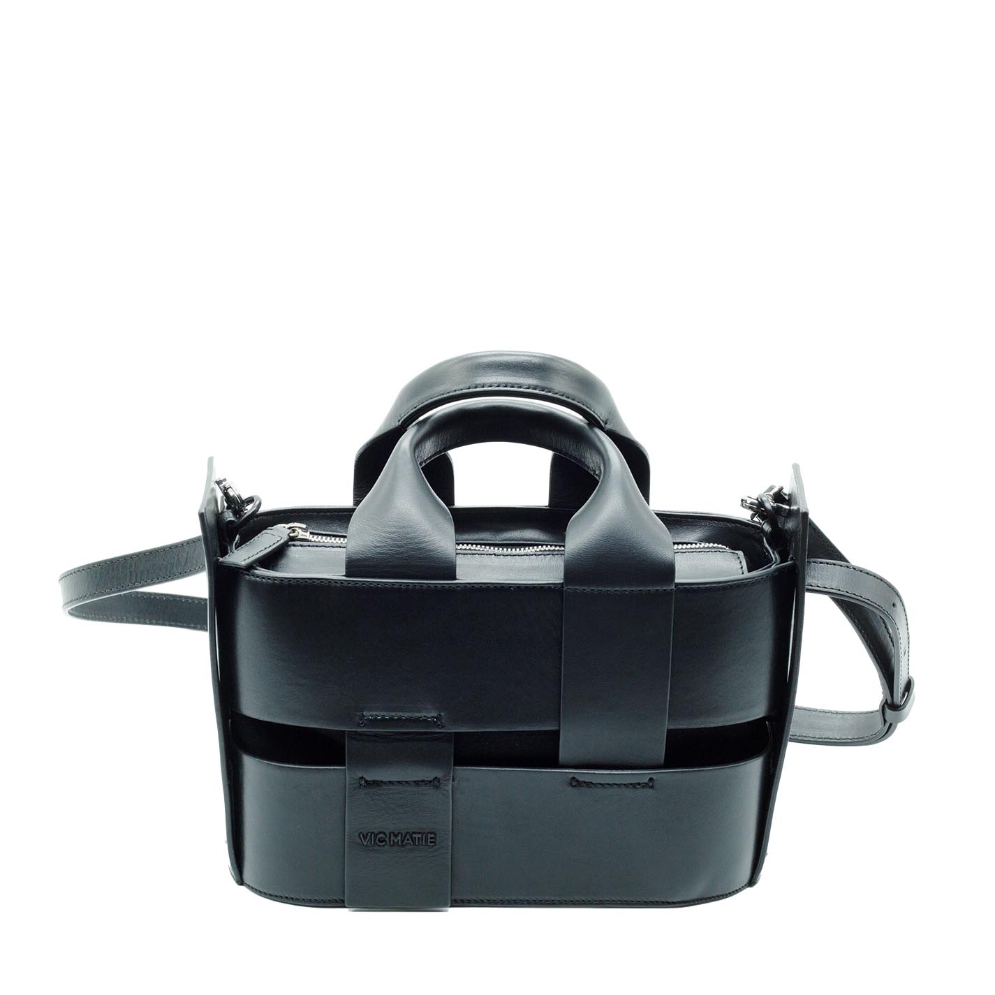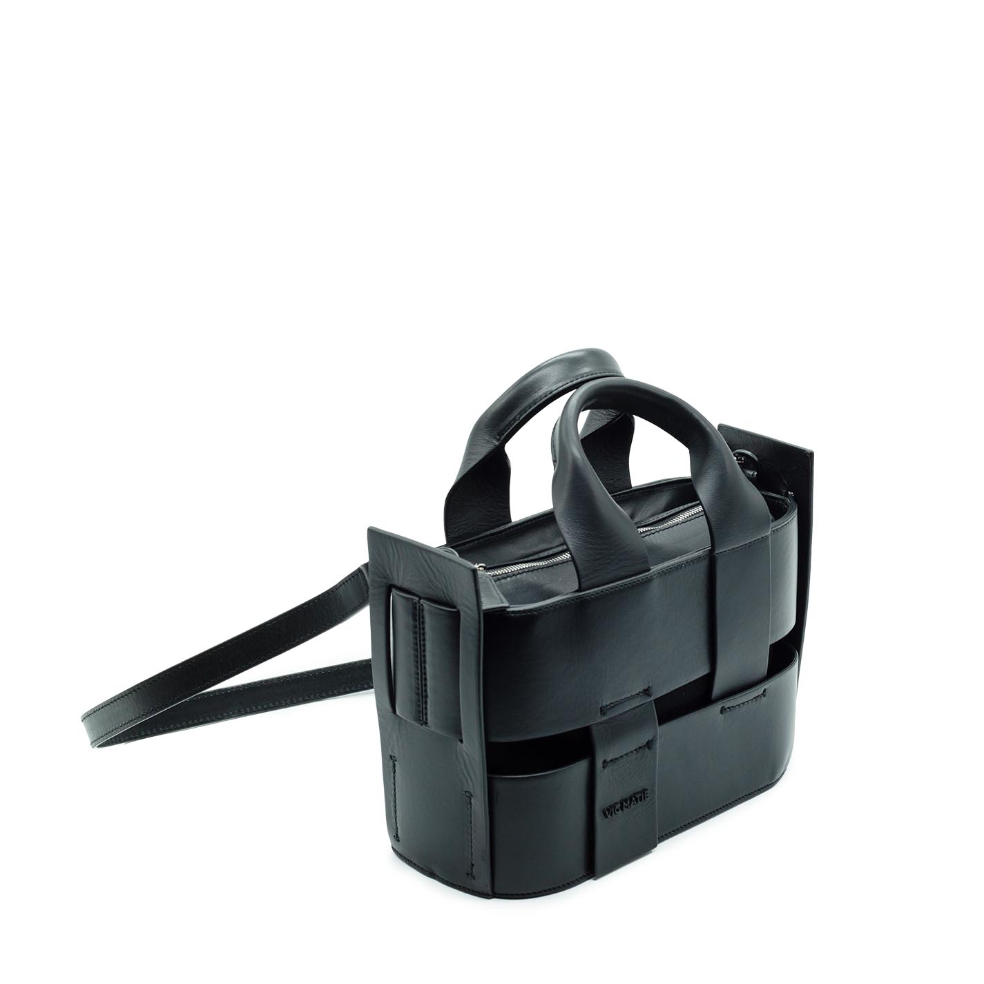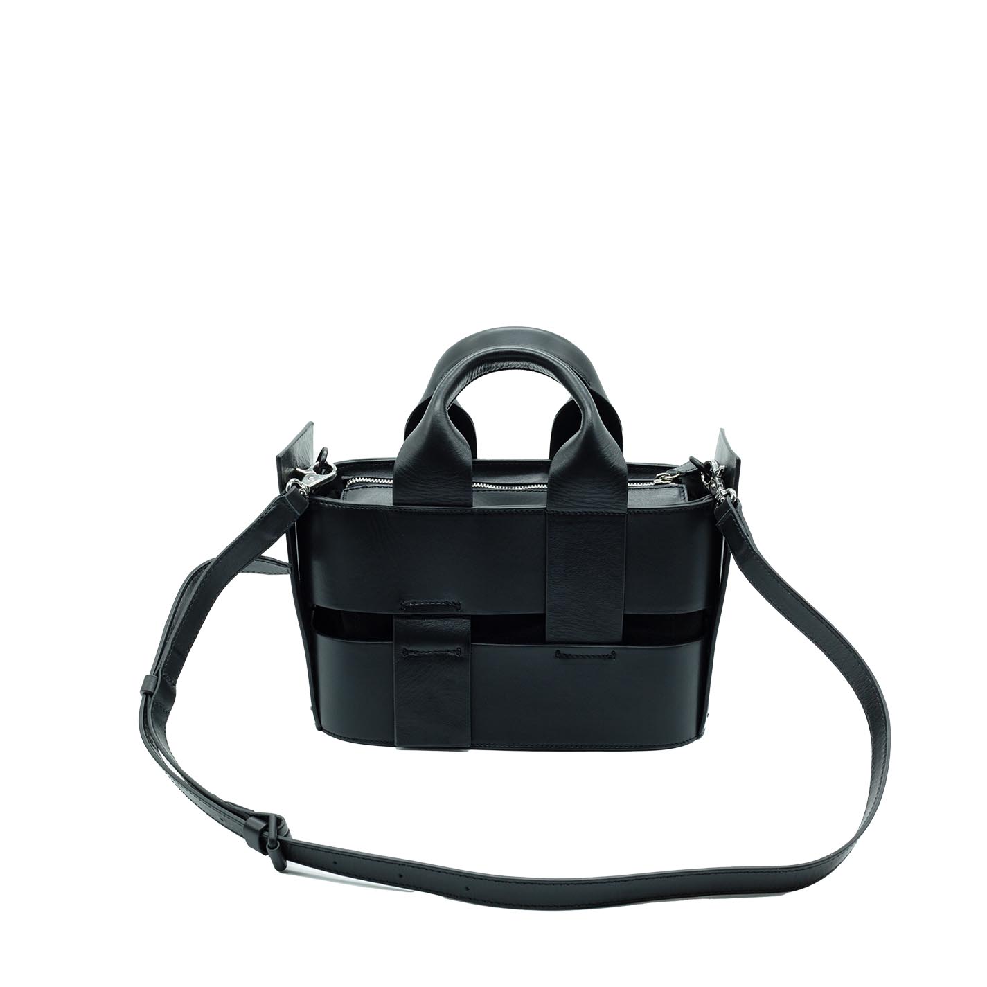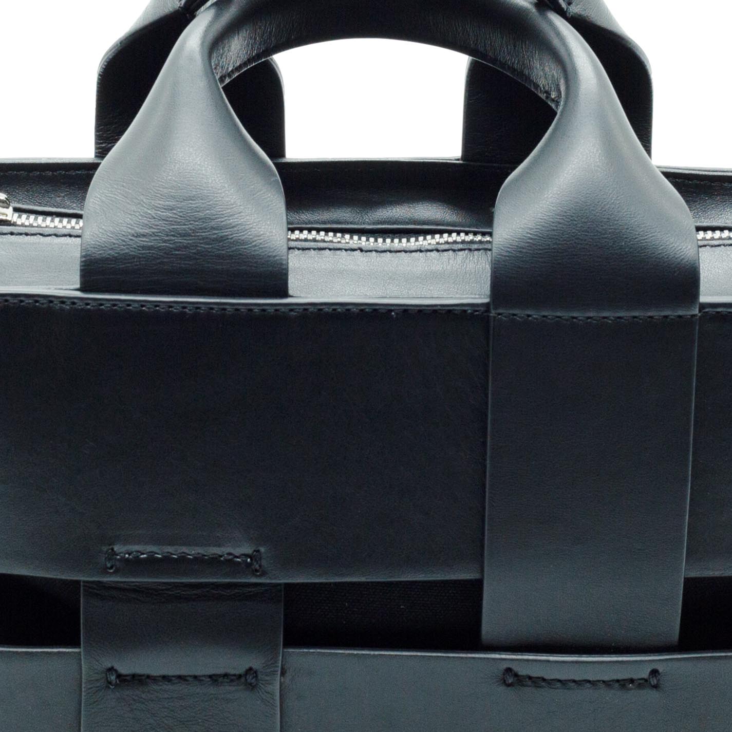 black oval bucket bag made from bonded strips of smooth calfskin and cotton canvas. Leather handles that intersect over the body of the back, metal zip fastening, adjustable and removable leather shoulder strap and metal logo on the front. Made in Italy.