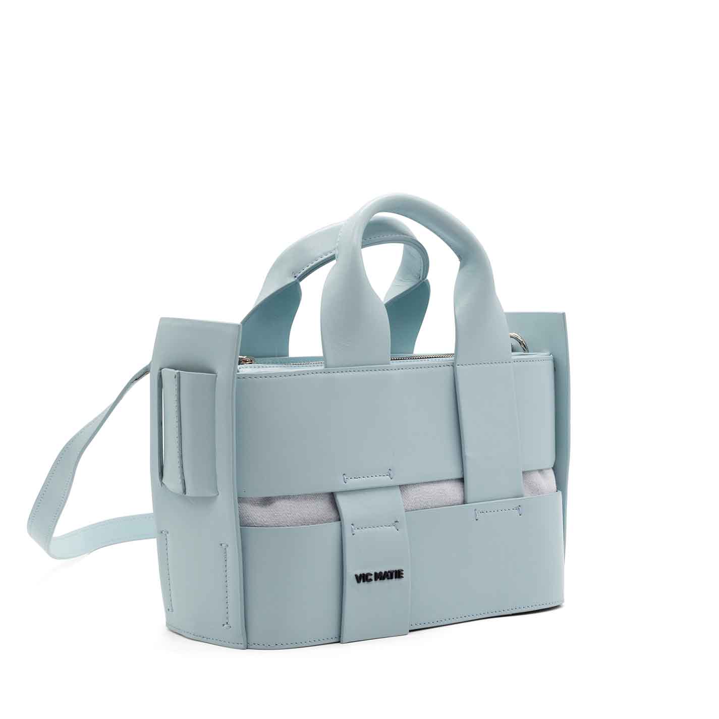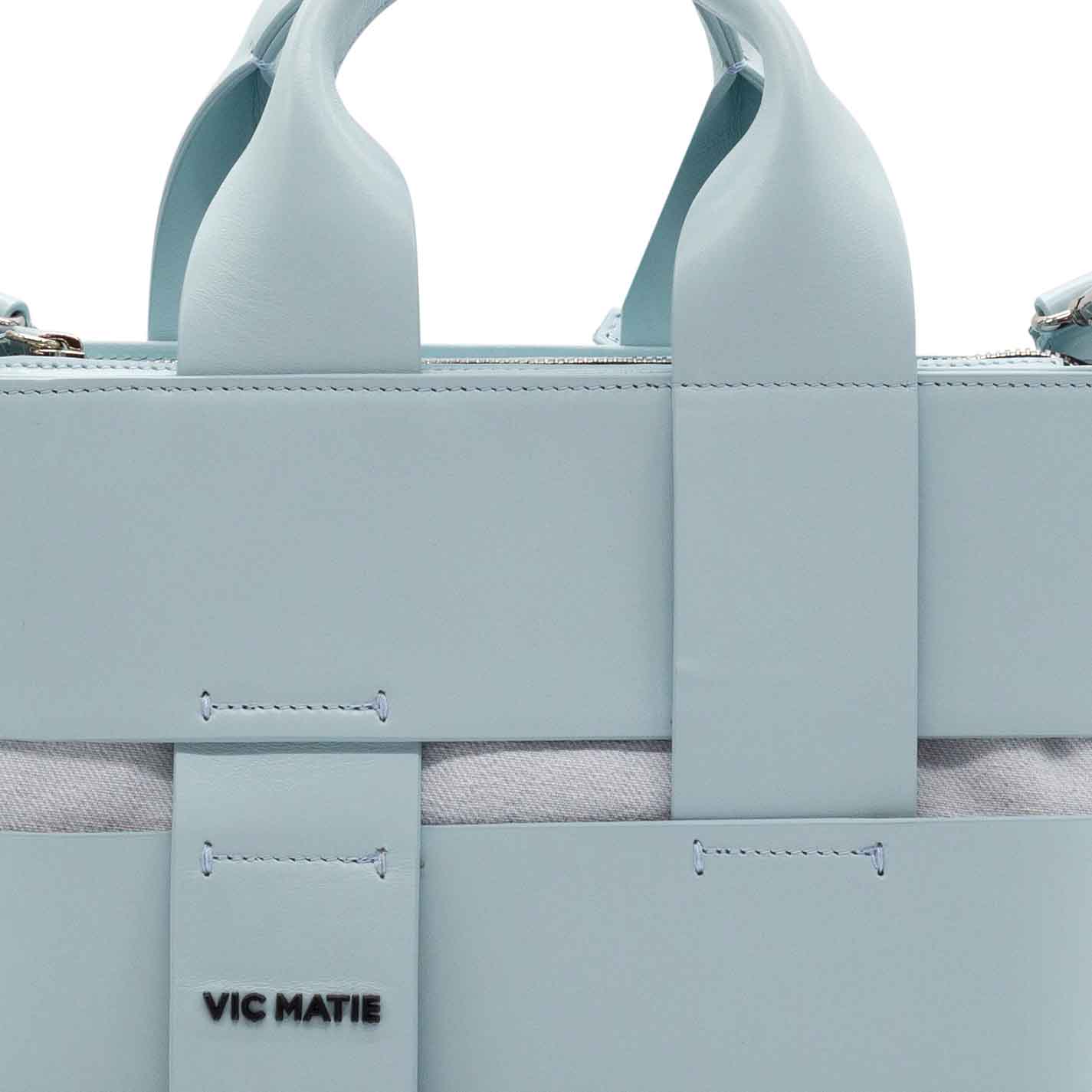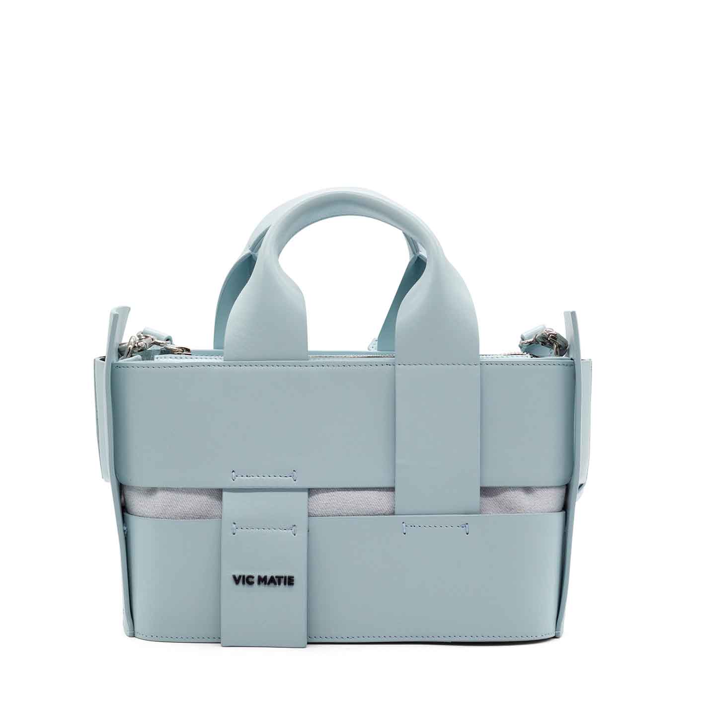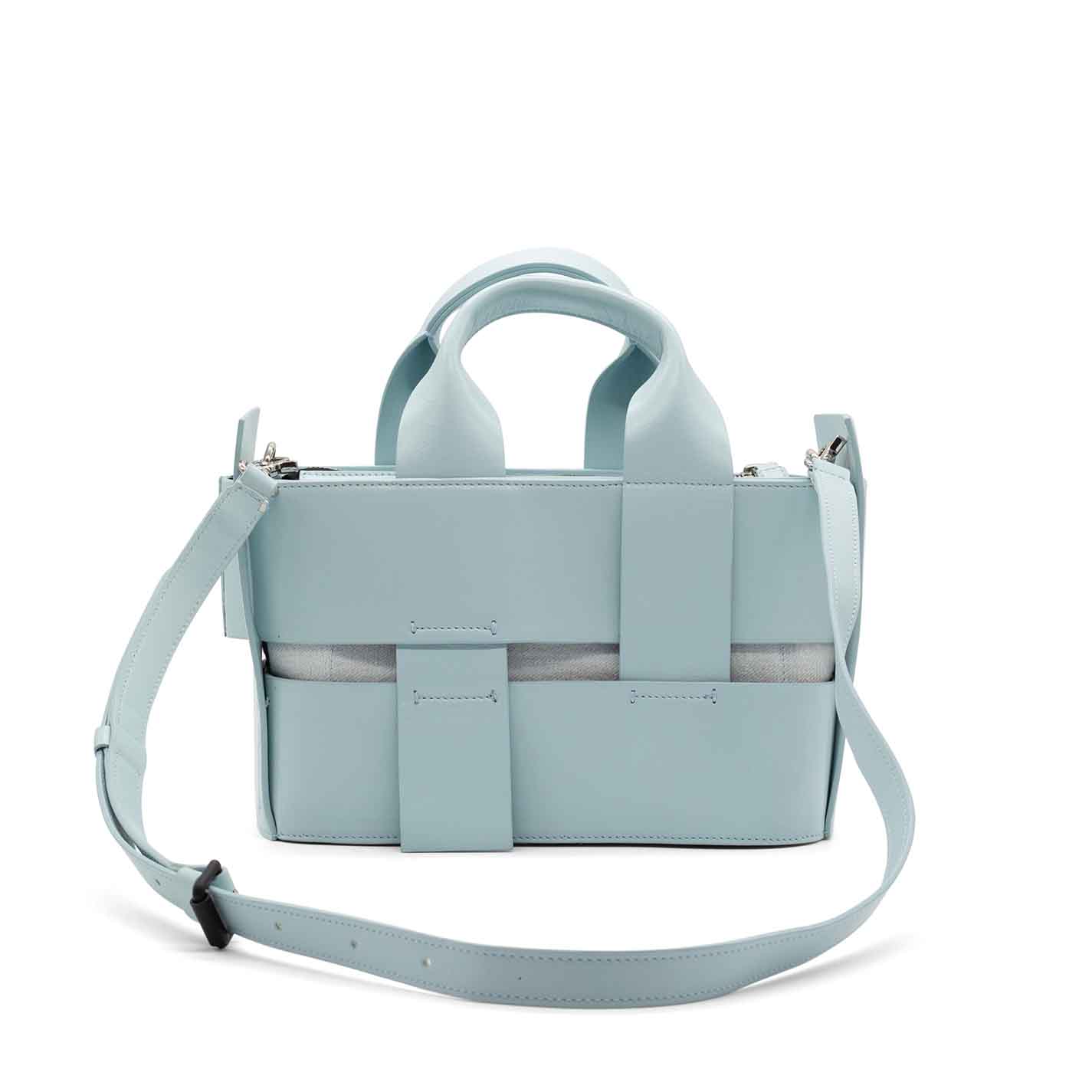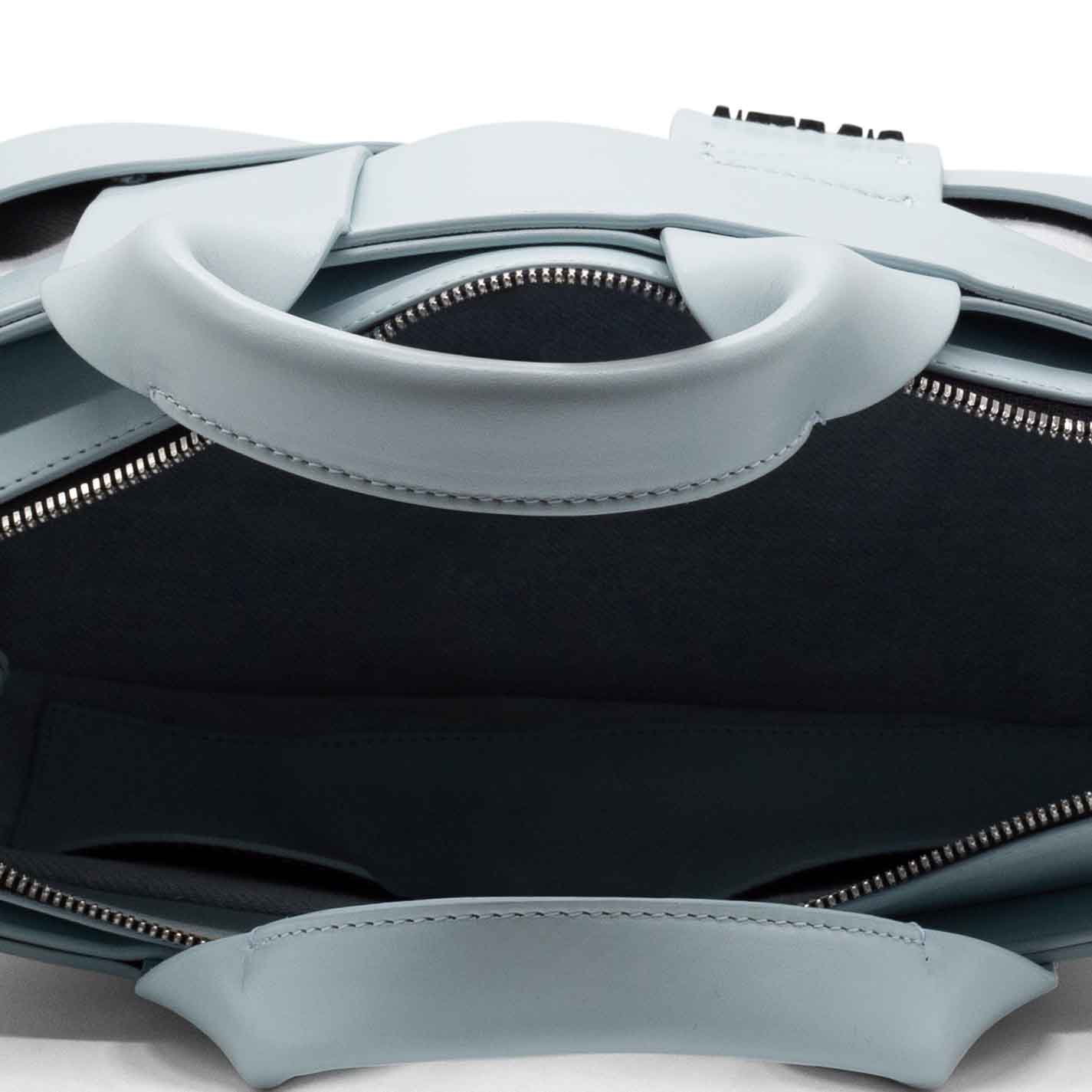 sky-blue oval bucket bag made from bonded strips of smooth calfskin and cotton canvas. Leather handles that intersect over the body of the back, metal zip fastening, adjustable and removable leather shoulder strap and metal logo on the front. Made in Italy.