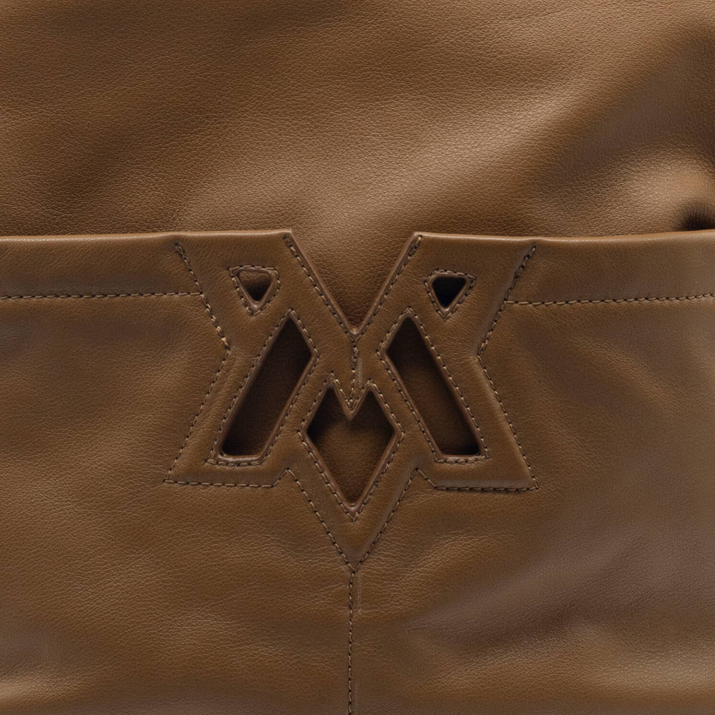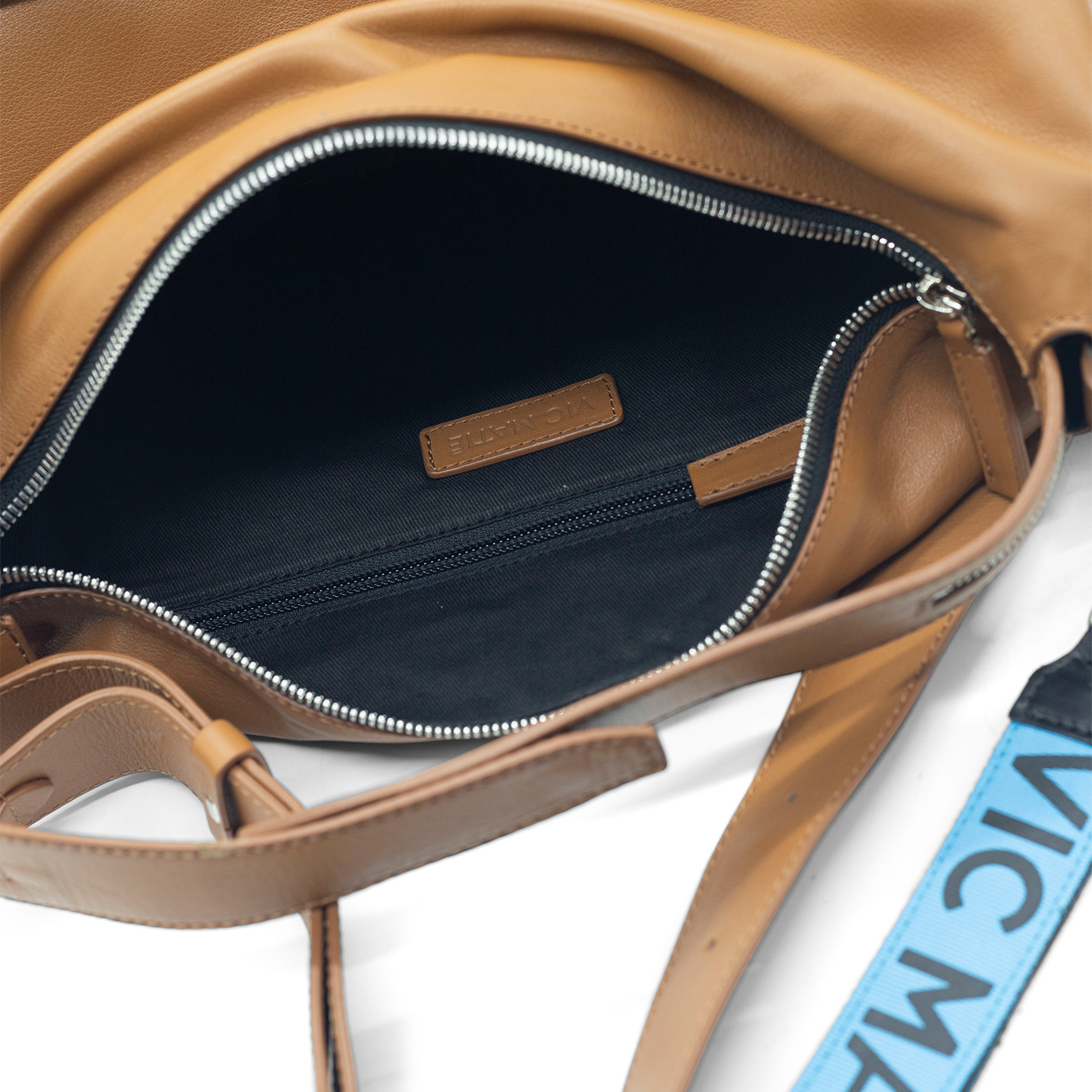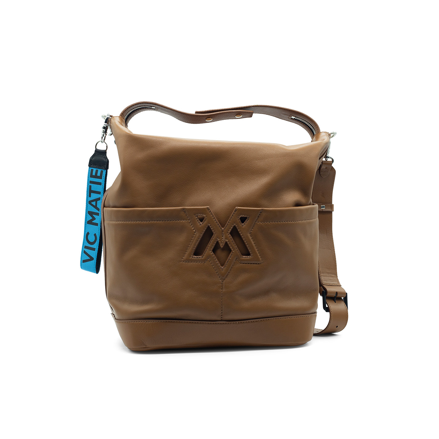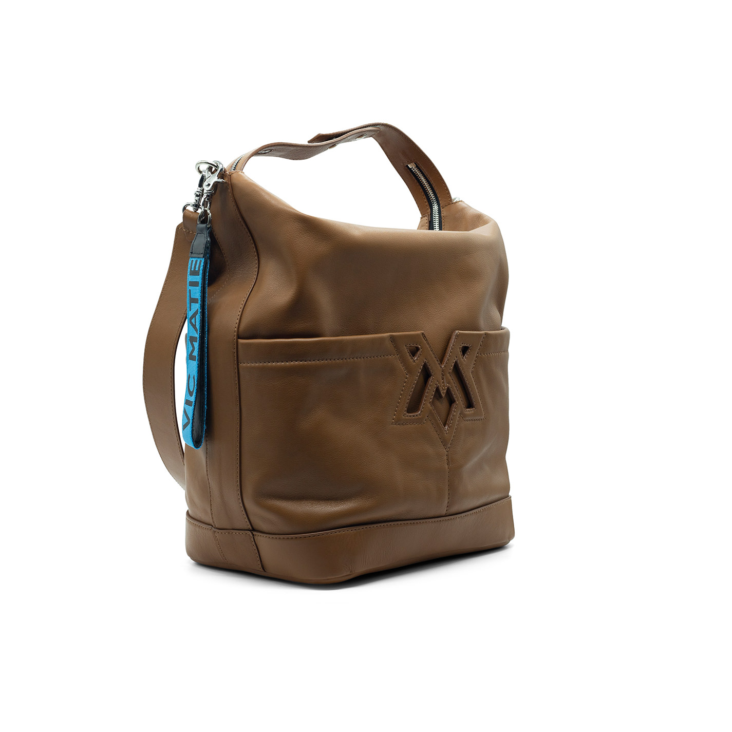 Leather bagin soft calfskin, with embroidered monogram on the front pocket: Metal zip closure and openable handle. Detachable and adjustable leather shoulder strap. Logoed keyring supplied.