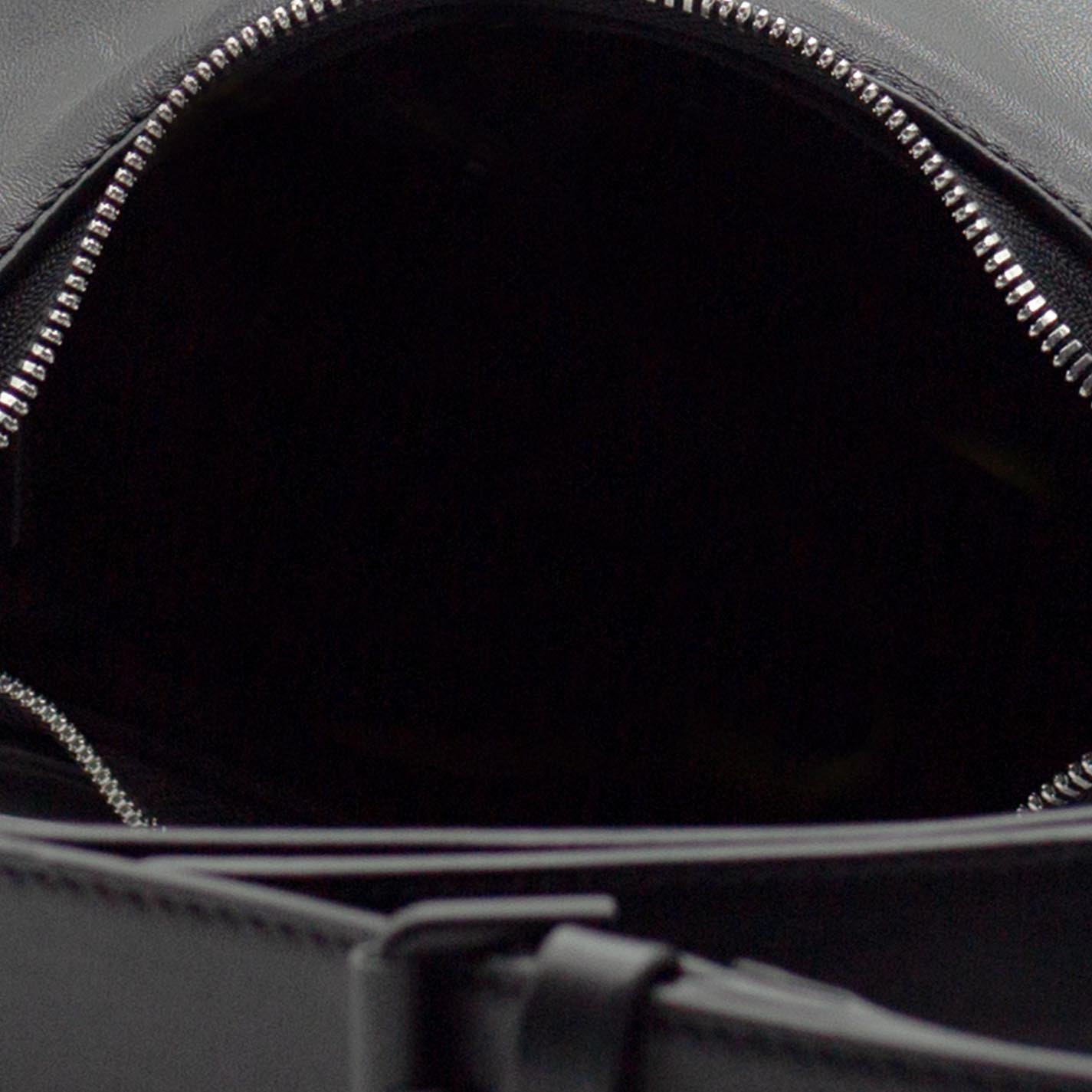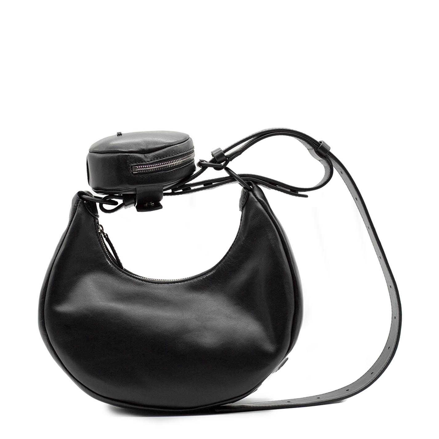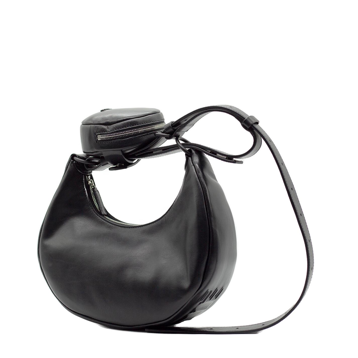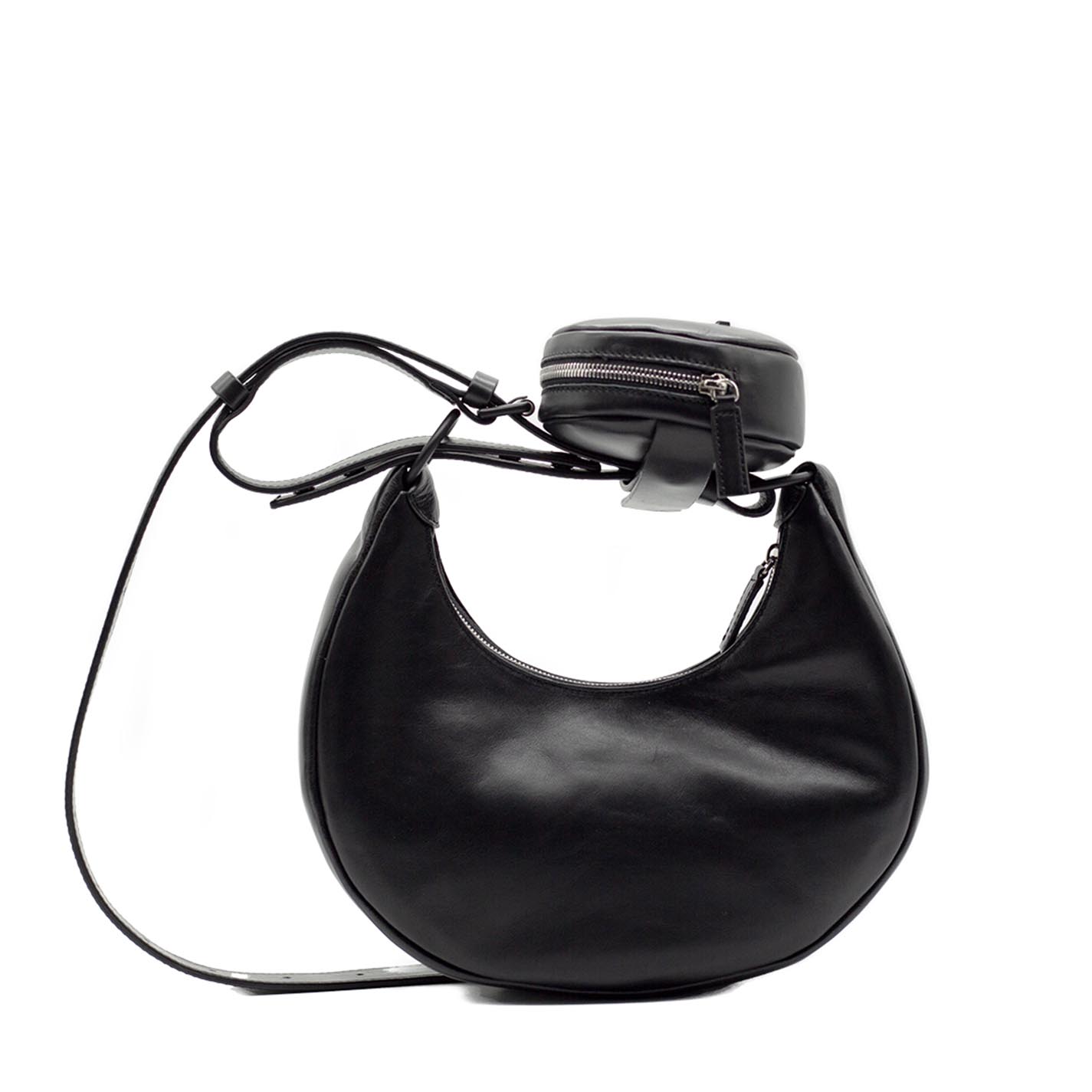 Black crossbody bag in smooth, structured calfskin, with 3D logo at the bottom. Adjustable and removable shoulder strap, and metal zip fastening. Removable, branded round pouch that you can carry on your wrist thanks to the wristlet included.