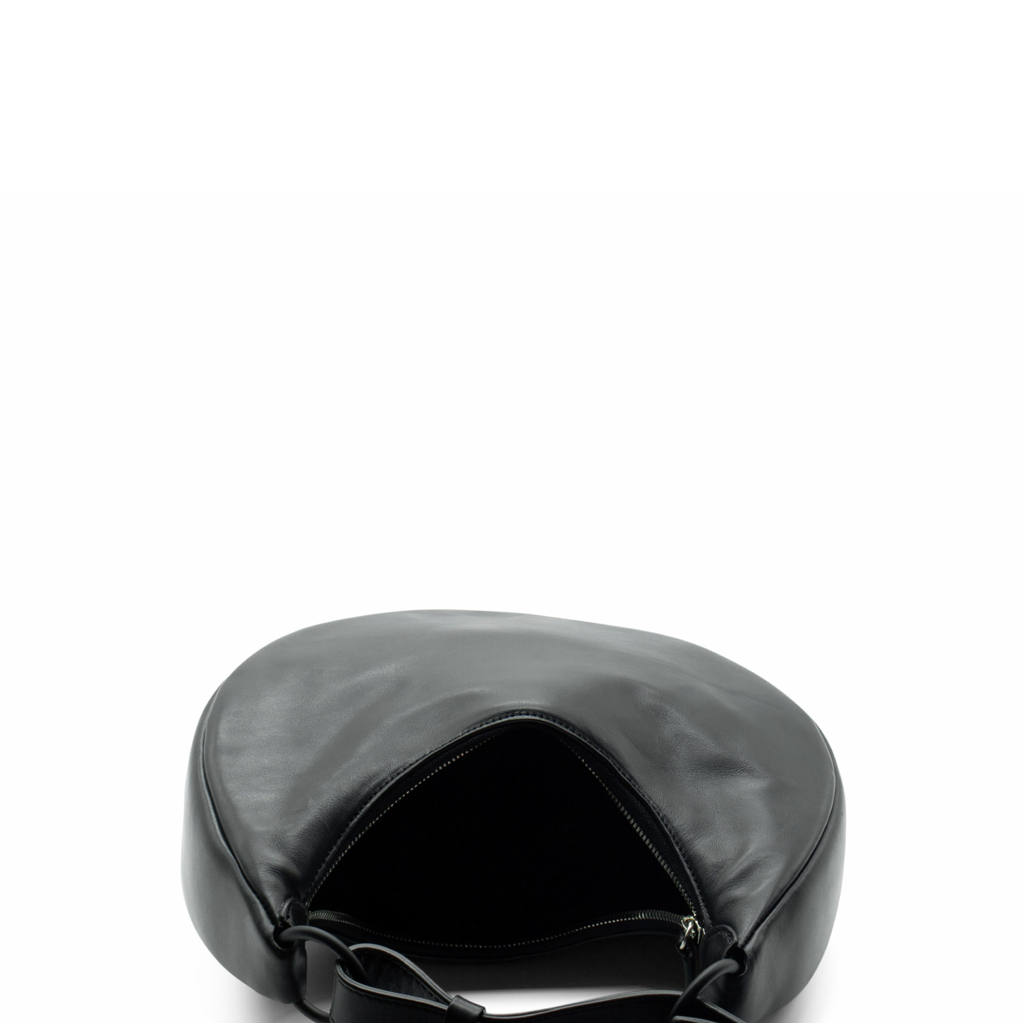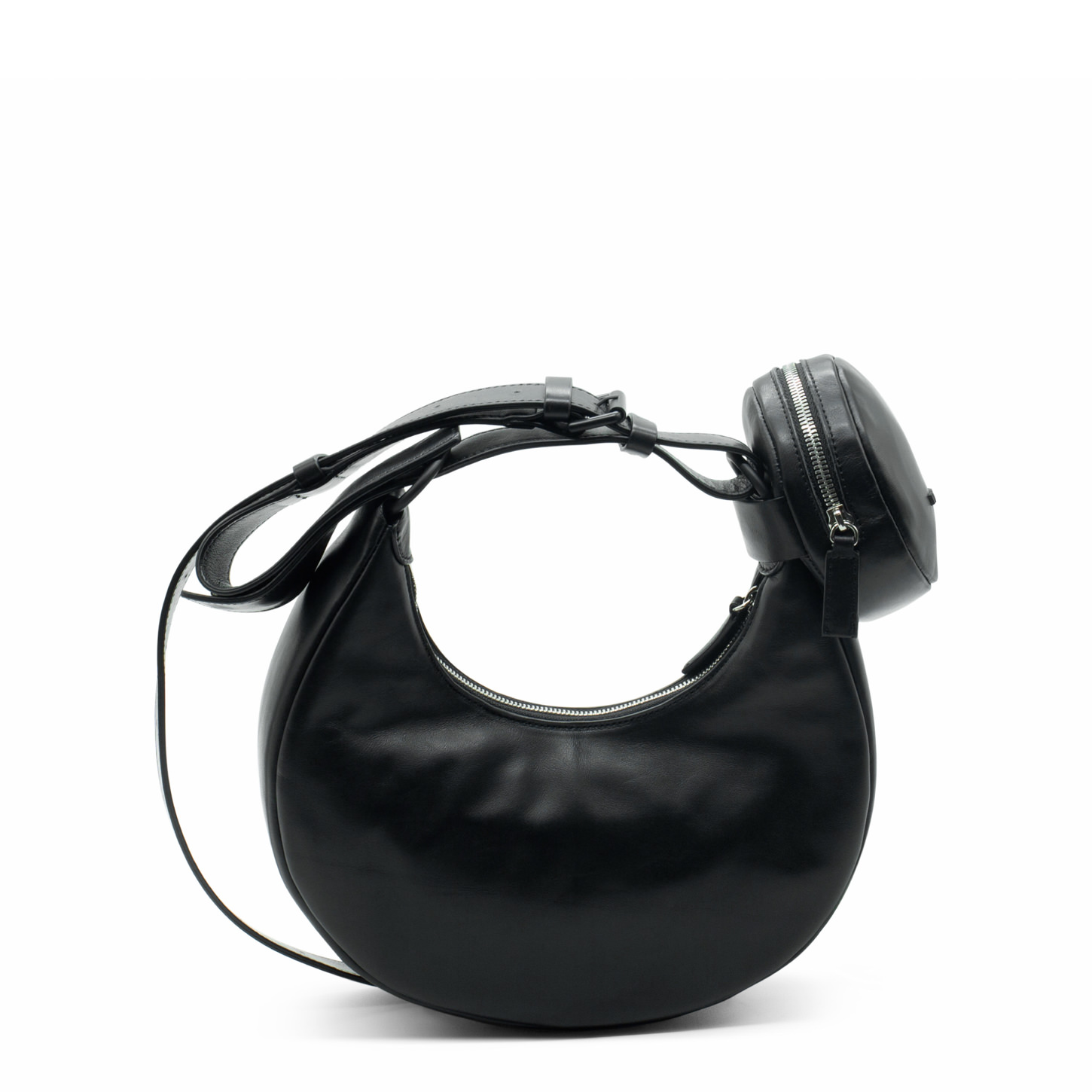 Black shoulder bag, crafted from textured smooth calfskin, with 3D logo on the bottom. It features adjustable and removable shoulder strap, metal zip fastening, and round branded detachable coin purse with wrist strap.