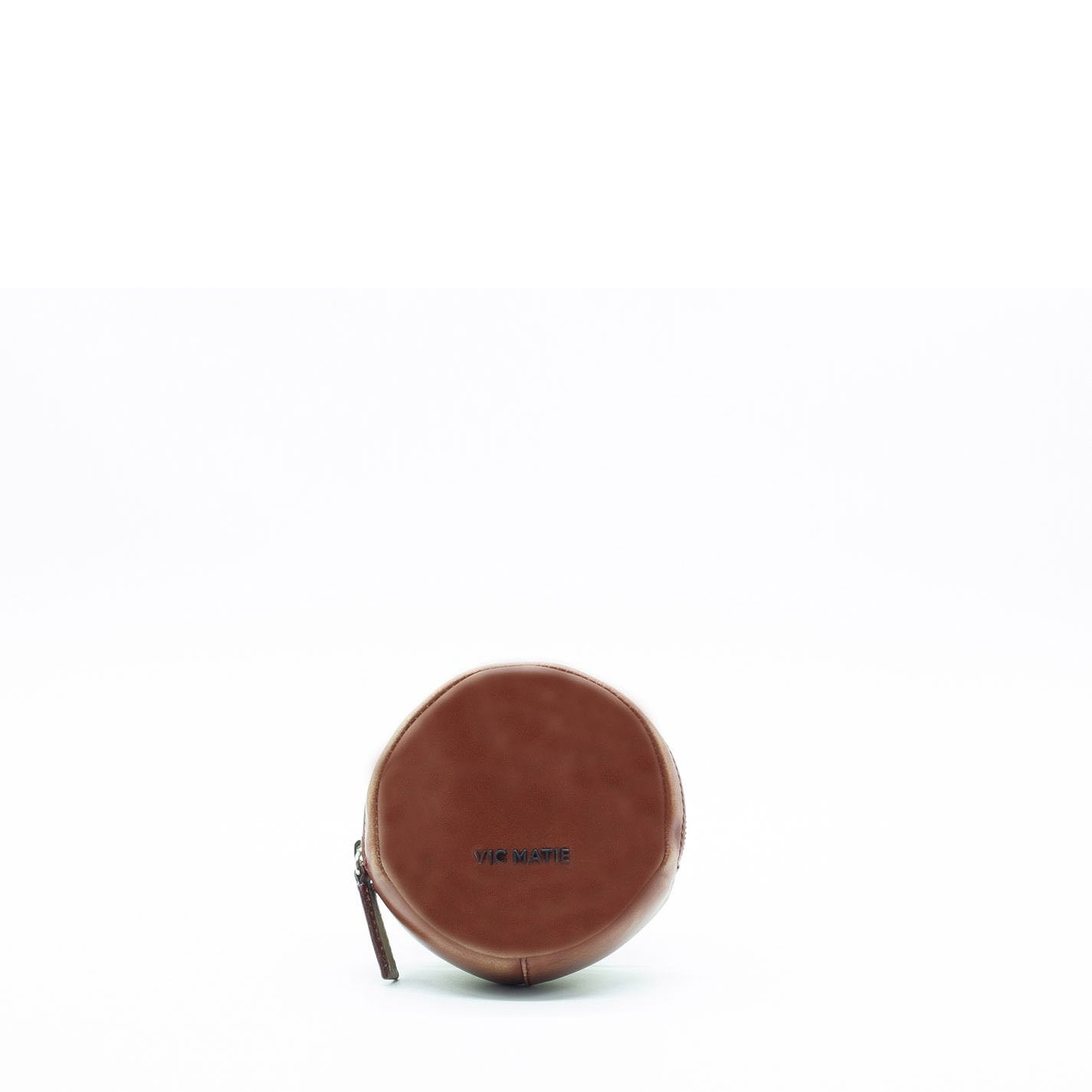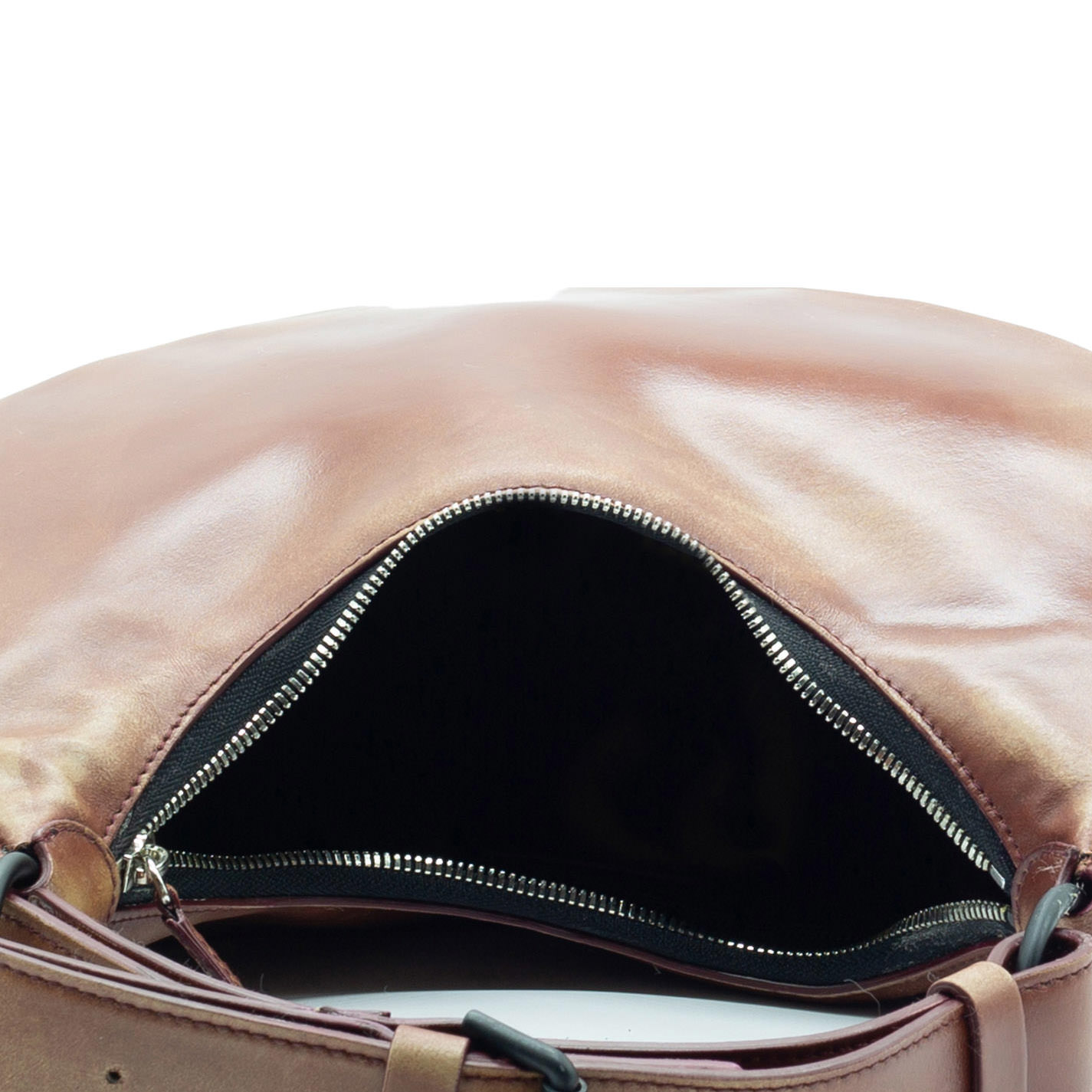 Brown vintage-effect calfskin shoulder bag, with 3D logo on the bottom. It features adjustable and removable shoulder strap, metal zip fastening, and round branded detachable coin purse with wrist strap.
