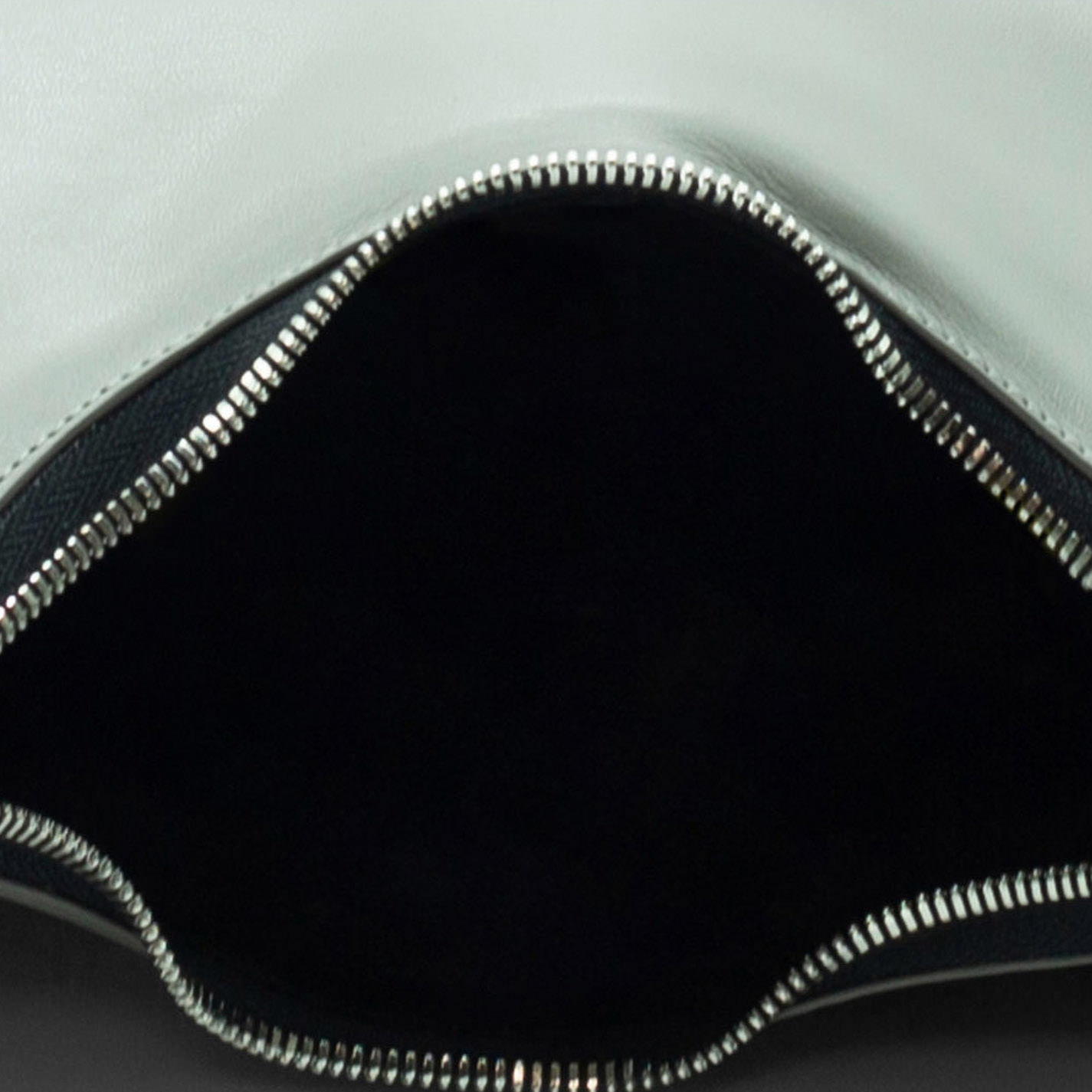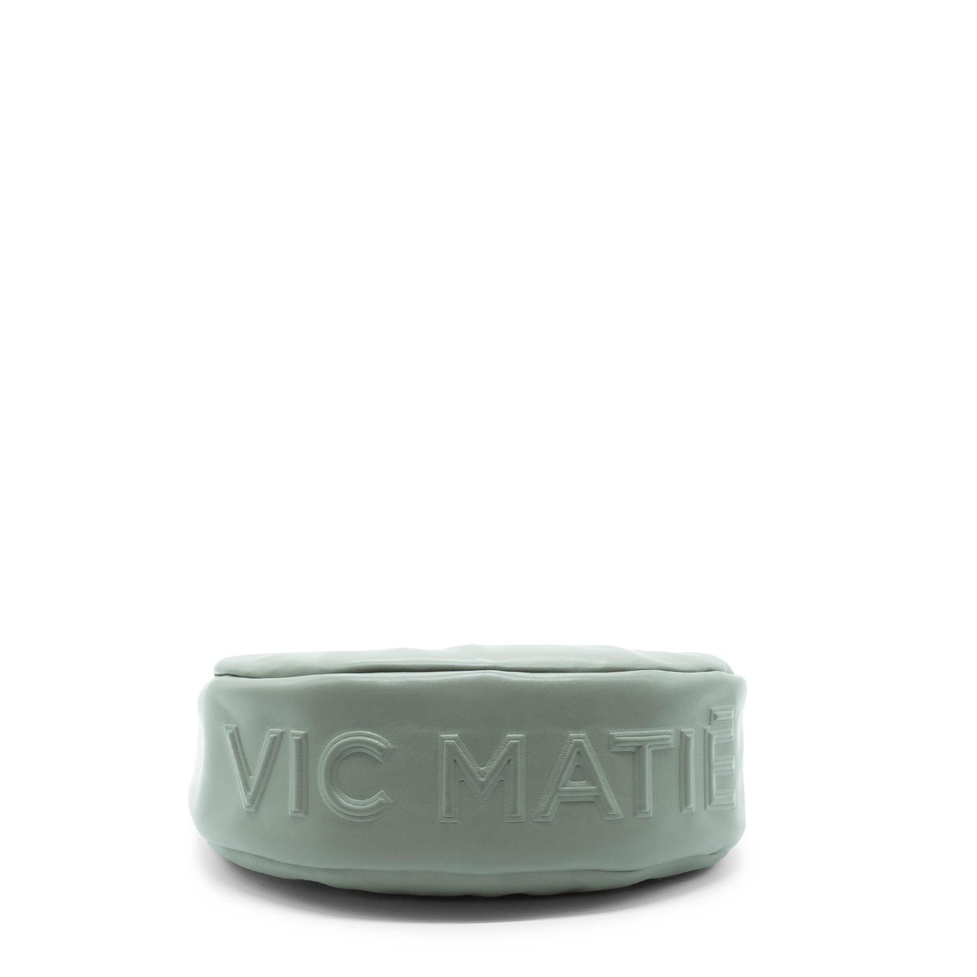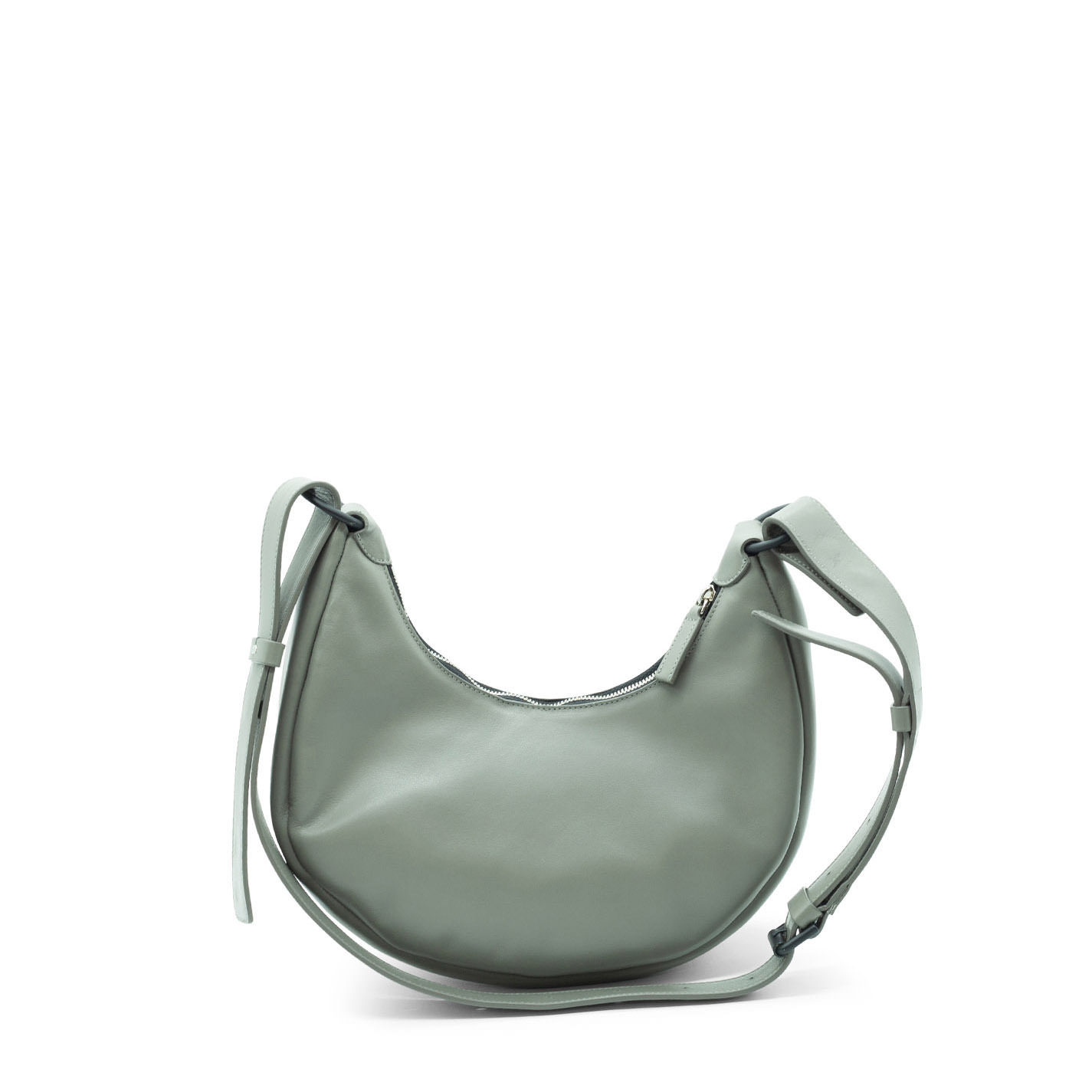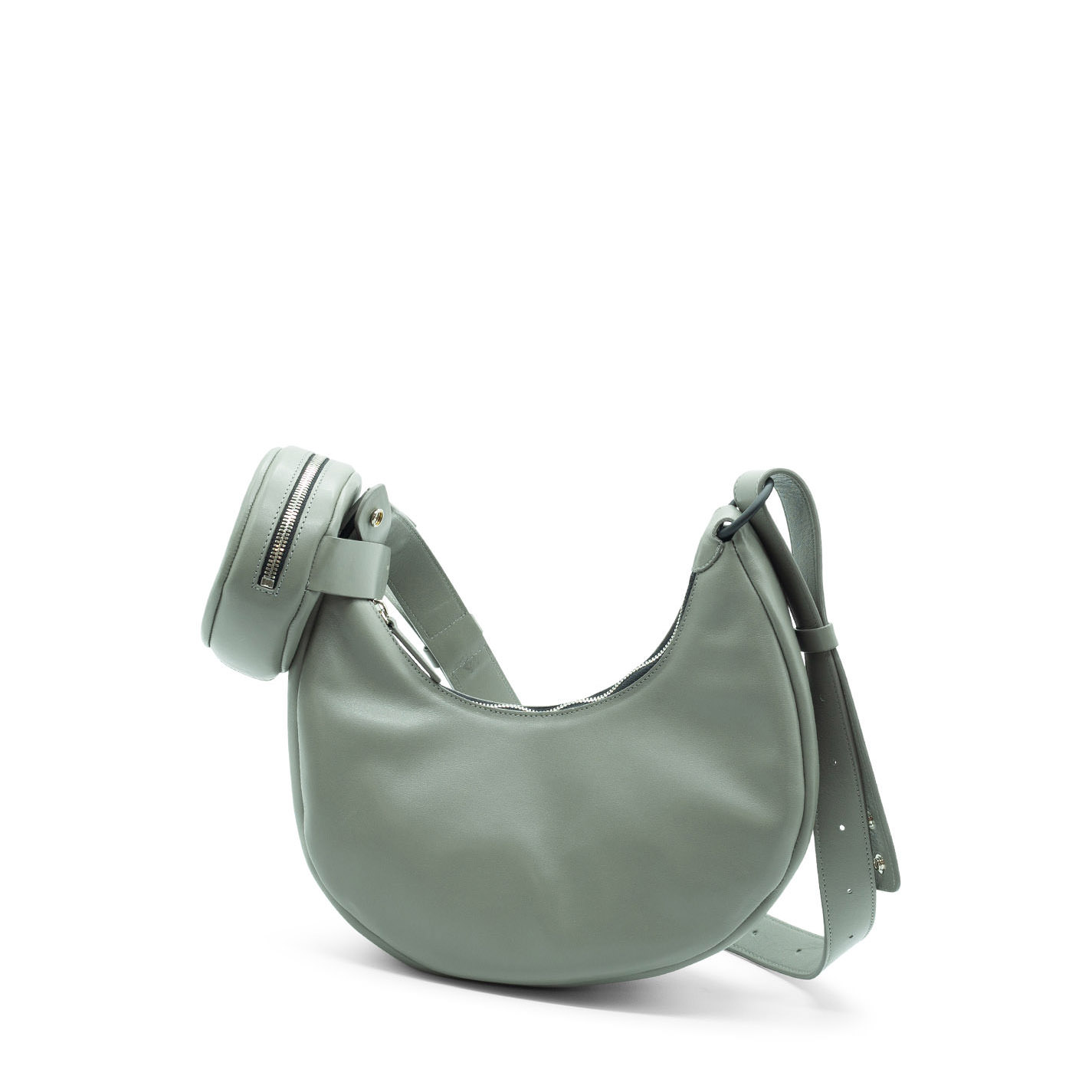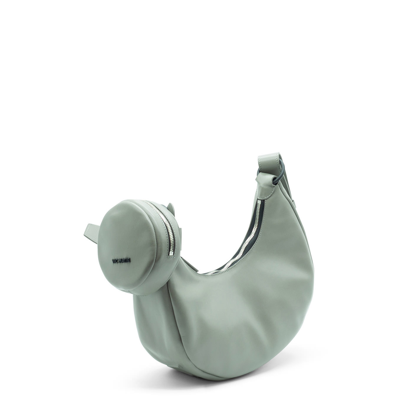 Grey shoulder bag, crafted from textured smooth calfskin, with 3D logo on the bottom. It features adjustable and removable shoulder strap, metal zip fastening, and round branded detachable coin purse with wrist strap.