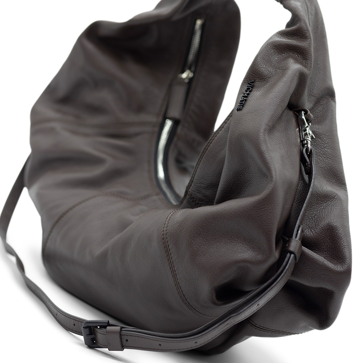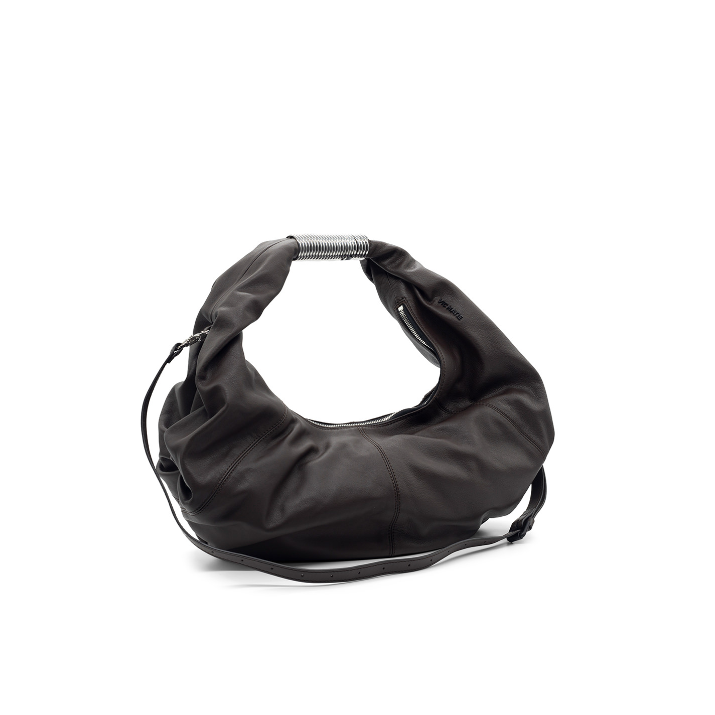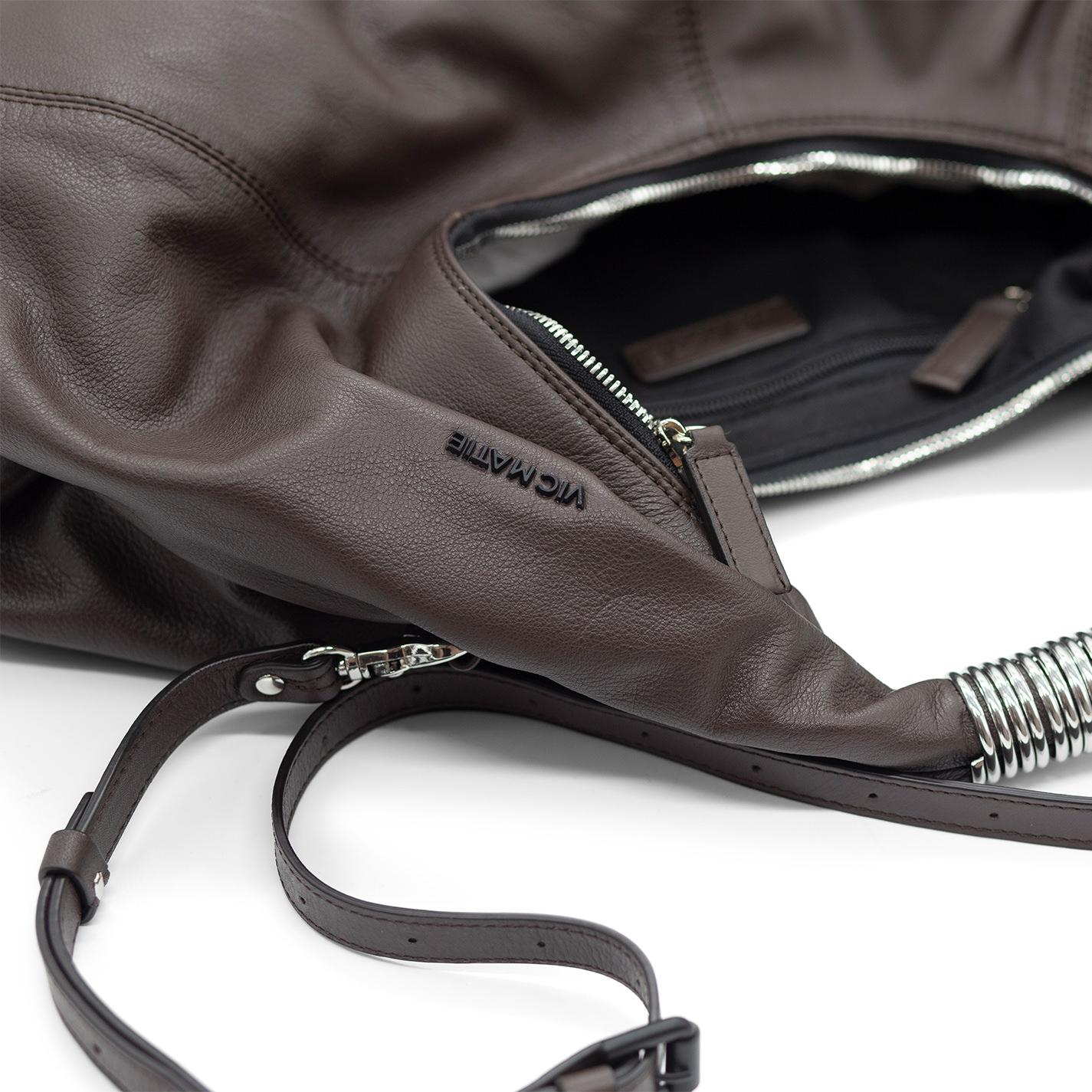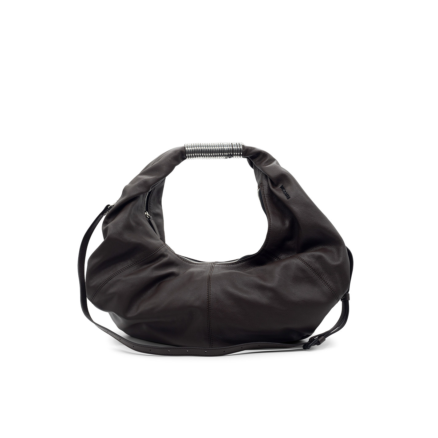 Dark brown hobo bag in soft calf nappa with flexible spring handle, metal zip closure and side logo. Leather shoulder strap included.