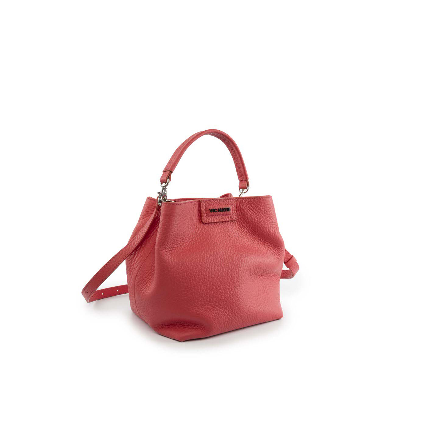 Hibiscus shoulder bucket bag in coarse-grained calfskin, with two handles: one with tone-on-tone spheres and another removable leather one. Magnet and press-stud fastening, and adjustable leather shoulder strap. Embellished with metal logo on the front.