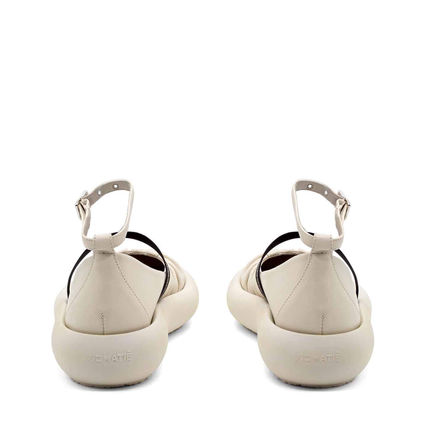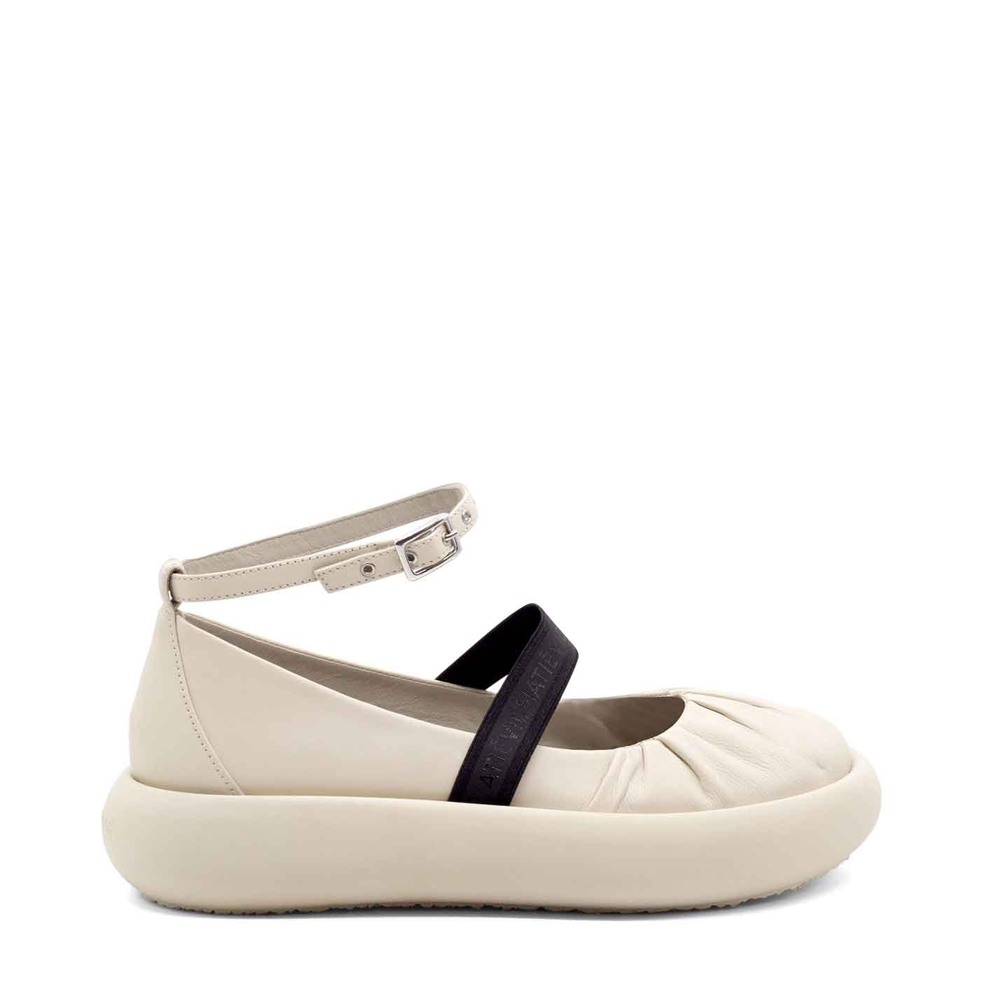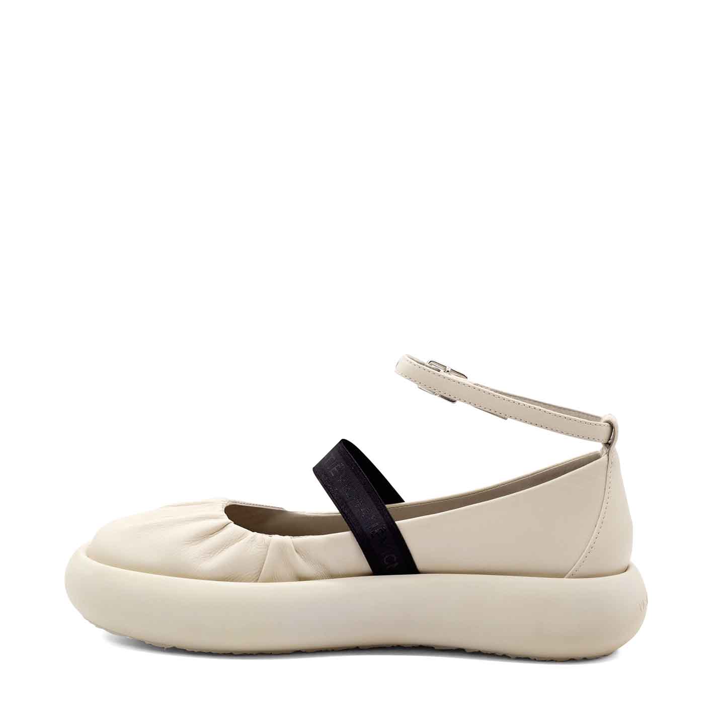 Ivory-white Donut ballerina flats in soft in soft nappa calfskin, with gathered toe detail, adjustable and removable ankle strap, and contrasting branded elastic band. Light, curved rubber sole and leather-covered insole. Made in Italy.