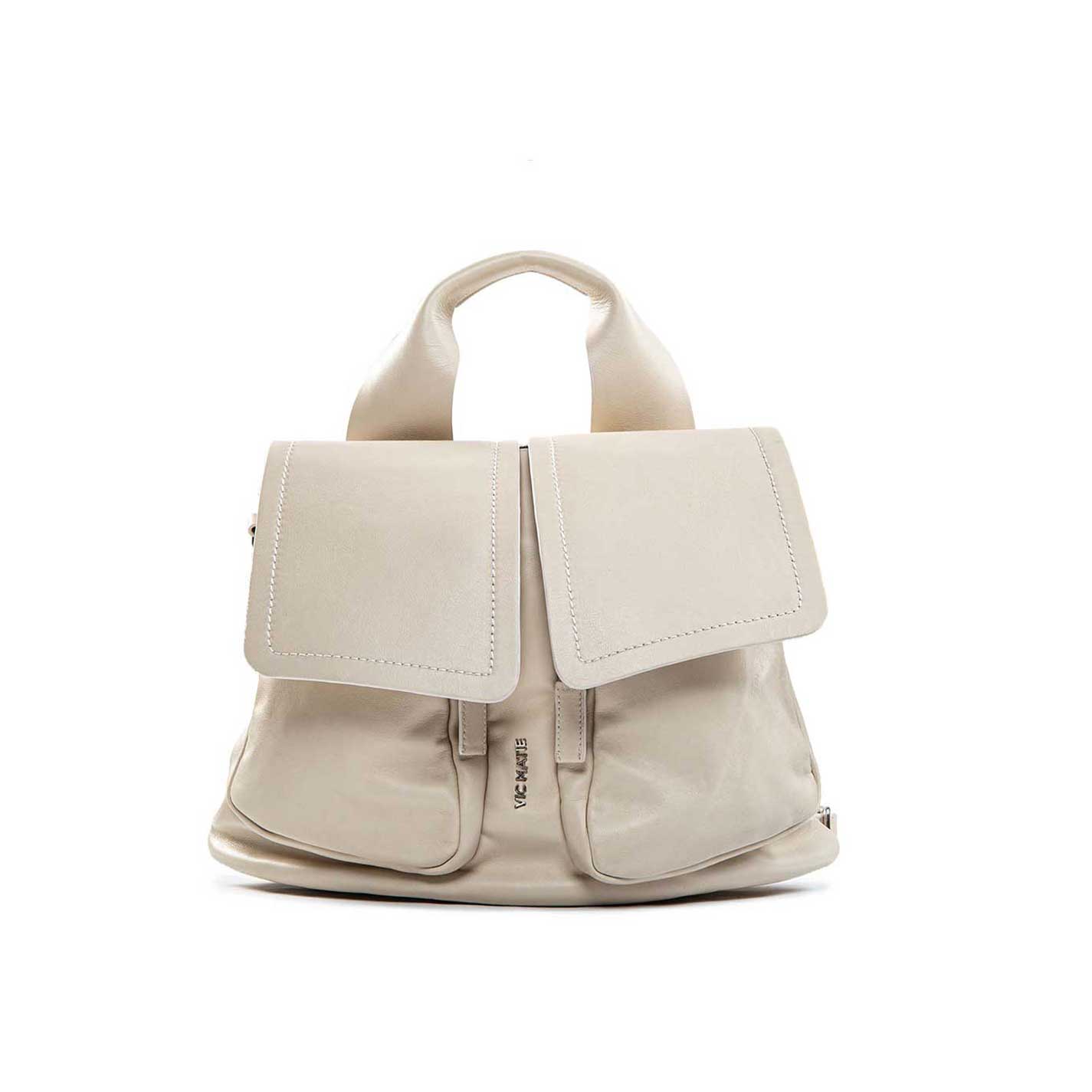 Large ivory backpack, made of soft calf leather, with top handle and shoulder strap. The strap, which acts as shoulder belt, is removable and adjustable. Coin purse charm with hook;
