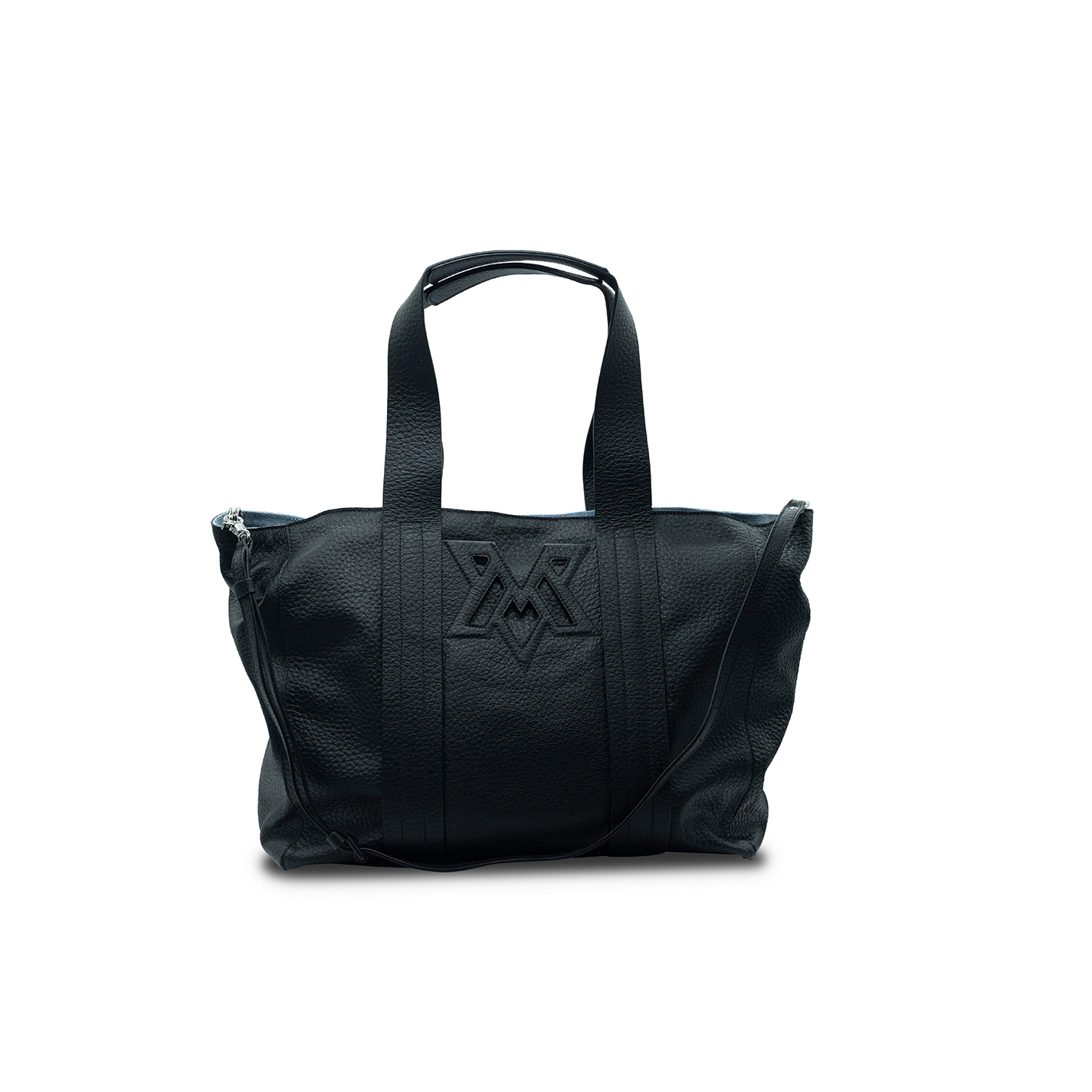 Black maxi reverse double shoppermade of large grain calfskin, fully lined in denim inside for reversible use as a second bag. Embroidered logo, interchangeable leather shoulder strap.