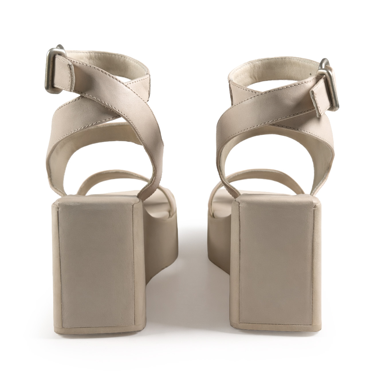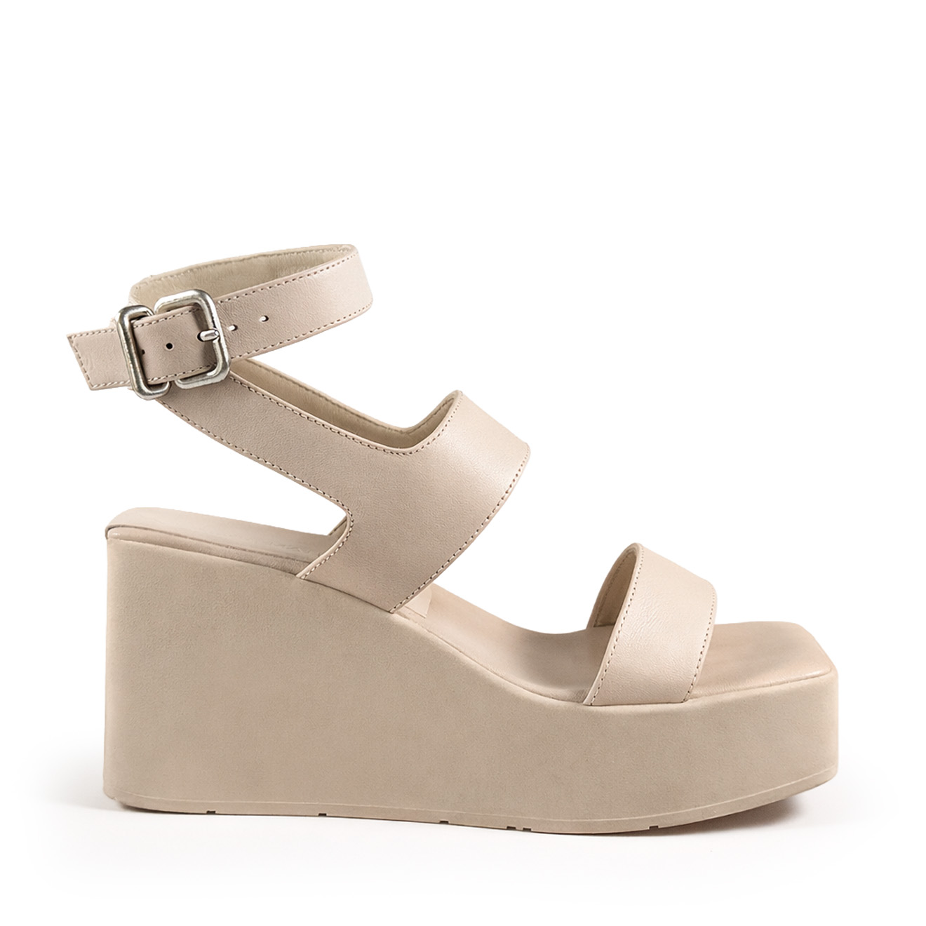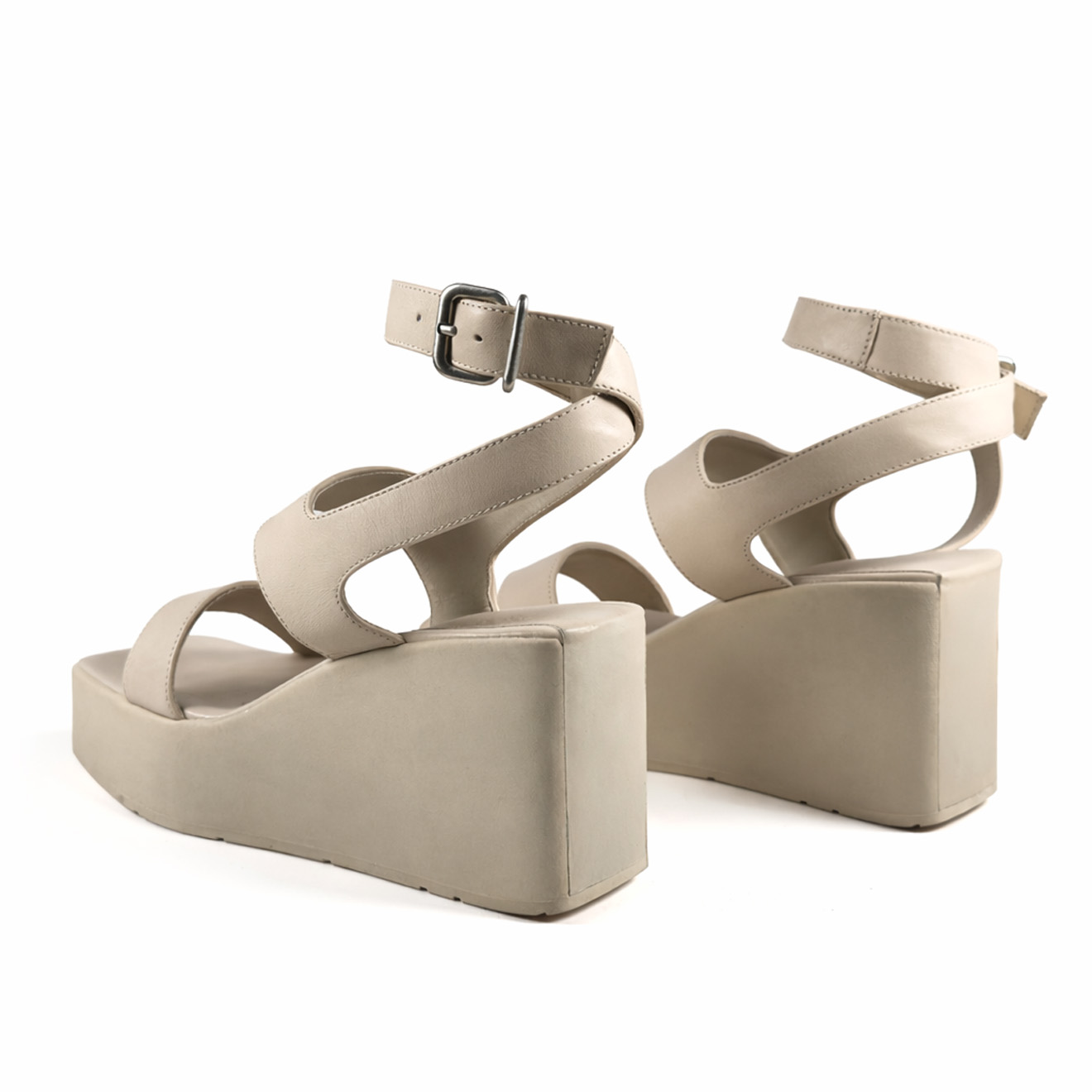 K10_Block_Wedge sandal bone with strap, made of smooth leather with a double band: a stable front band and an upper band with adjustable buckle strap for a secure, personalized fit. Fully leather-lined anatomical footbed and a lightweight, stable rubber wedge, with no visible stitching for a clean and refined effect. Ideal for casual or semi-formal summer looks, combining comfort, style and artisanal care.