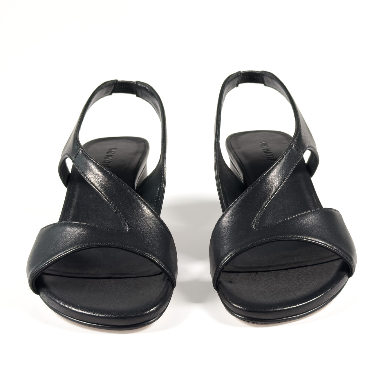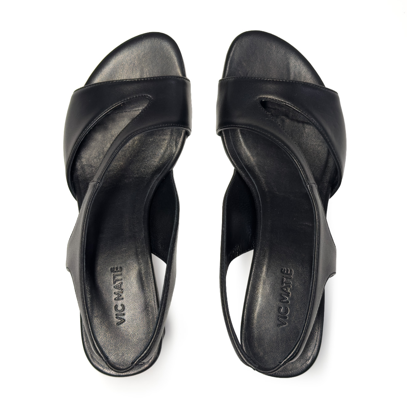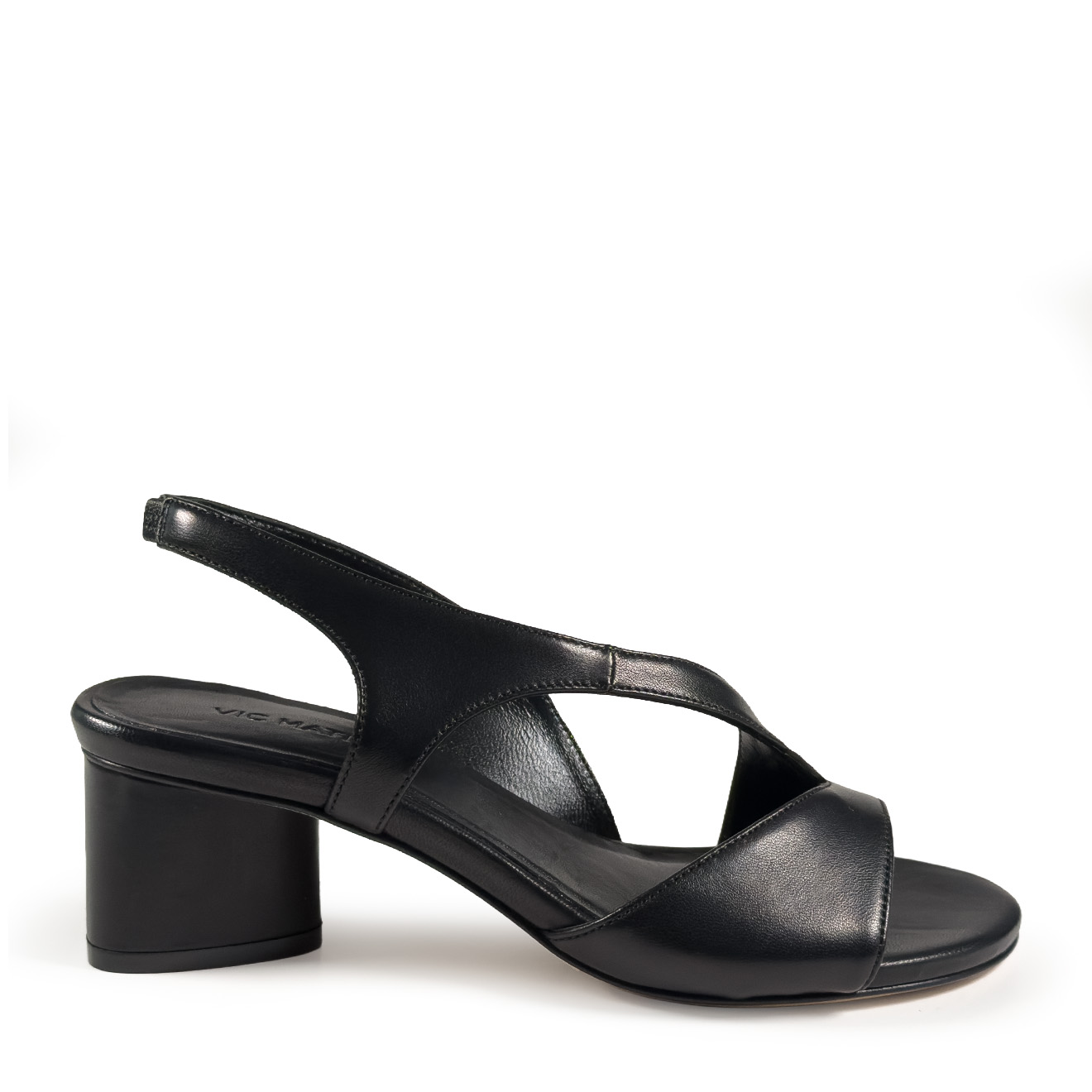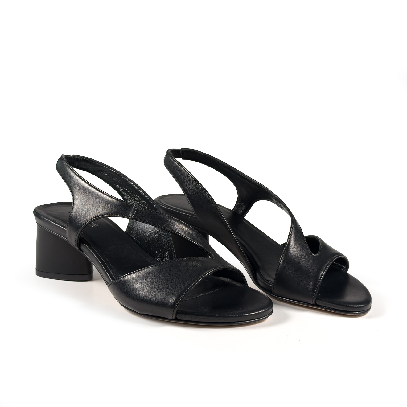 K16_Drop_Sandal in black nappa, in smooth leather with an essential design and crossed lines on the front. The back strap ensures a stable fit, while the medium block heel provides comfort and balance. A clean and contemporary model, ideal for refined summer looks and everyday outfits with a minimal taste.