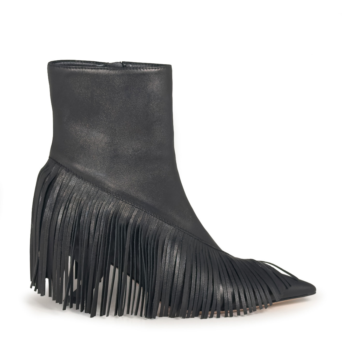 K18_Apostrophe_Ankle boot black, in soft nappa leather with diagonal fringes wrapping the upper, creating movement and character. Inner zip closure for an easy fit, while the leather-covered heel with a sculptural apostrophe-inspired shape elongates the design. Finished with a leather sole and Made in Italy artisanal workmanship. A bold and contemporary model, perfect for decisive looks with a sophisticated taste.