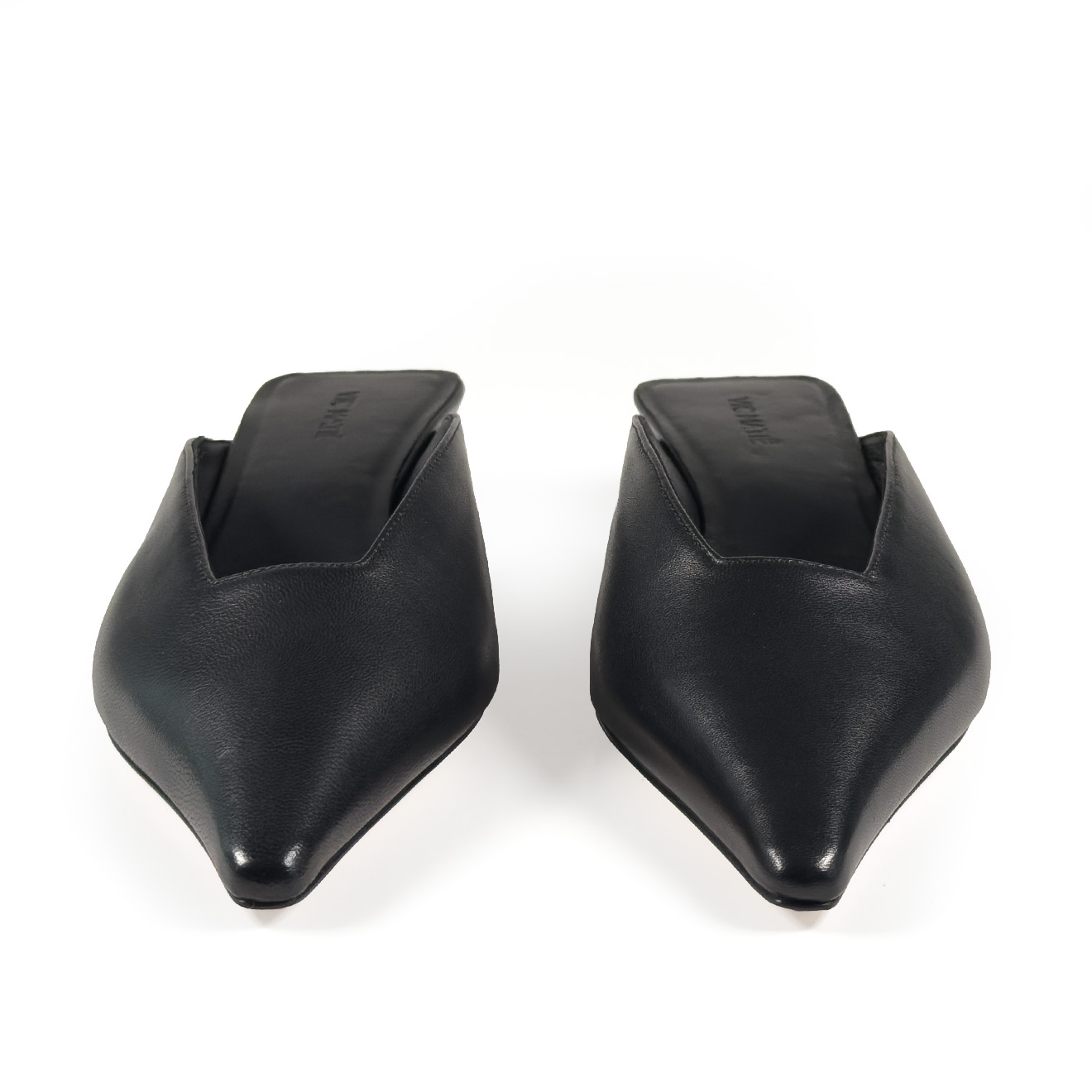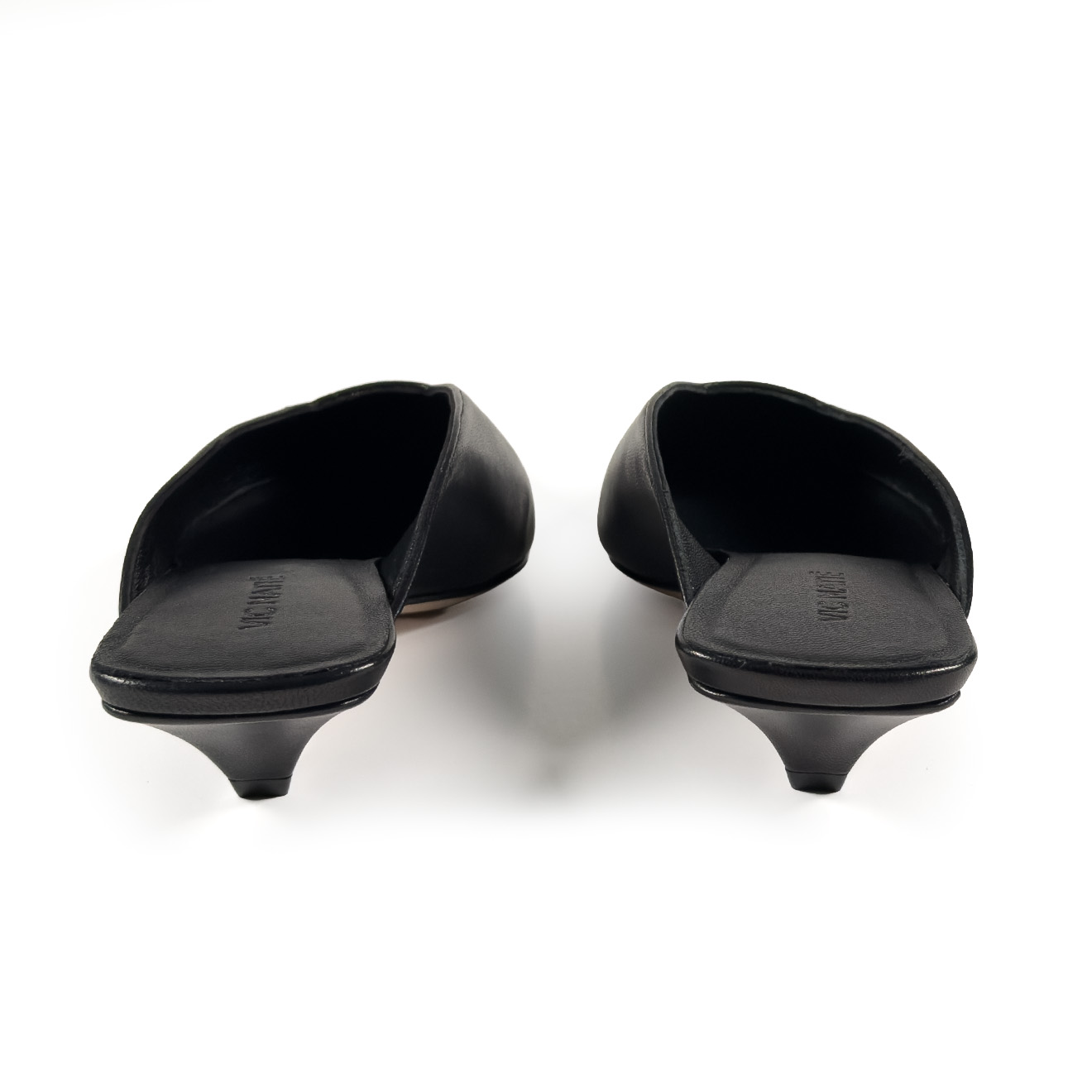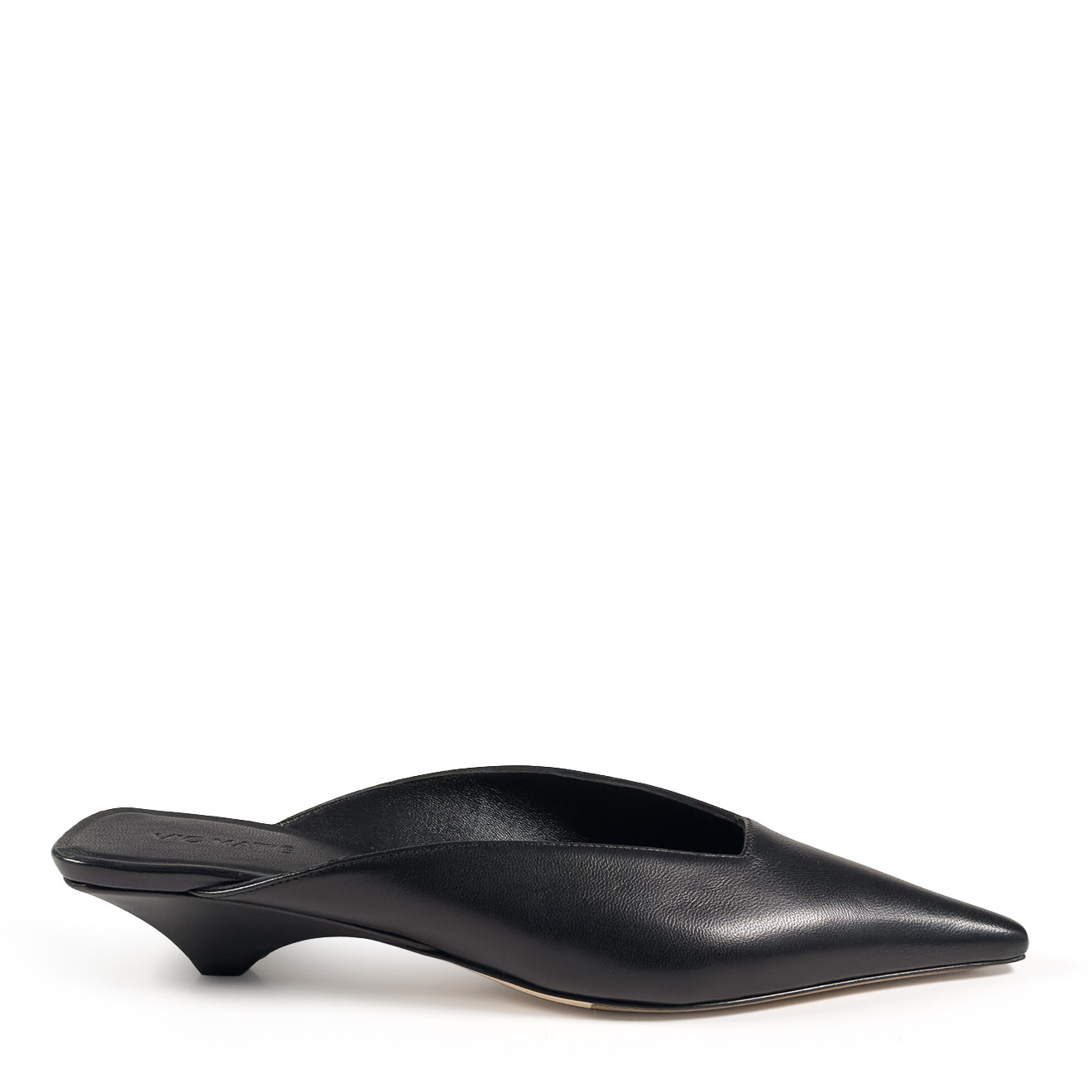 K20_Kitty_Mule black, made of soft nappa leather with a tapered, minimalist line. The clean upper wraps the foot with elegance, while the low heel, leather-covered and slightly flared, ensures stability and a modern profile. Leather sole for a Made in Italy artisanal finish. A refined and versatile model, perfect to complete contemporary looks with simplicity and character.