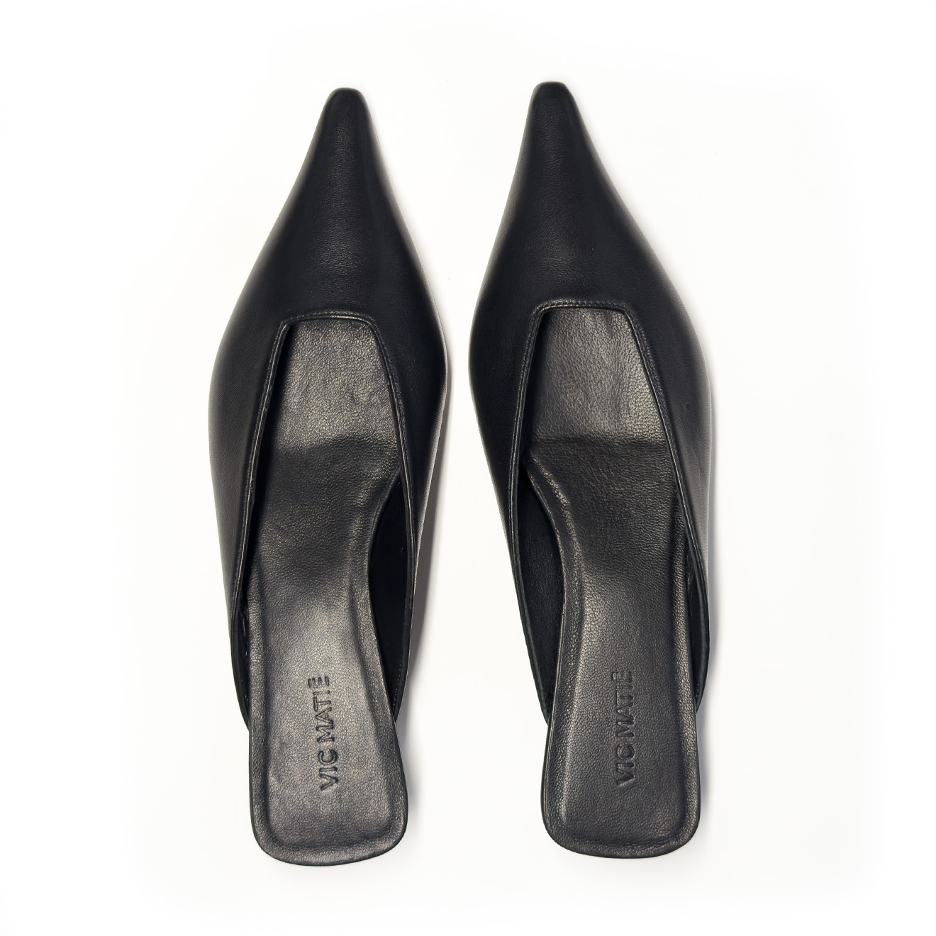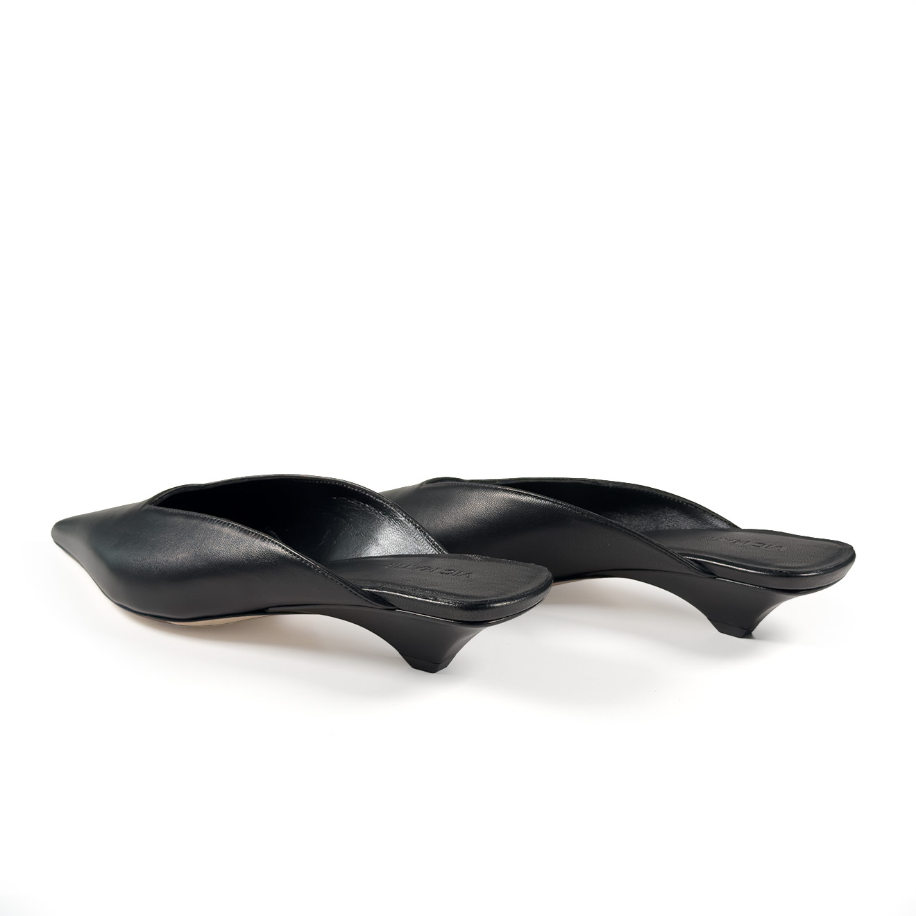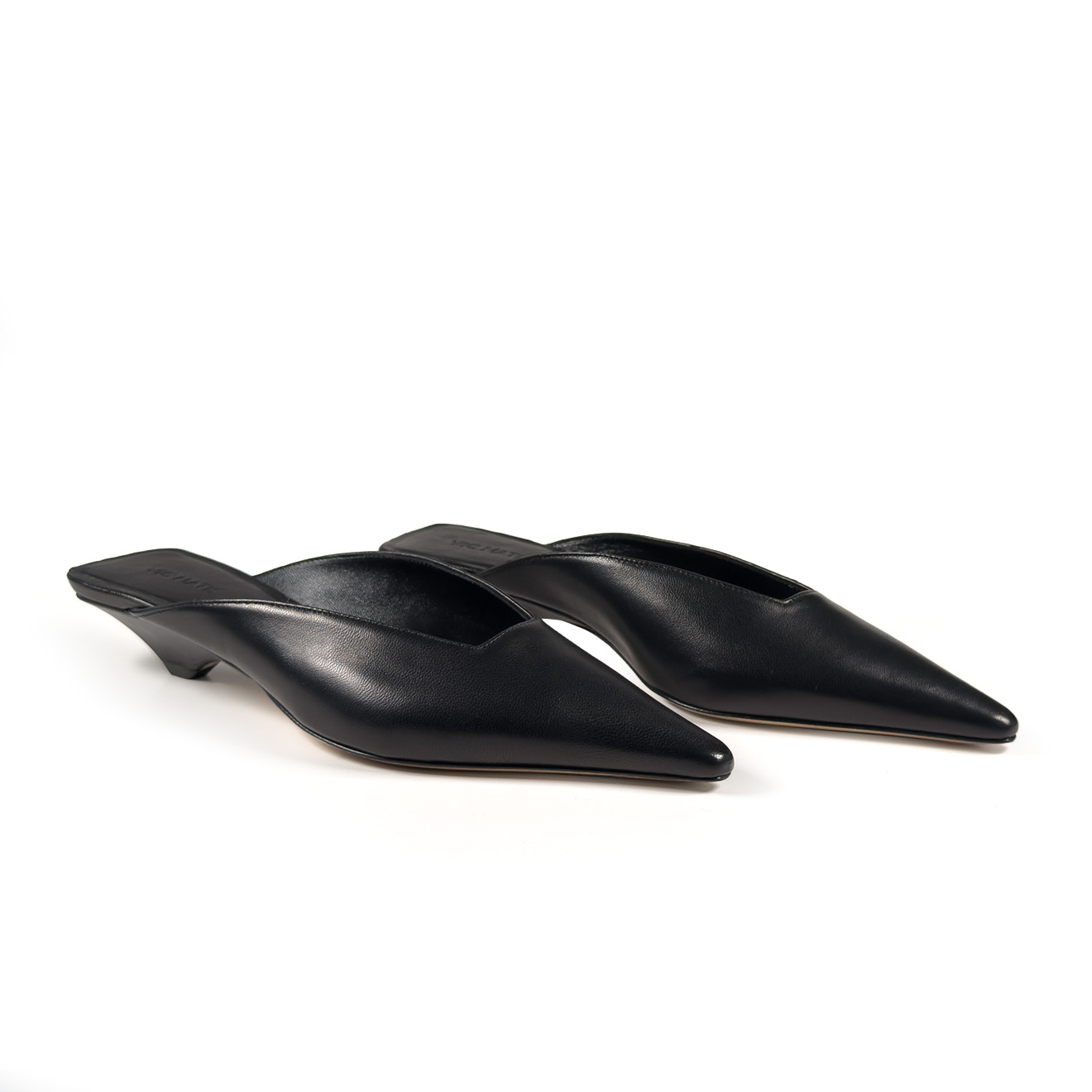 K20_Kitty_Mule black, made of soft nappa leather with a tapered, minimalist line. The clean upper wraps the foot with elegance, while the low heel, leather-covered and slightly flared, ensures stability and a modern profile. Leather sole for a Made in Italy artisanal finish. A refined and versatile model, perfect to complete contemporary looks with simplicity and character.