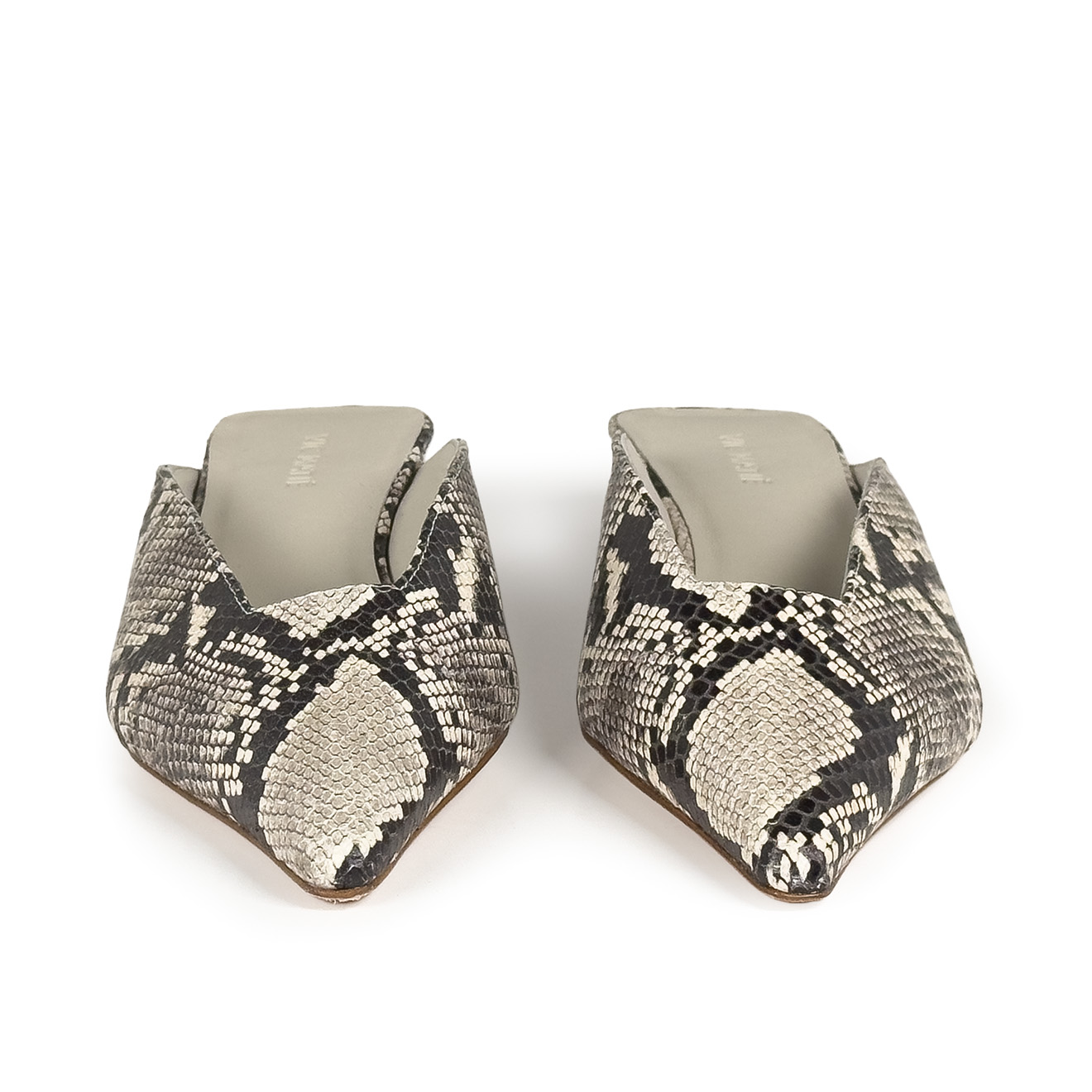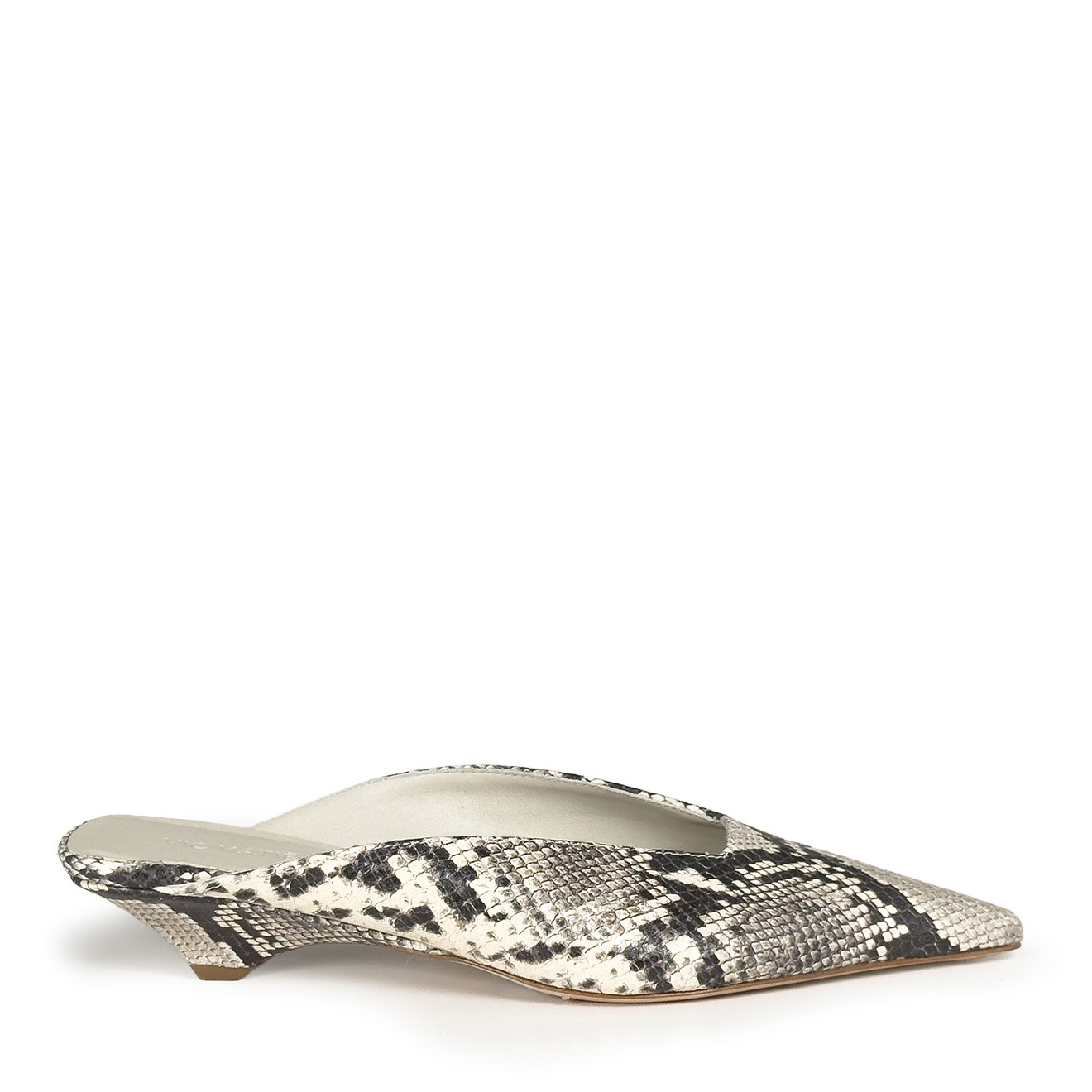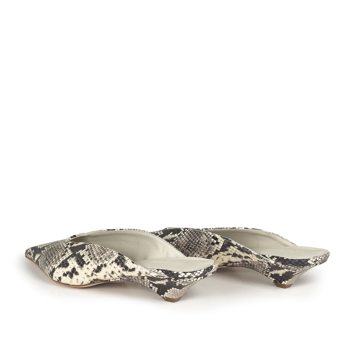 K20_Kitty_Mule ice, made of python-effect printed leather with a tapered, minimalist line. The clean upper wraps the foot with elegance, while the low heel, leather-covered and slightly flared, ensures stability and a modern profile. Leather sole for a Made in Italy artisanal finish. A refined and versatile model, perfect to complete contemporary looks with simplicity and character.
