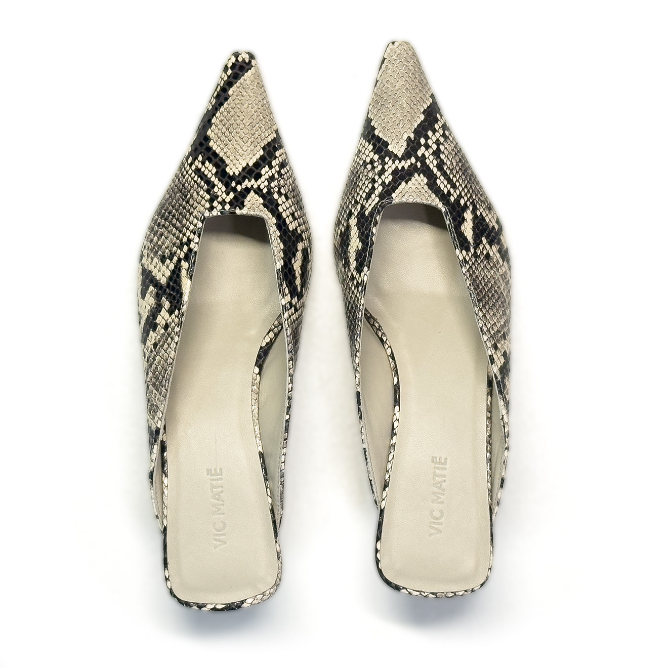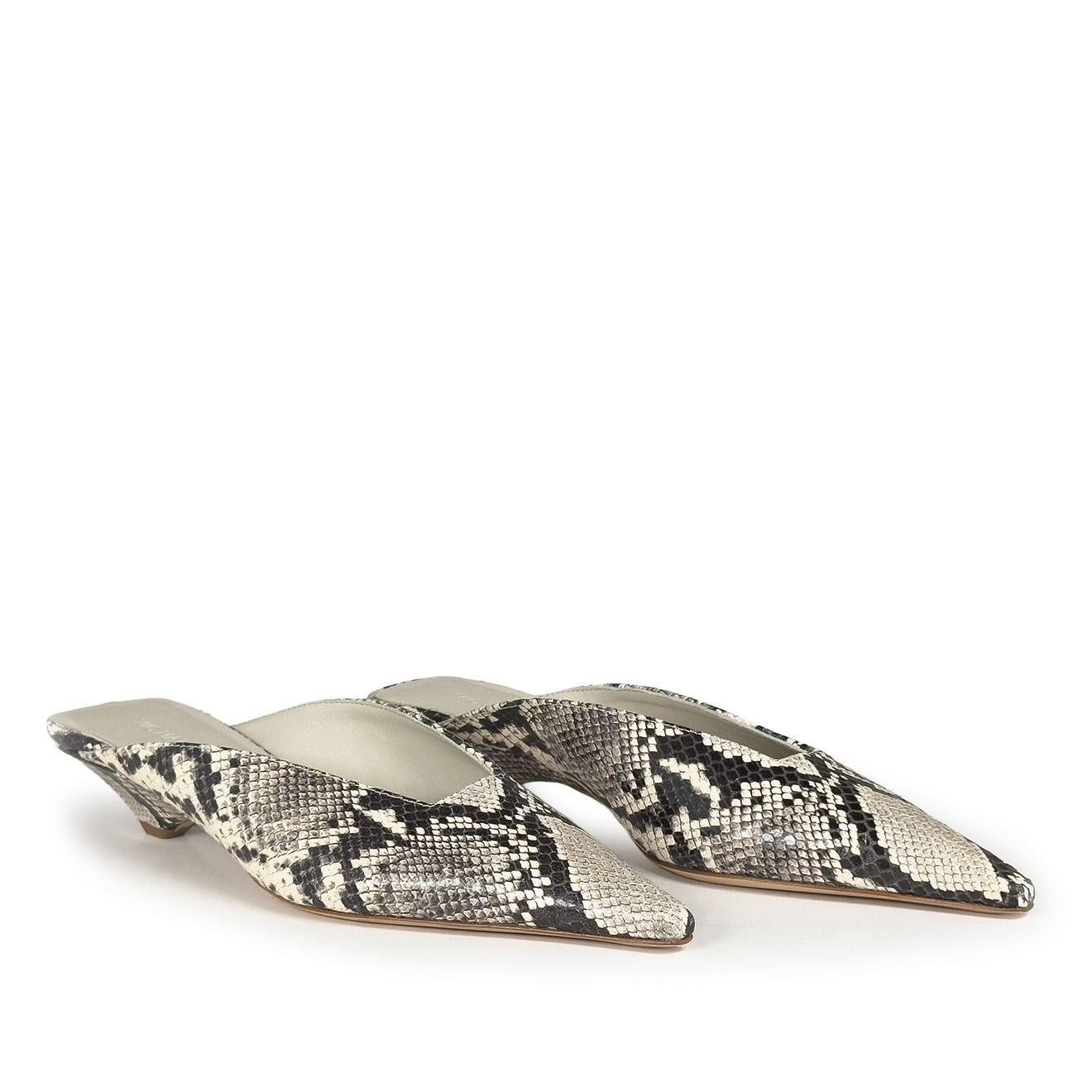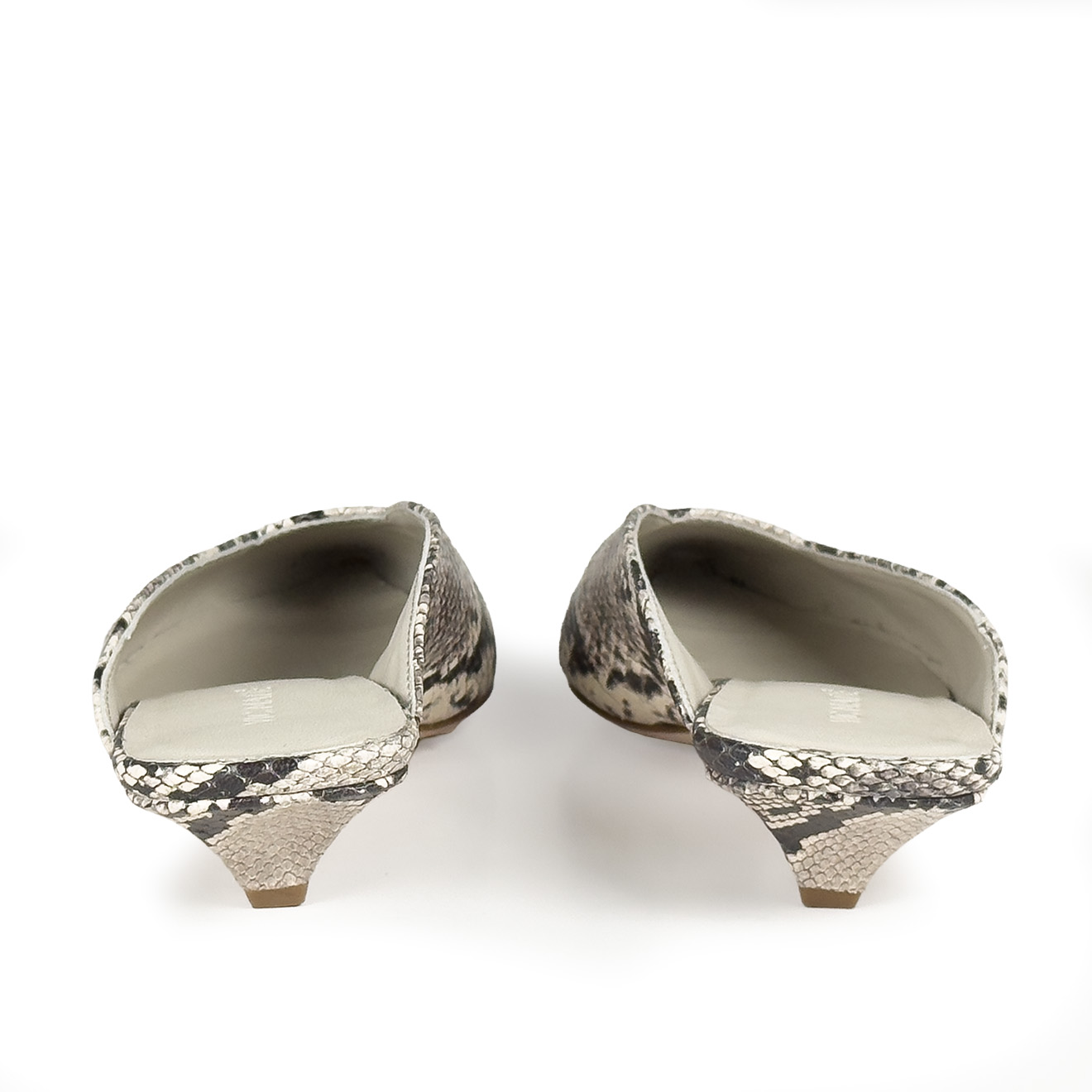 K20_Kitty_Mule ice, made of python-effect printed leather with a tapered, minimalist line. The clean upper wraps the foot with elegance, while the low heel, leather-covered and slightly flared, ensures stability and a modern profile. Leather sole for a Made in Italy artisanal finish. A refined and versatile model, perfect to complete contemporary looks with simplicity and character.