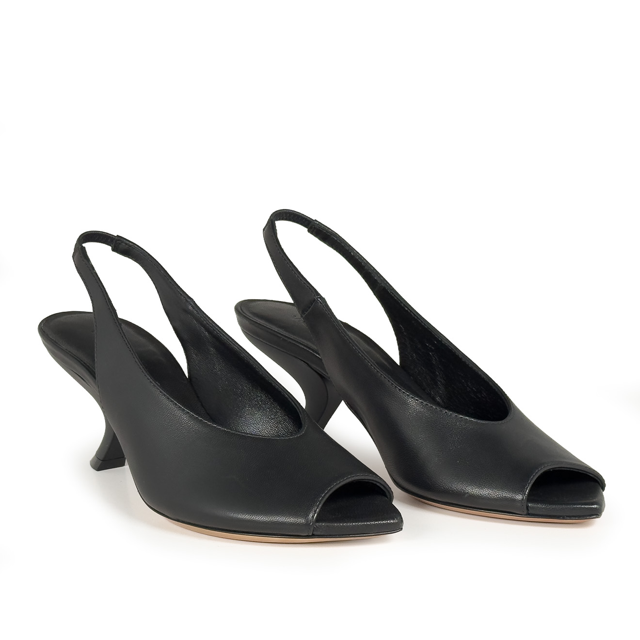 K24_Apostrophe_Slingback pumps black, made of soft nappa leather with an essential and refined line, featuring an elastic strap that wraps the heel ensuring a comfortable and secure fit. Heel fully leather-covered tone on tone and leather sole, expression of authentic Made in Italy artisanal workmanship. An elegant and minimal model, perfect for those who want a sophisticated, timeless everyday style.