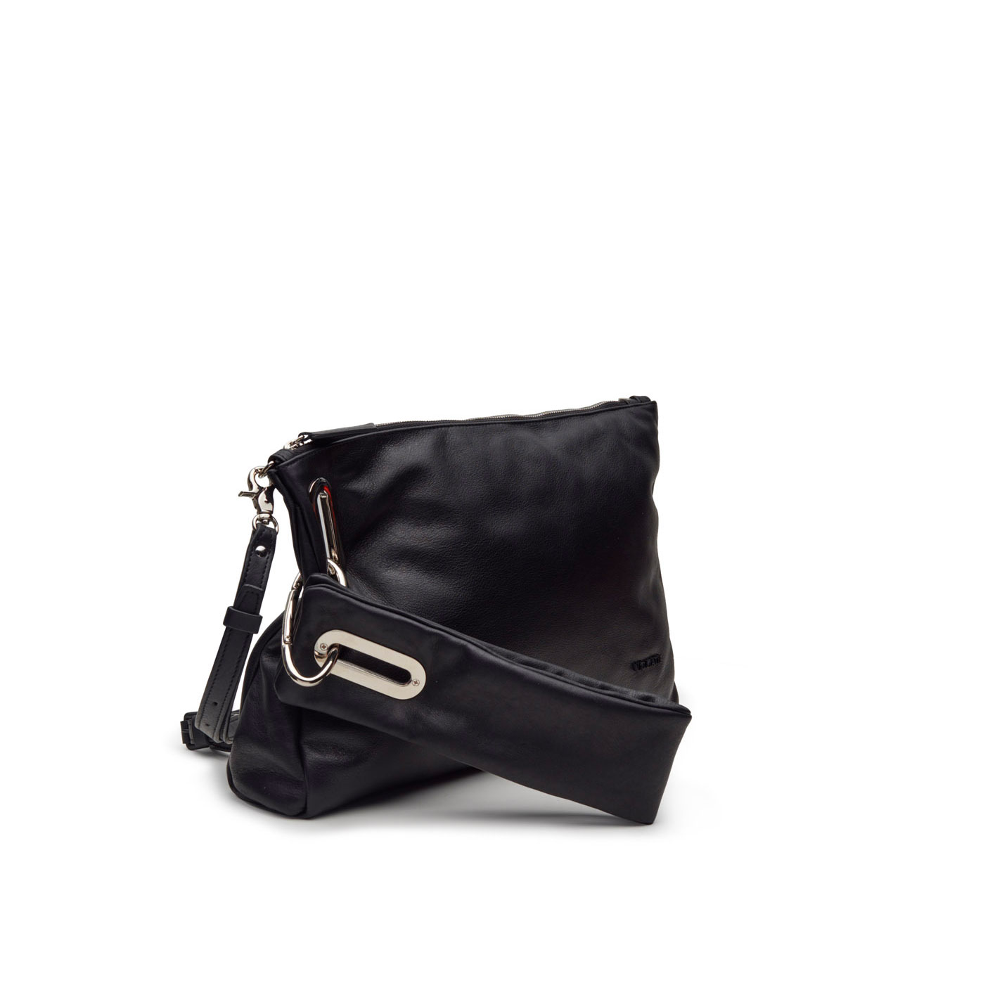 Large black clutch in soft nappa calfskin with detachable padded handle, leather shoulder strap, large eyelets and metal clasp at the side. Embellished with metal logo.