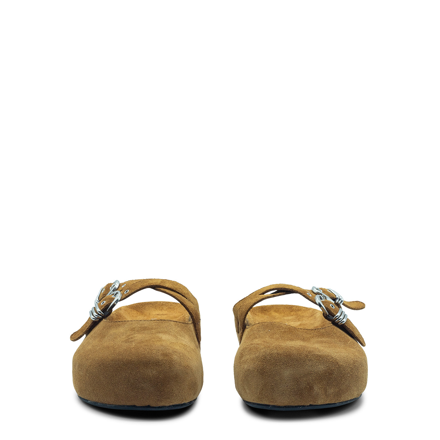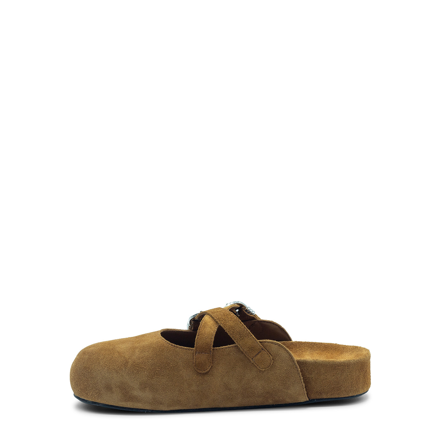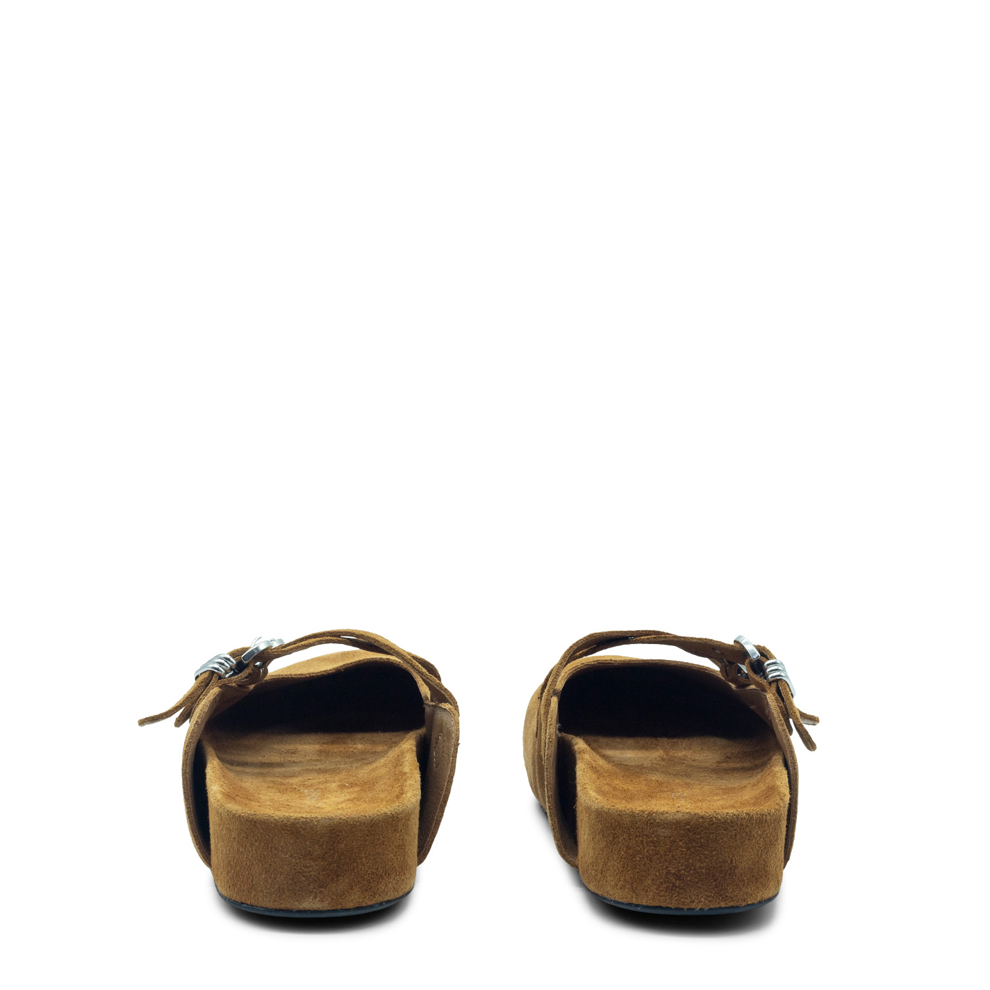 Klompen sabot in split calfskin leather, with double crossed straps on the front and enriched with adjustable buckles with metal loops. Anatomical fusbet covered with the same material as the upper. Embossed VM monogram in the center. Thin rubber sole. Made in Italy.