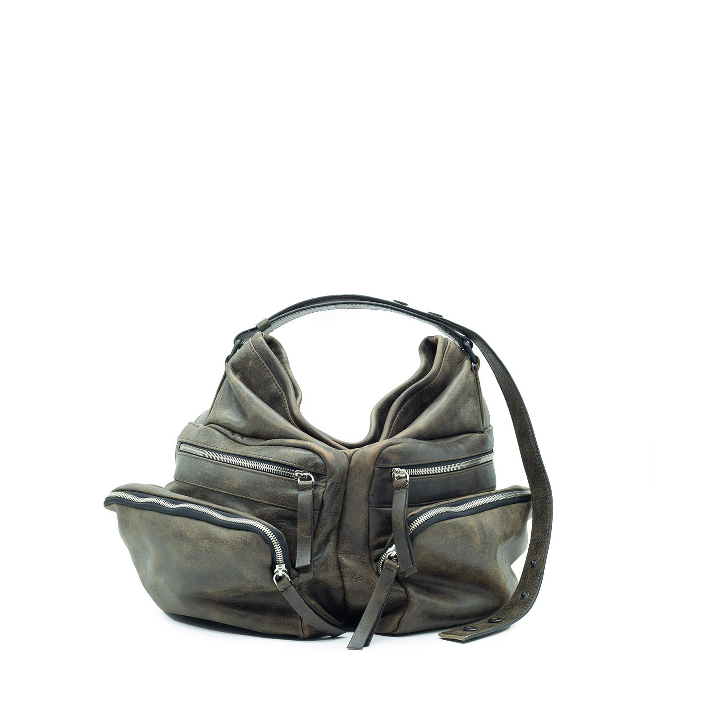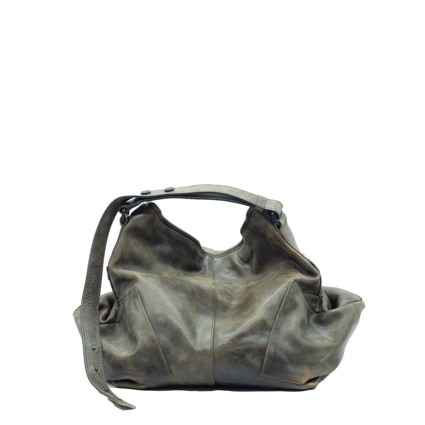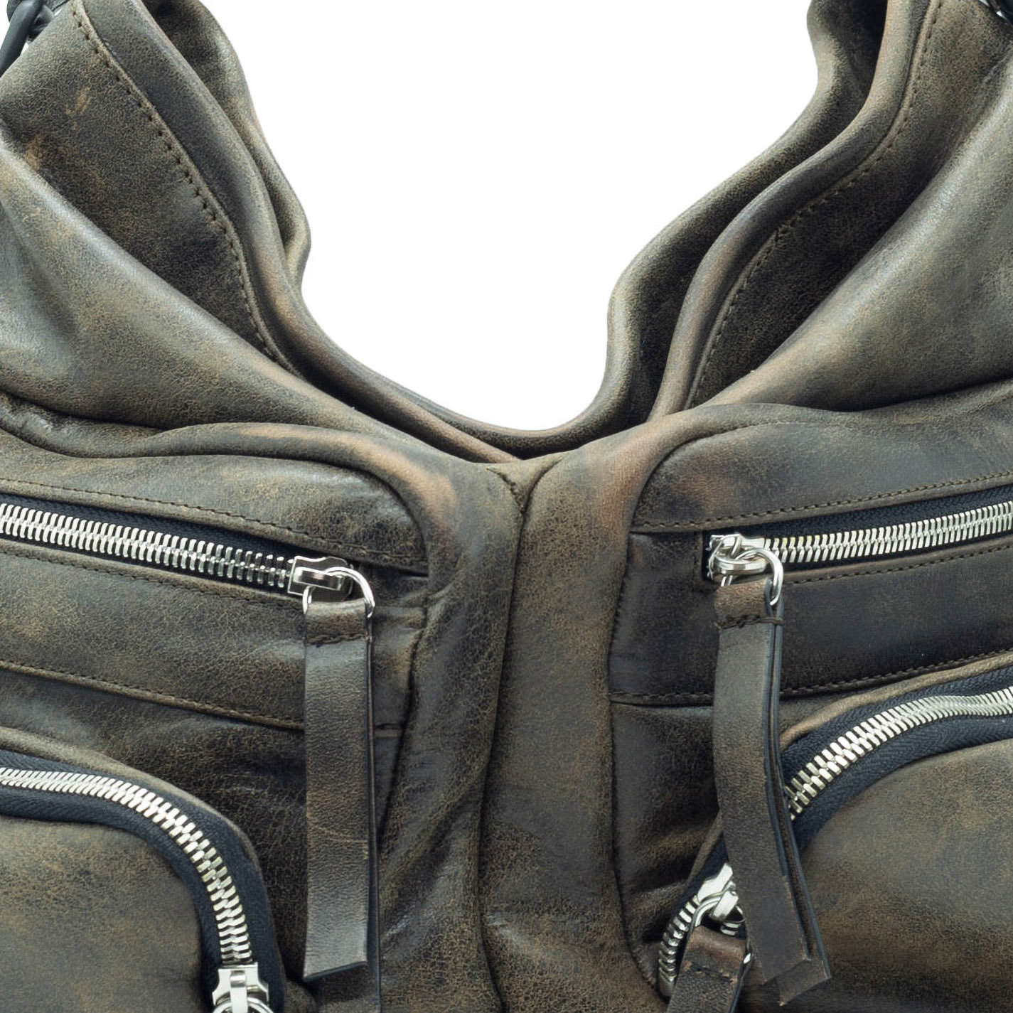 Biscuit zipped bucket bag, crafted from vintage-effect leather, with maxi front pockets, snap button fastening, and adjustable shoulder strap.