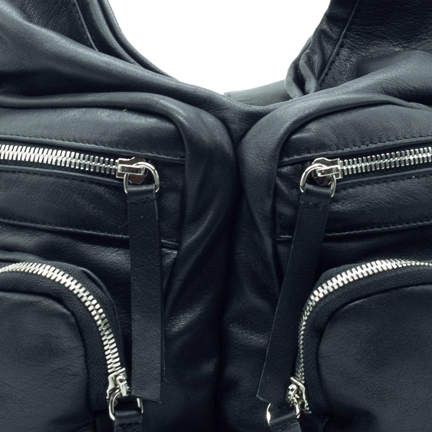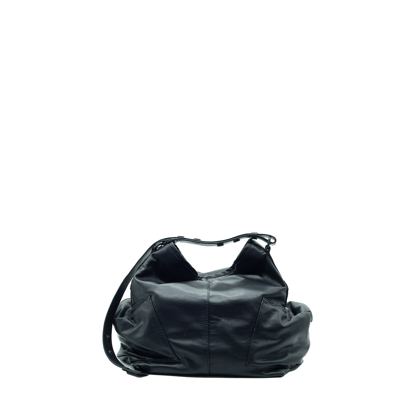 Black zipped bagin soft nappa calfskin with maxi pockets on the front. Snap closure and adjustable shoulder strap.